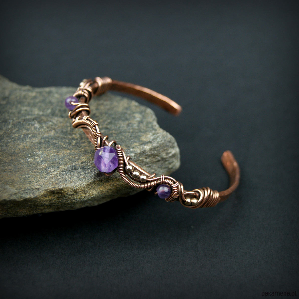 Materiał: ametyst, hematyt, miedziany drut jubilerski.