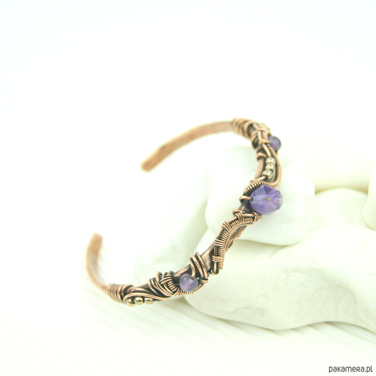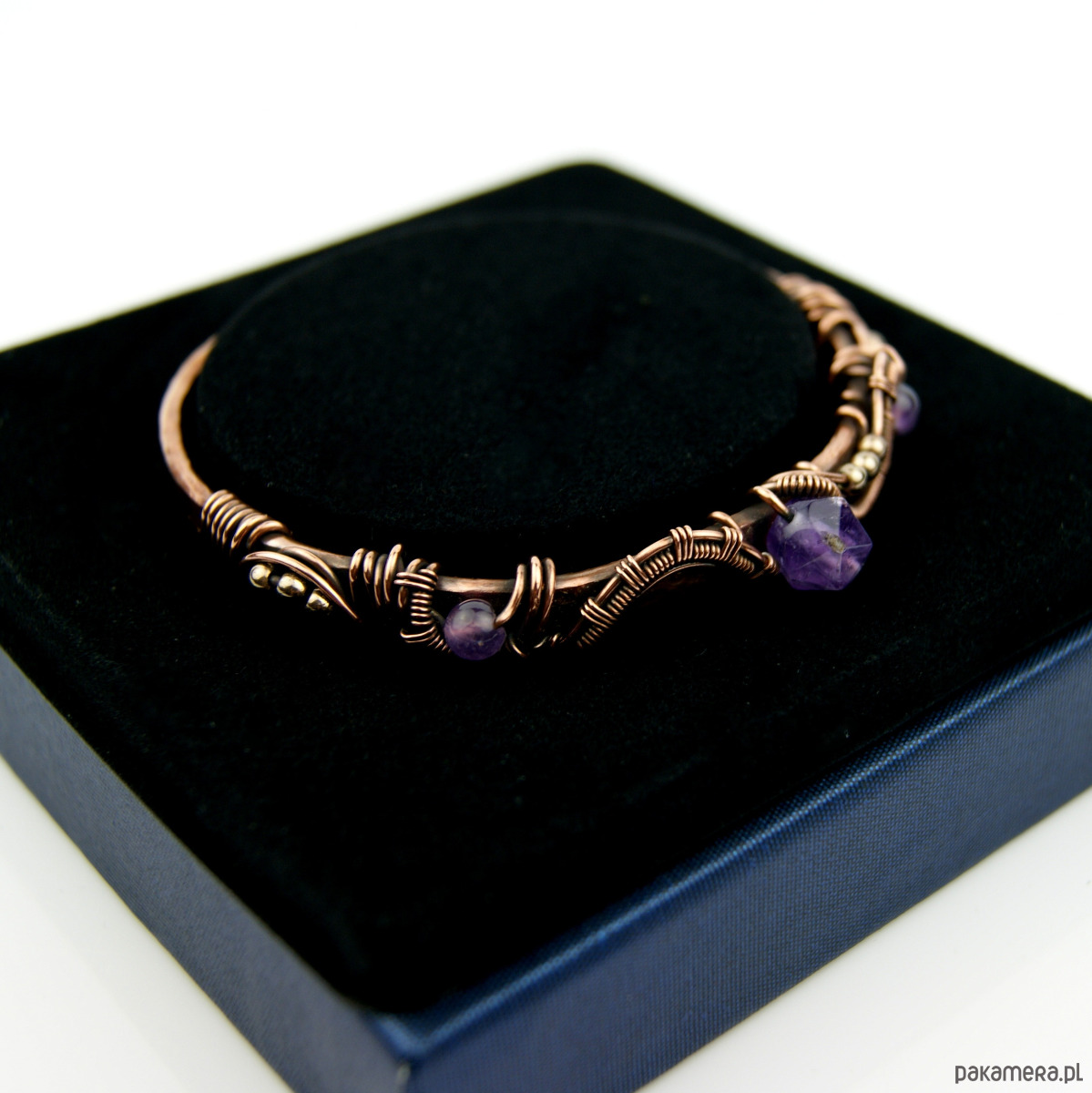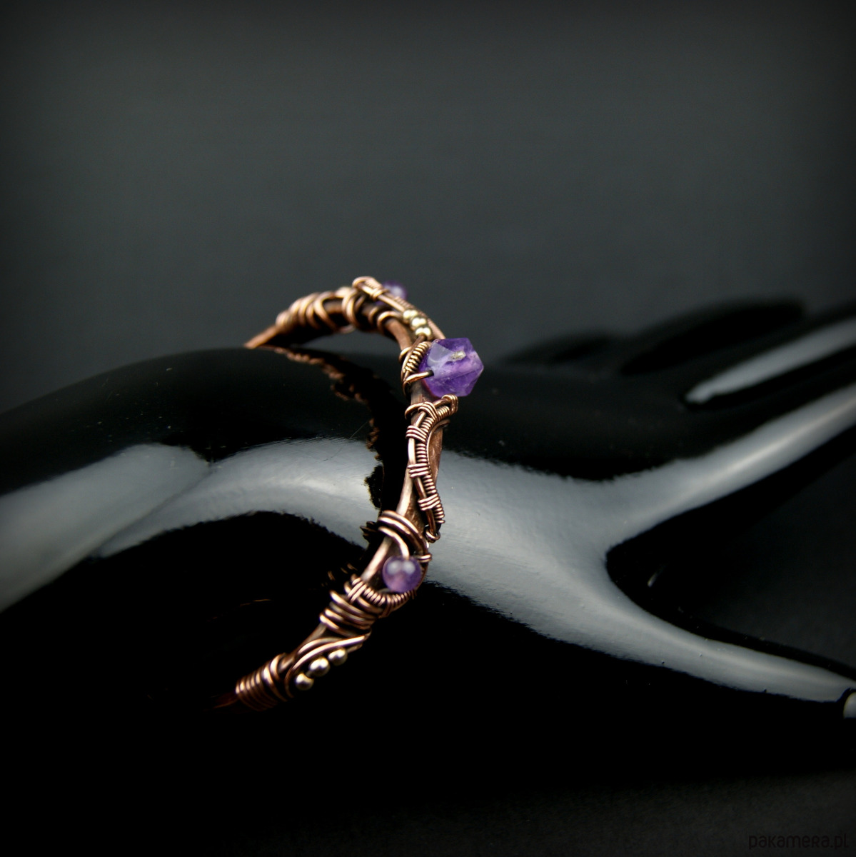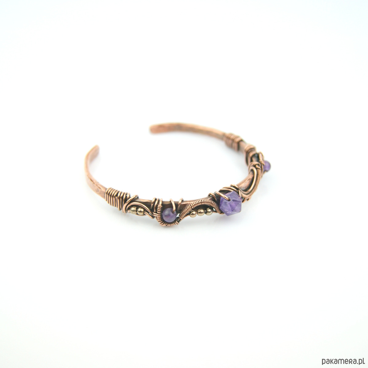 Bransoleta mankietowa (typu cuff) wykonana z fakturowanej miedzi, z misternym oplotem, w którym połyskują ametysty i złote hematyty. Średnica bransolety wynosi 5,3 cm, obwód 16,5 cm.