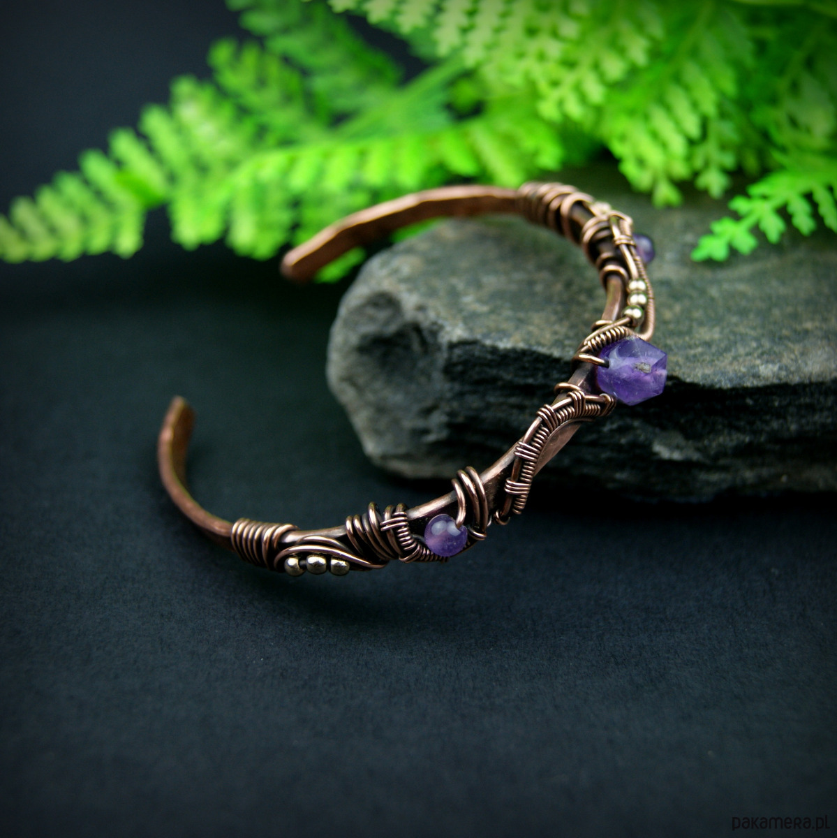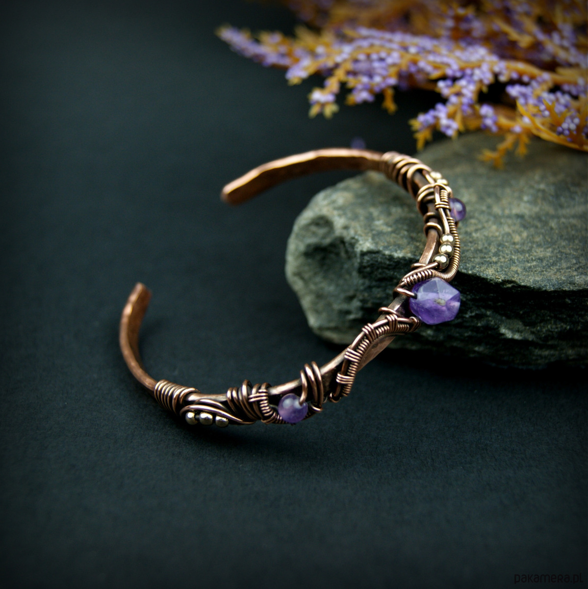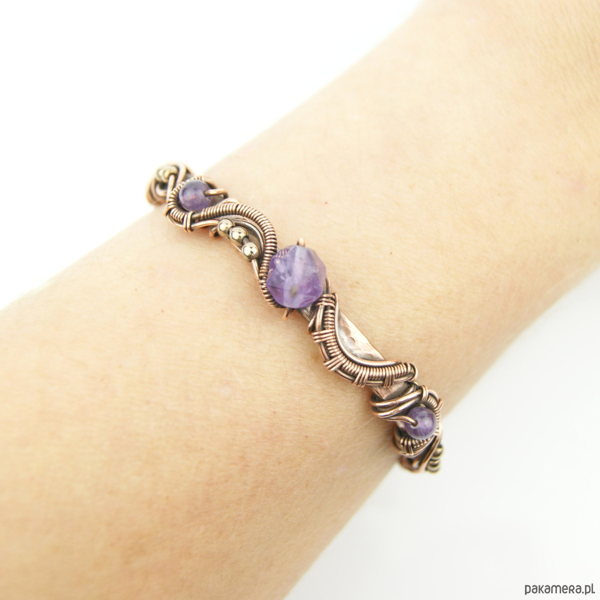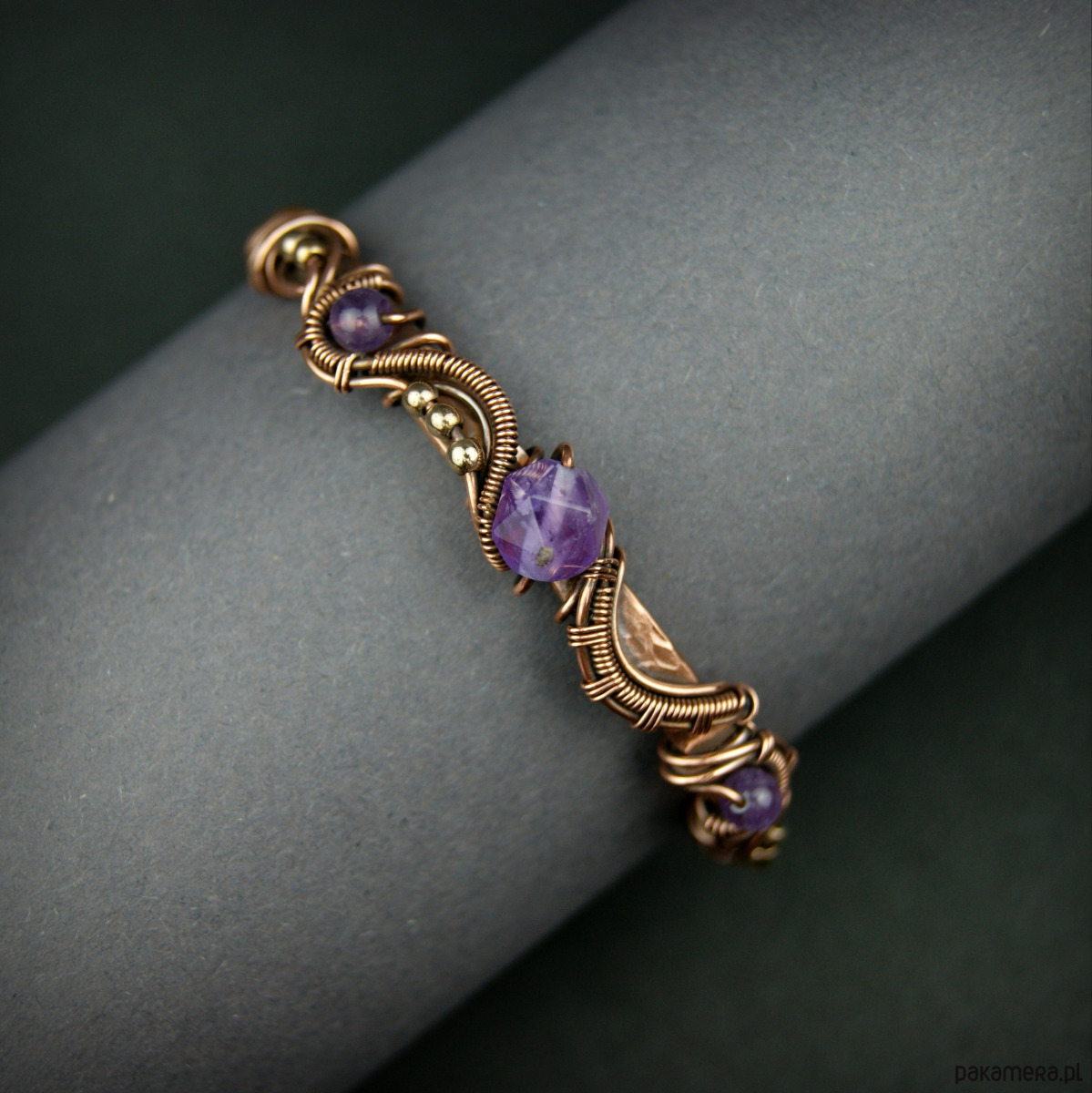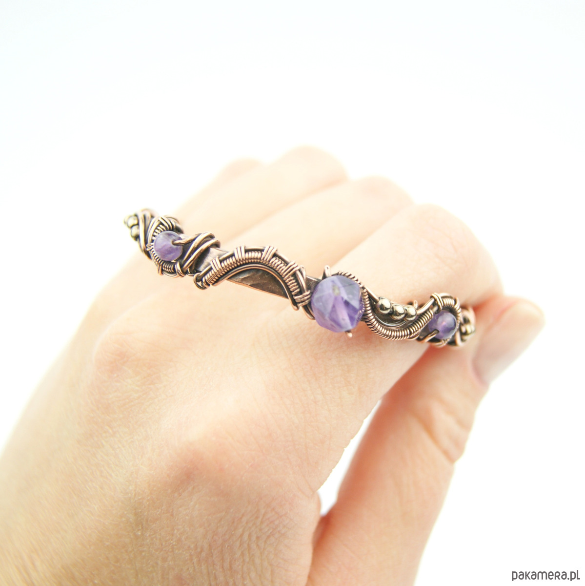 Bransoleta mankietowa (typu cuff) wykonana z fakturowanej miedzi, z misternym oplotem, w którym połyskują ametysty i złote hematyty. Średnica bransolety wynosi 5,3 cm, obwód 16,5 cm.