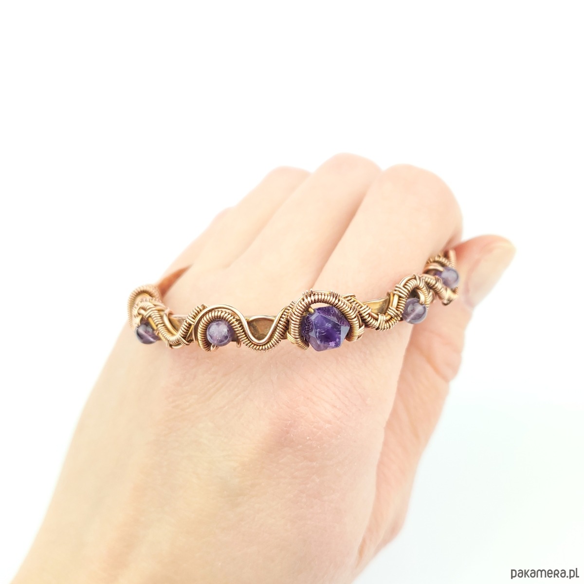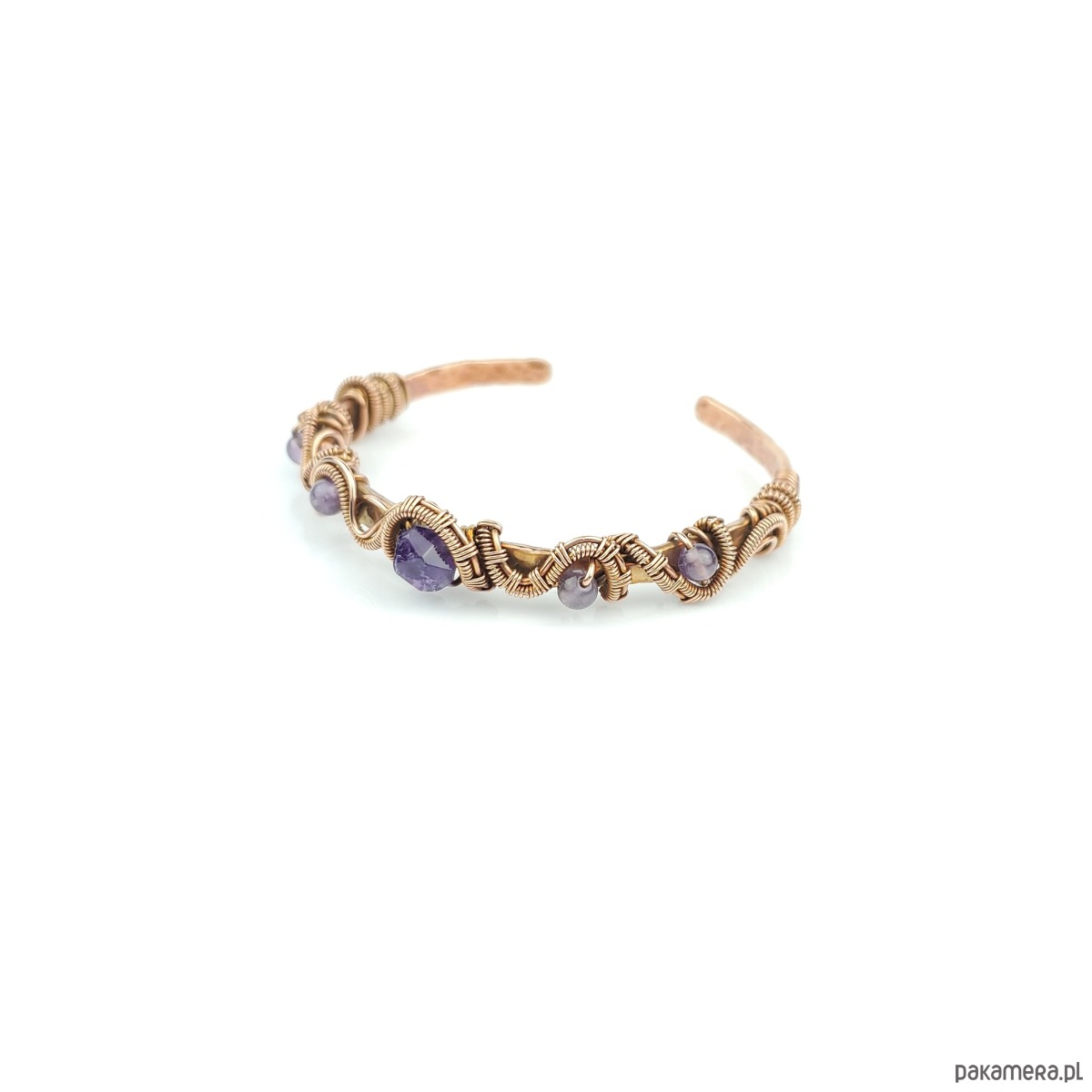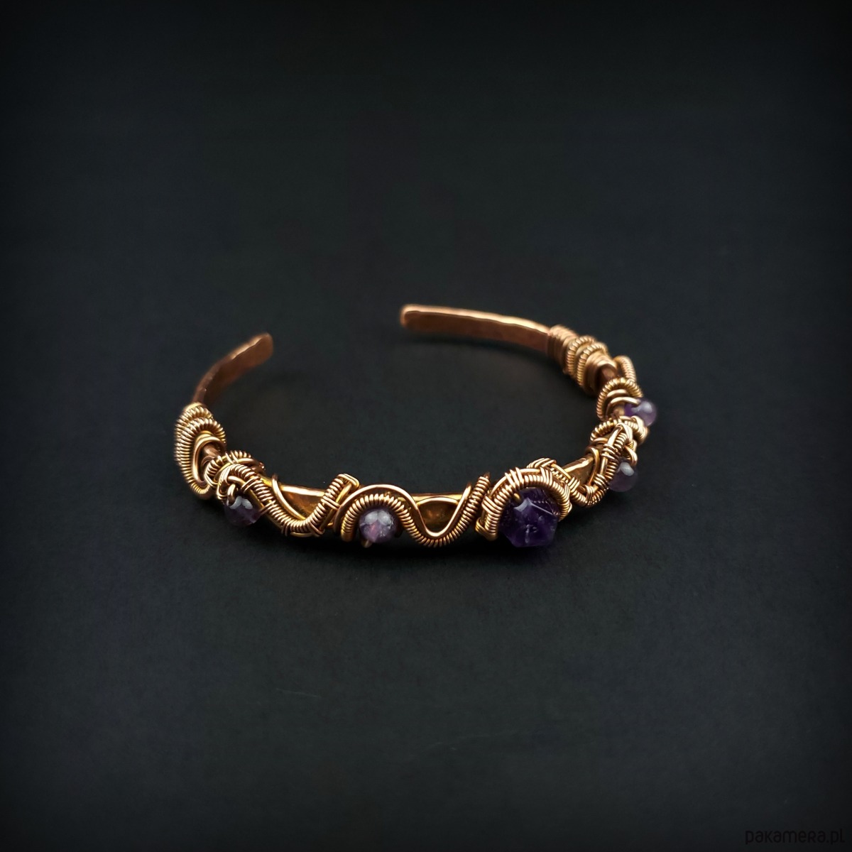 Bransoleta mankietowa (typu cuff) wykonana z fakturowanej miedzi, z misternym oplotem, w który wpleciono kamienie ametyst. Średnica bransolety wynosi 5,5 cm, obwód 17 cm.