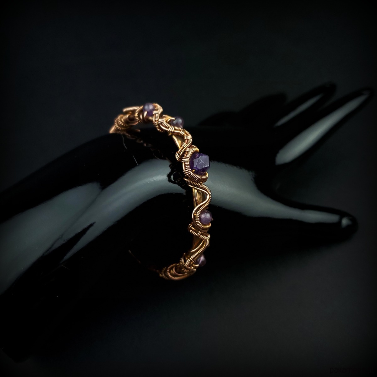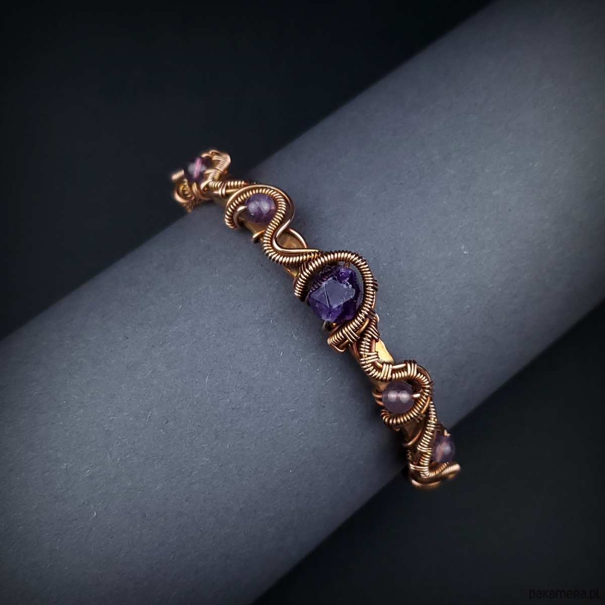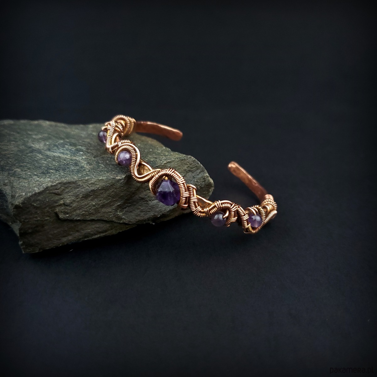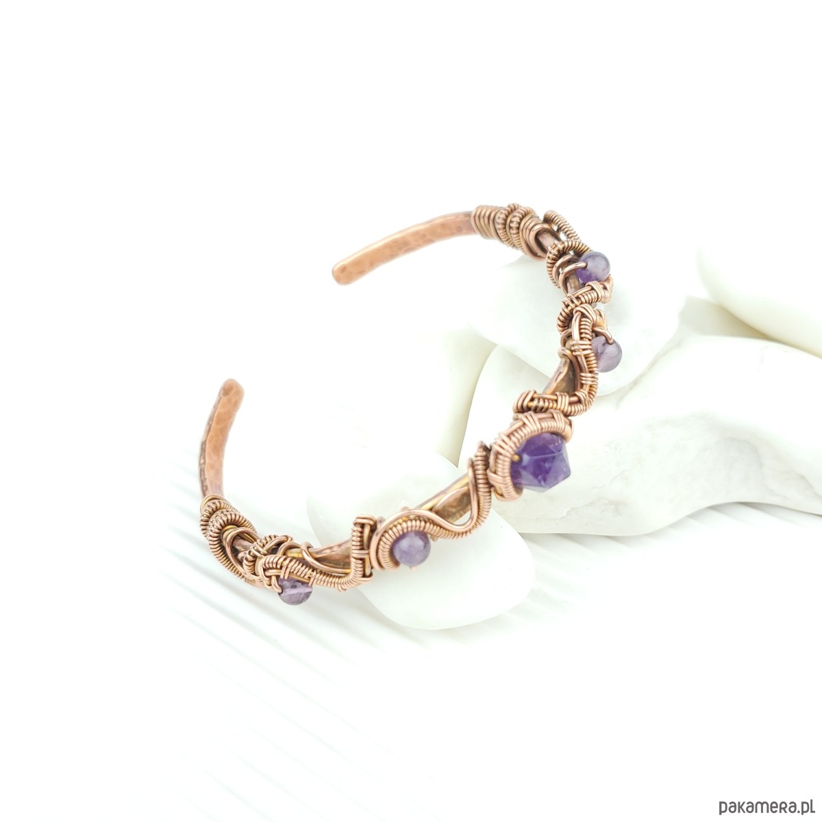 Bransoleta mankietowa (typu cuff) wykonana z fakturowanej miedzi, z misternym oplotem, w który wpleciono kamienie ametyst. Średnica bransolety wynosi 5,5 cm, obwód 17 cm.