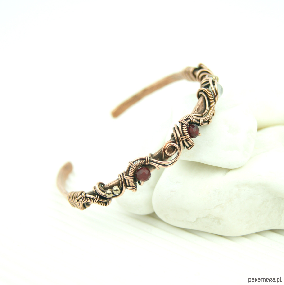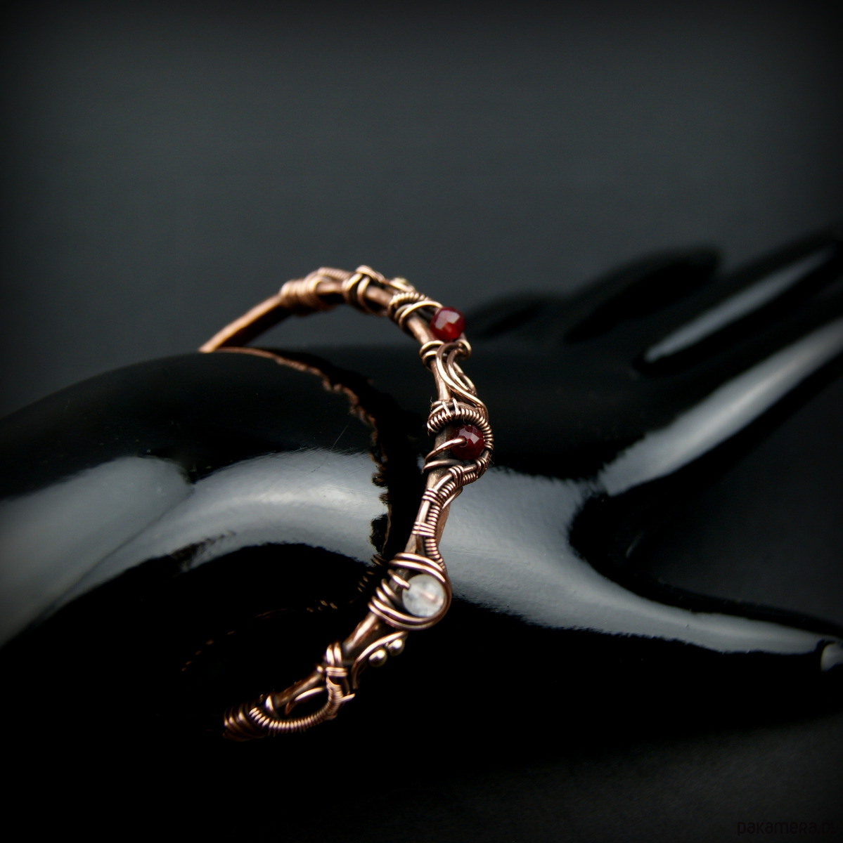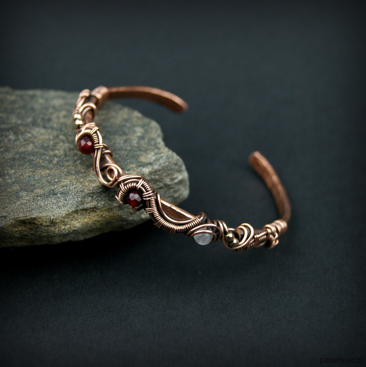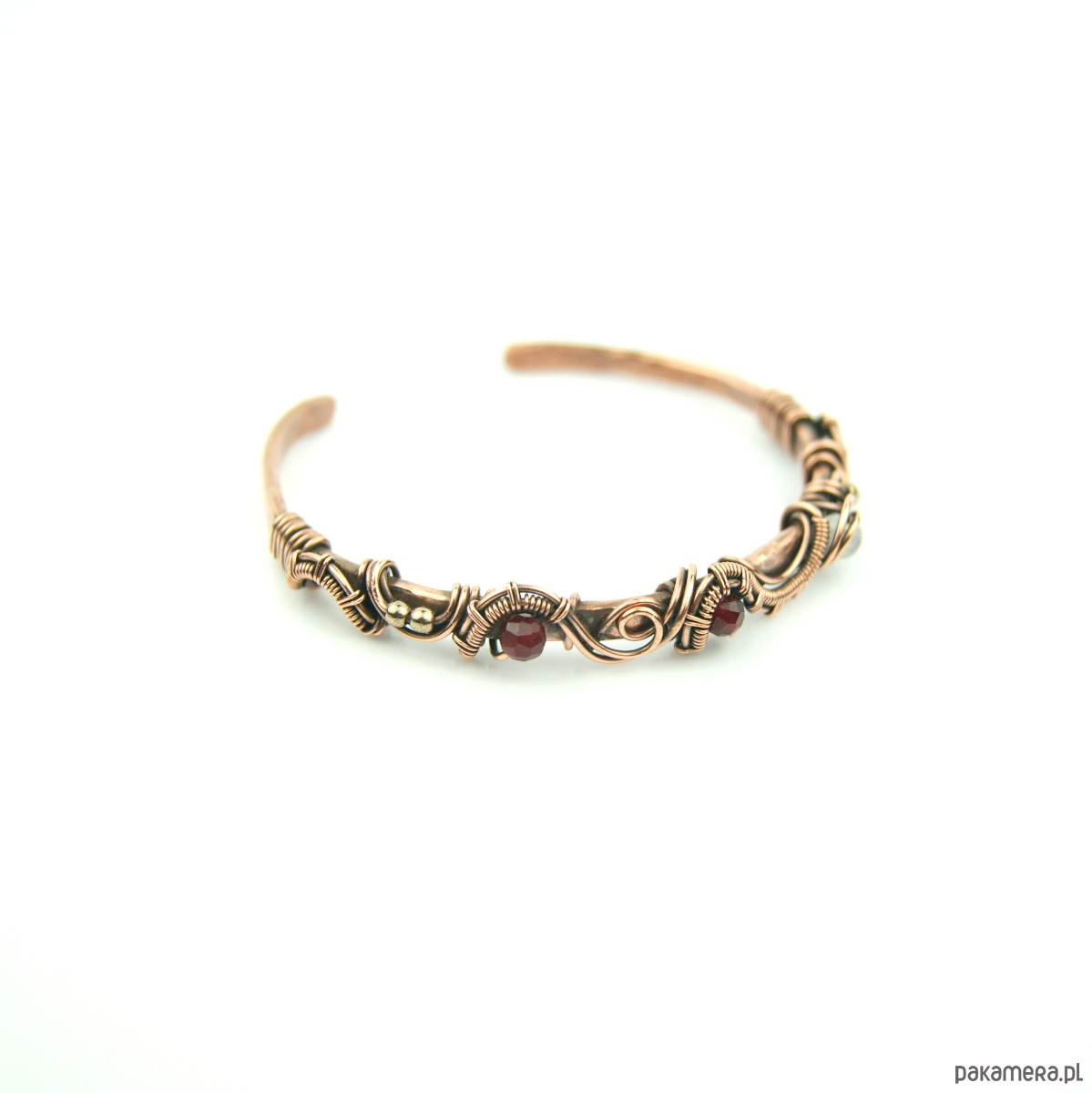 Bransoleta mankietowa (typu cuff) wykonana z fakturowanej miedzi, z misternym oplotem, w którym połyskują kamienie: rubin, różowy kwarc i złote hematyty. Średnica bransolety wynosi 5,5 cm, obwód 17,2 cm.