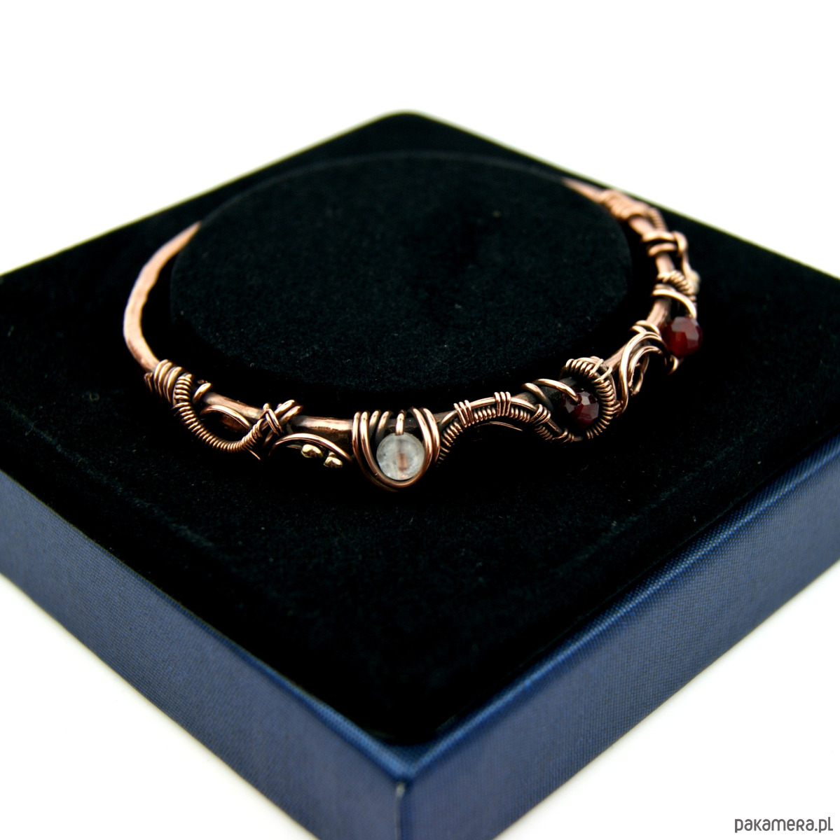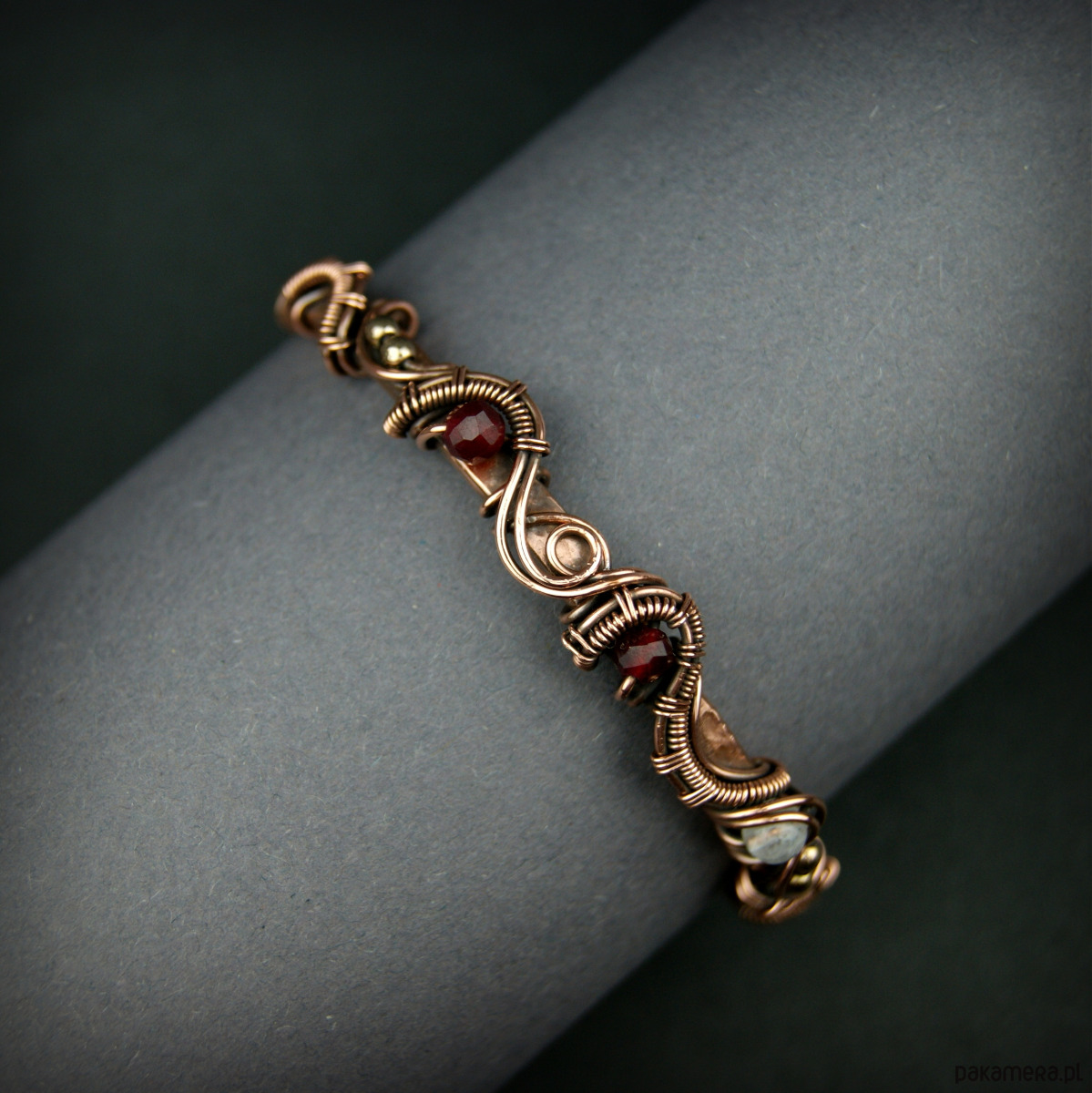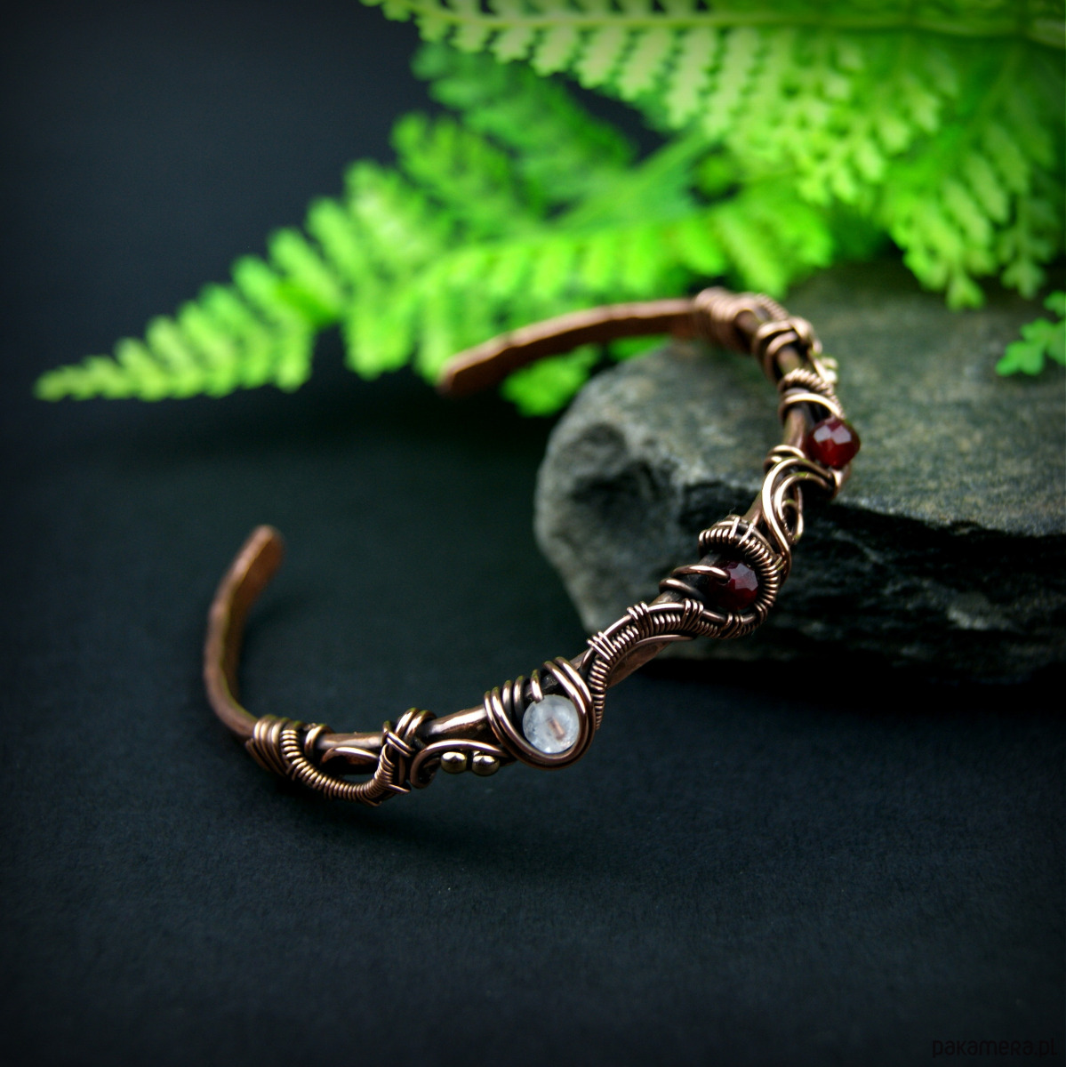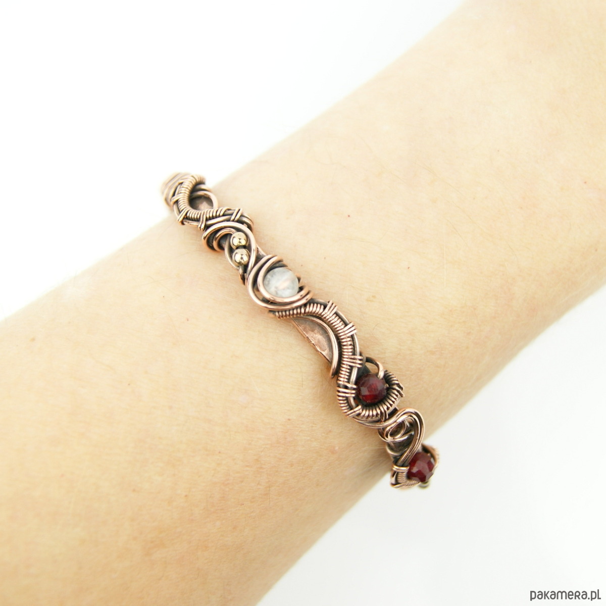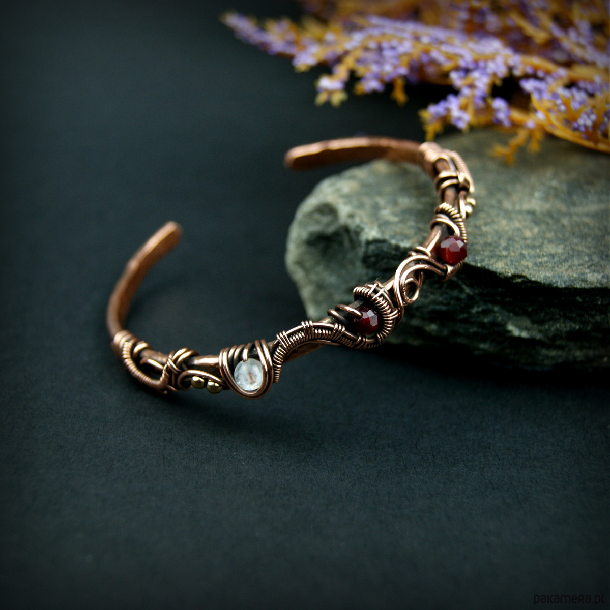 Bransoleta mankietowa (typu cuff) wykonana z fakturowanej miedzi, z misternym oplotem, w którym połyskują kamienie: rubin, różowy kwarc i złote hematyty. Średnica bransolety wynosi 5,5 cm, obwód 17,2 cm.