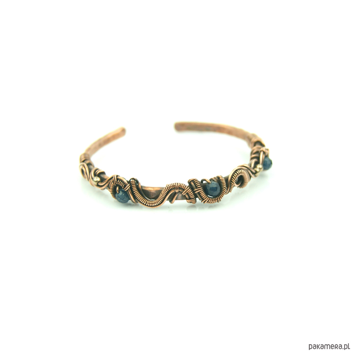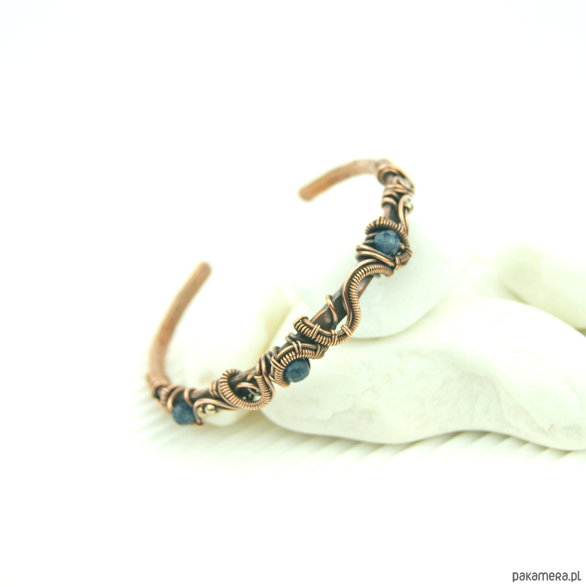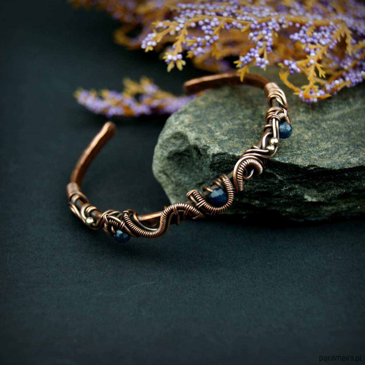 Bransoleta mankietowa (typu cuff) wykonana z fakturowanej miedzi, z misternym oplotem, w którym połyskują szafiry i złote hematyty. Średnica bransolety wynosi 5,5 cm, obwód 17 cm.