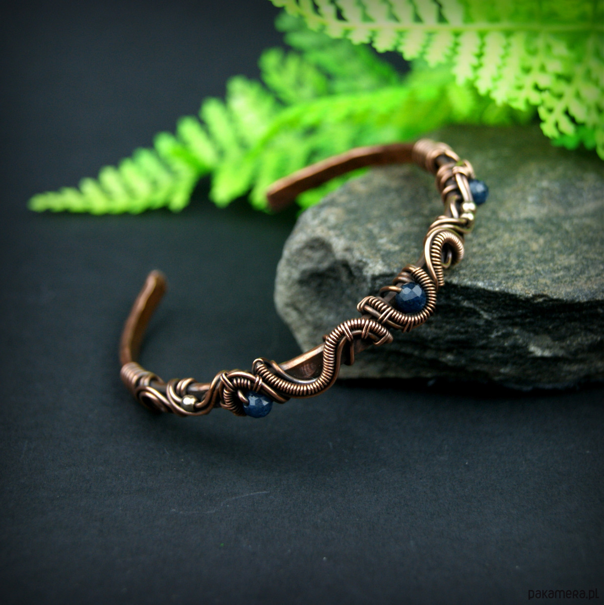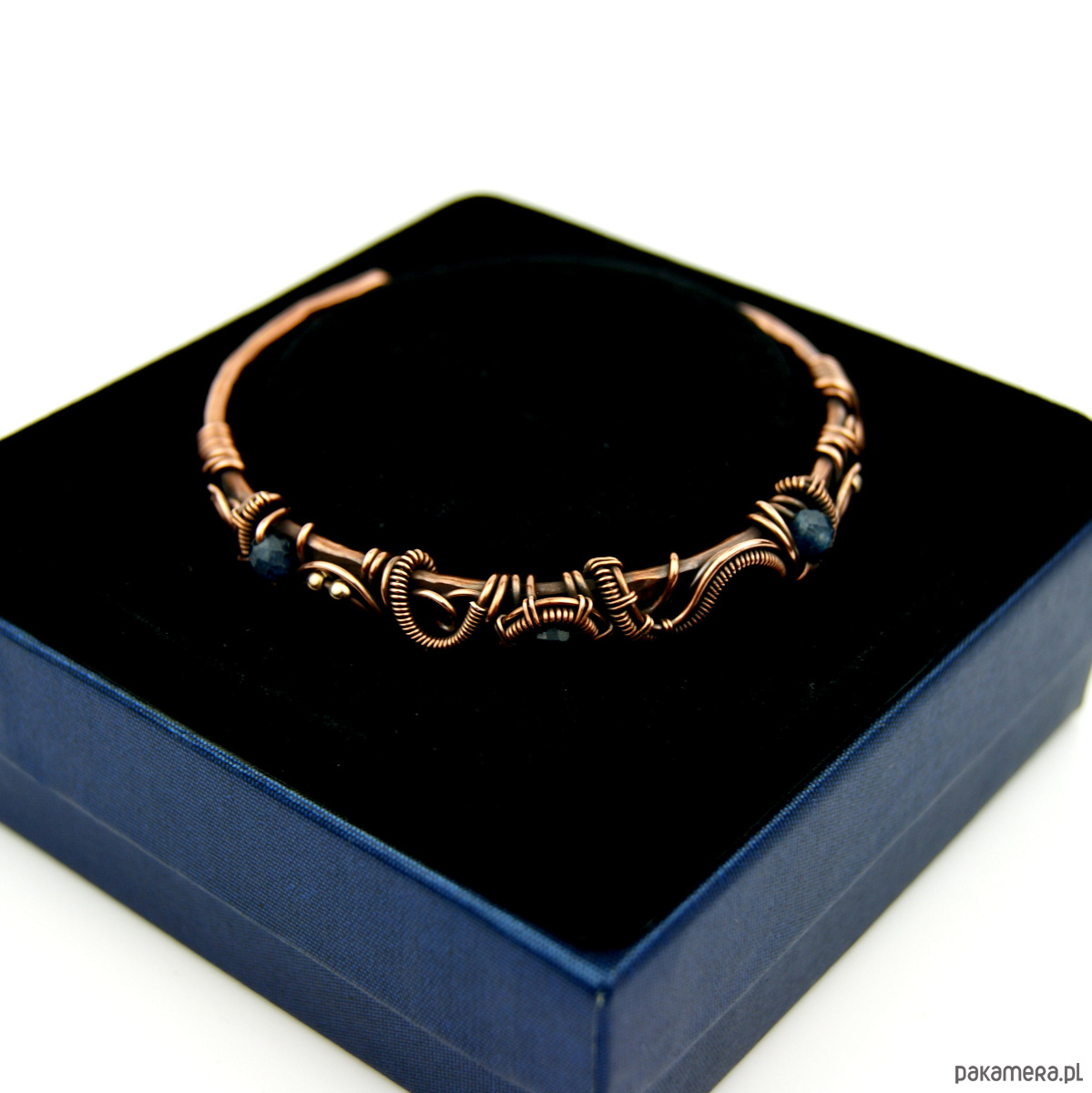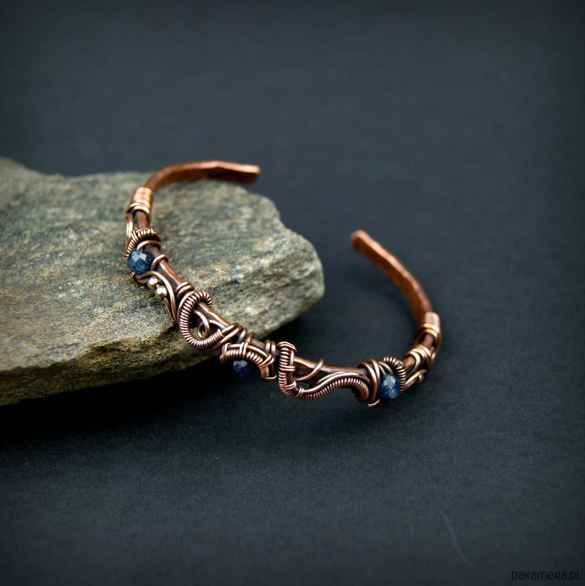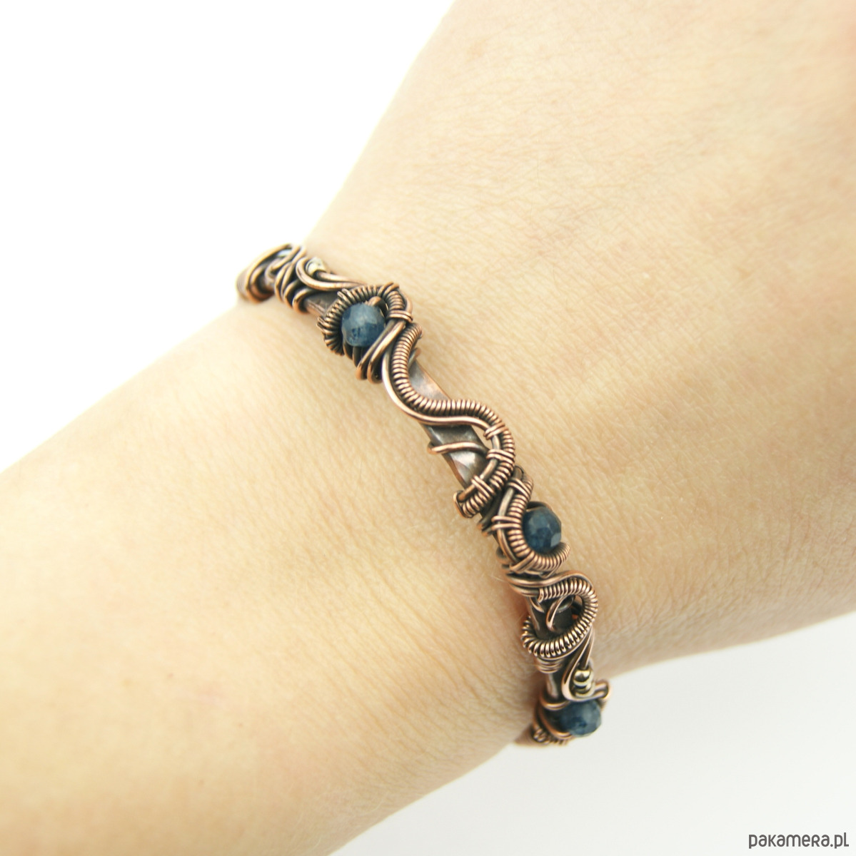 Bransoleta mankietowa (typu cuff) wykonana z fakturowanej miedzi, z misternym oplotem, w którym połyskują szafiry i złote hematyty. Średnica bransolety wynosi 5,5 cm, obwód 17 cm.