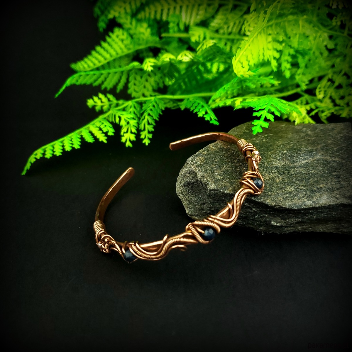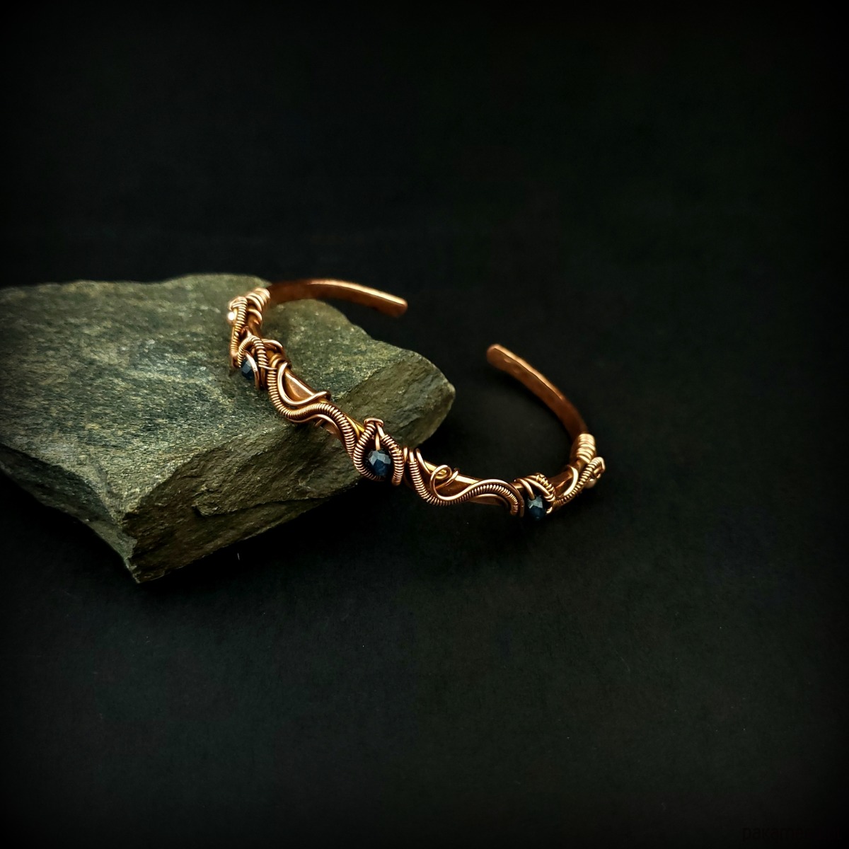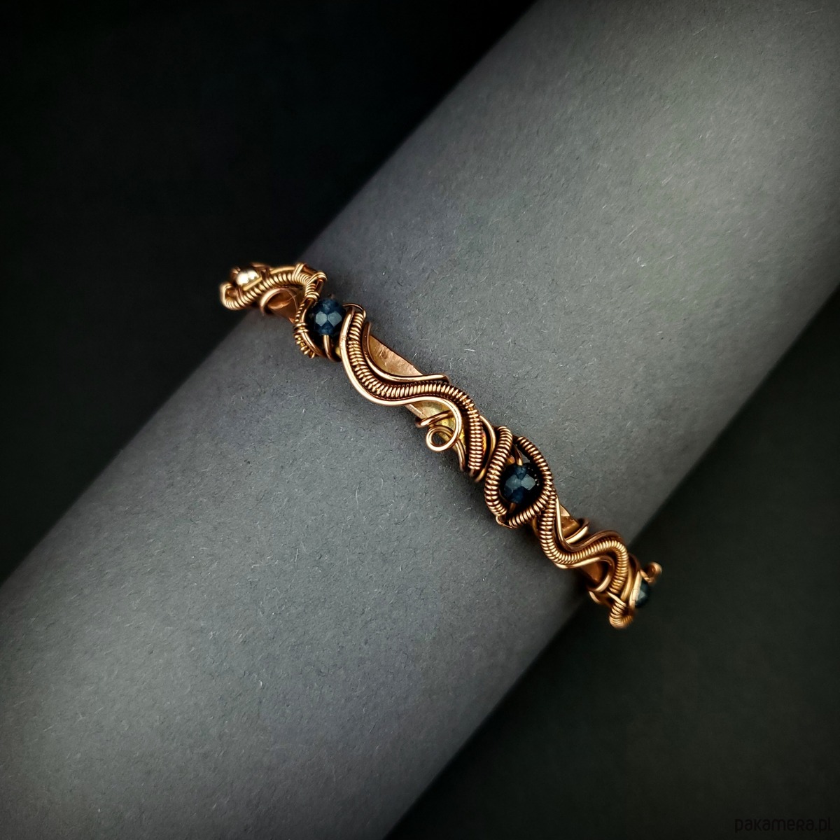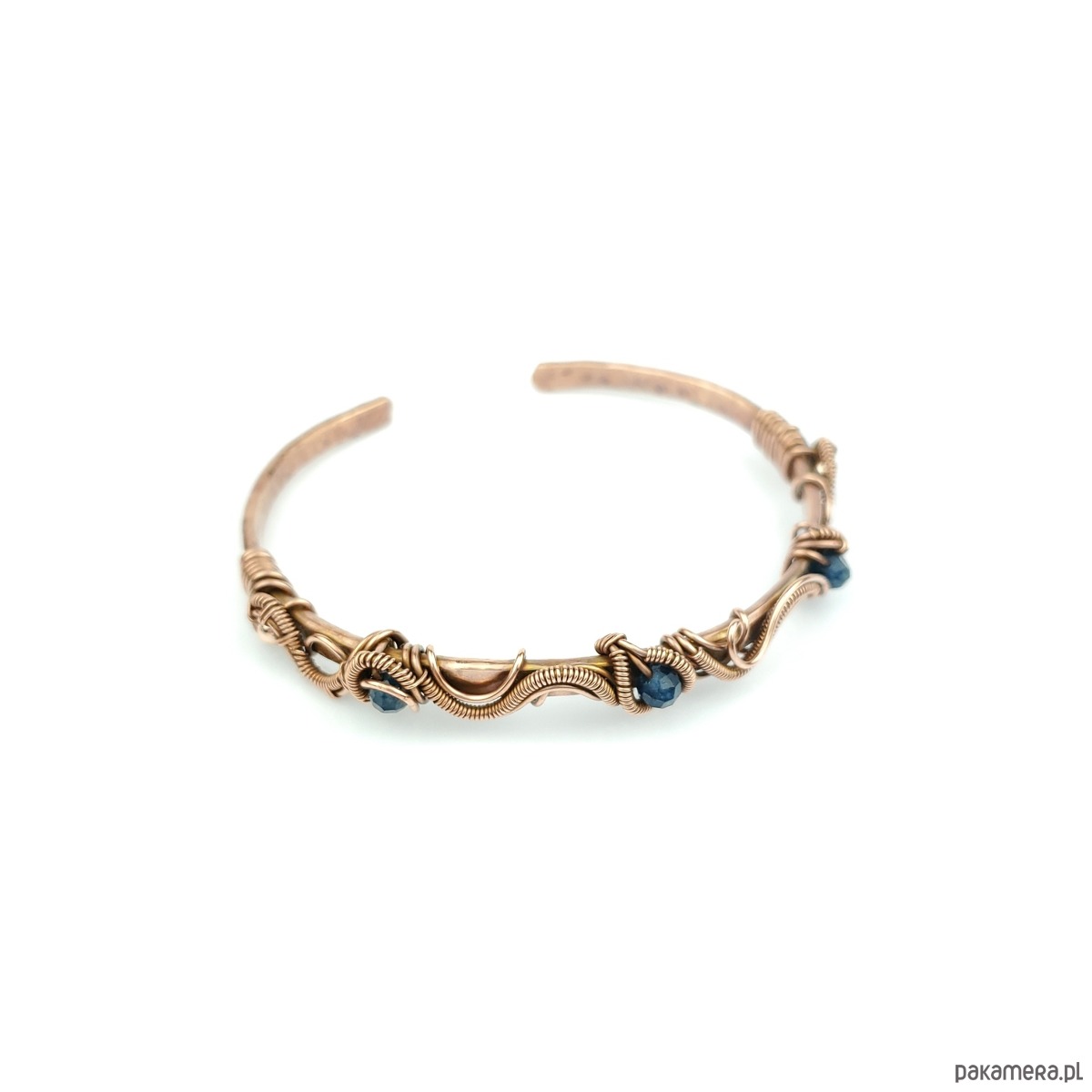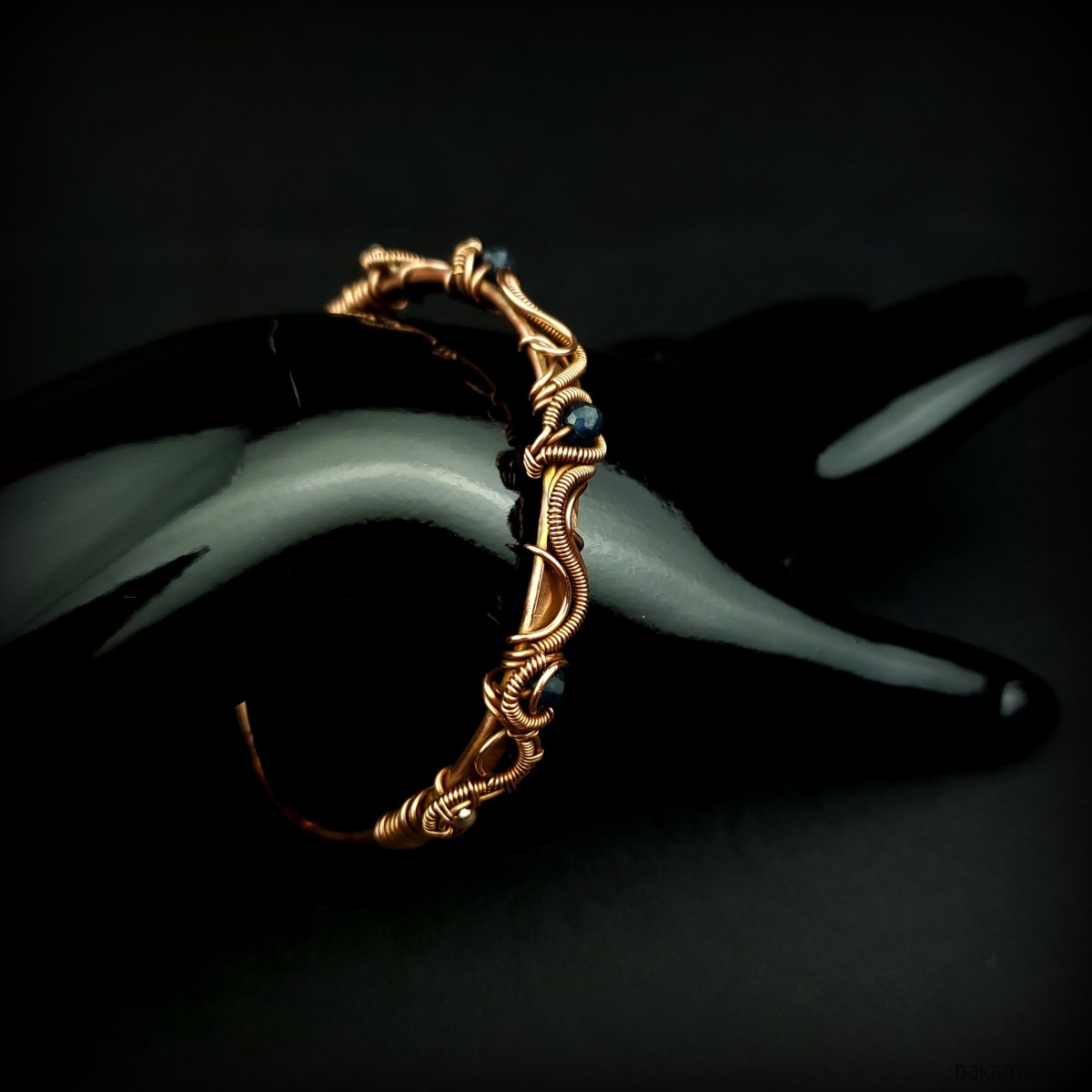 Bransoleta mankietowa (typu cuff) wykonana z fakturowanej miedzi, z misternym oplotem, w którym połyskują szafiry i złote hematyty. Średnica bransolety wynosi 6 cm, obwód 18,5 cm.