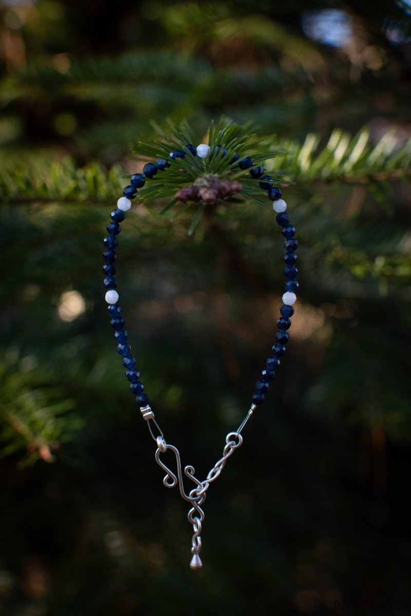 Materiały ~ drucik jubilerski, lapis lazuli fasetowany, kamień księżycowy fasetowany, miedziane zapięcie i przedłużka.