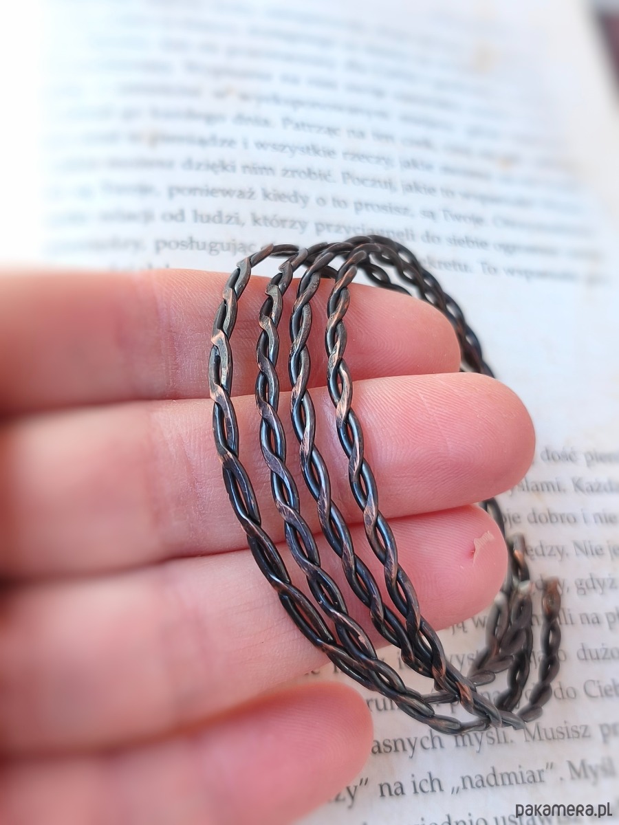 Ta ręcznie wykuwana bransoletka to nie tylko biżuteria, to manifestacja rzemiosła i energii, która oplata Twój nadgarstek. Wykonana z czystej miedzi, wyróżnia się podwójnie skręconym splotem, który symbolizuje nierozerwalną więź między tym, co ziemskie, a tym, co duchowe. Jej surowa forma przywodzi na myśl dawne talizmany, noszone przez tych, którzy szukali ochrony i jasności umysłu.