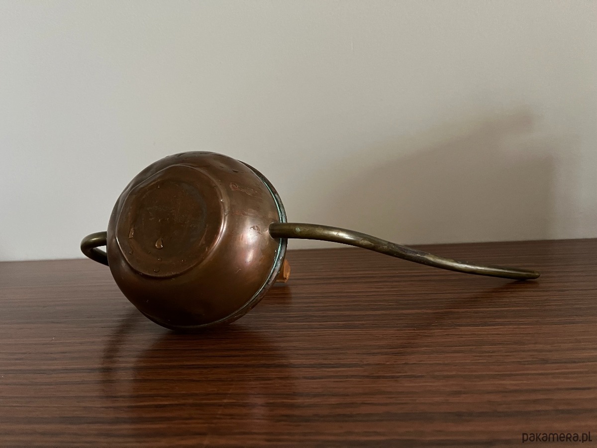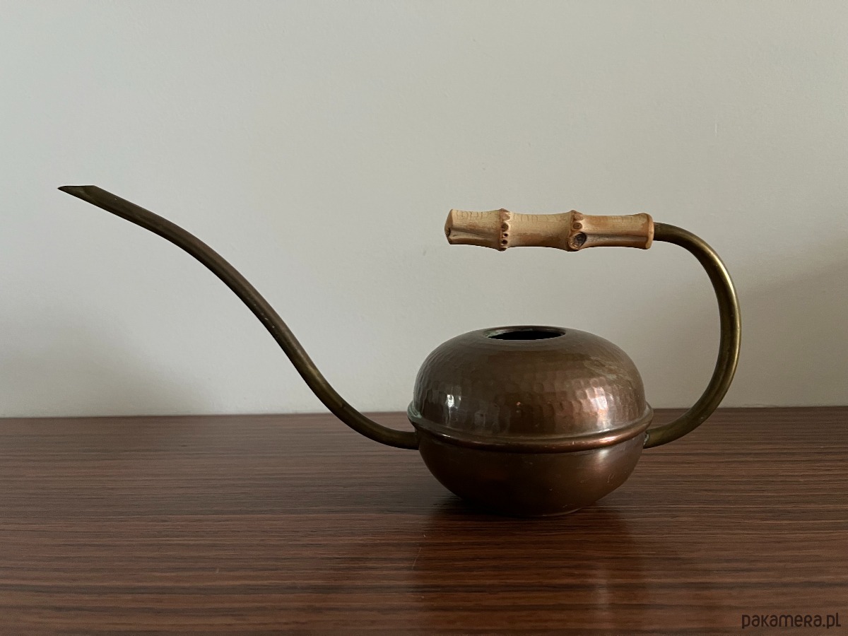 Miedziana konewka vintage z bambusową rączką pochodząca ze słynnych Wiener Werkstätte z lat 50. Niezwykle ciekawa, fikuśna forma.
