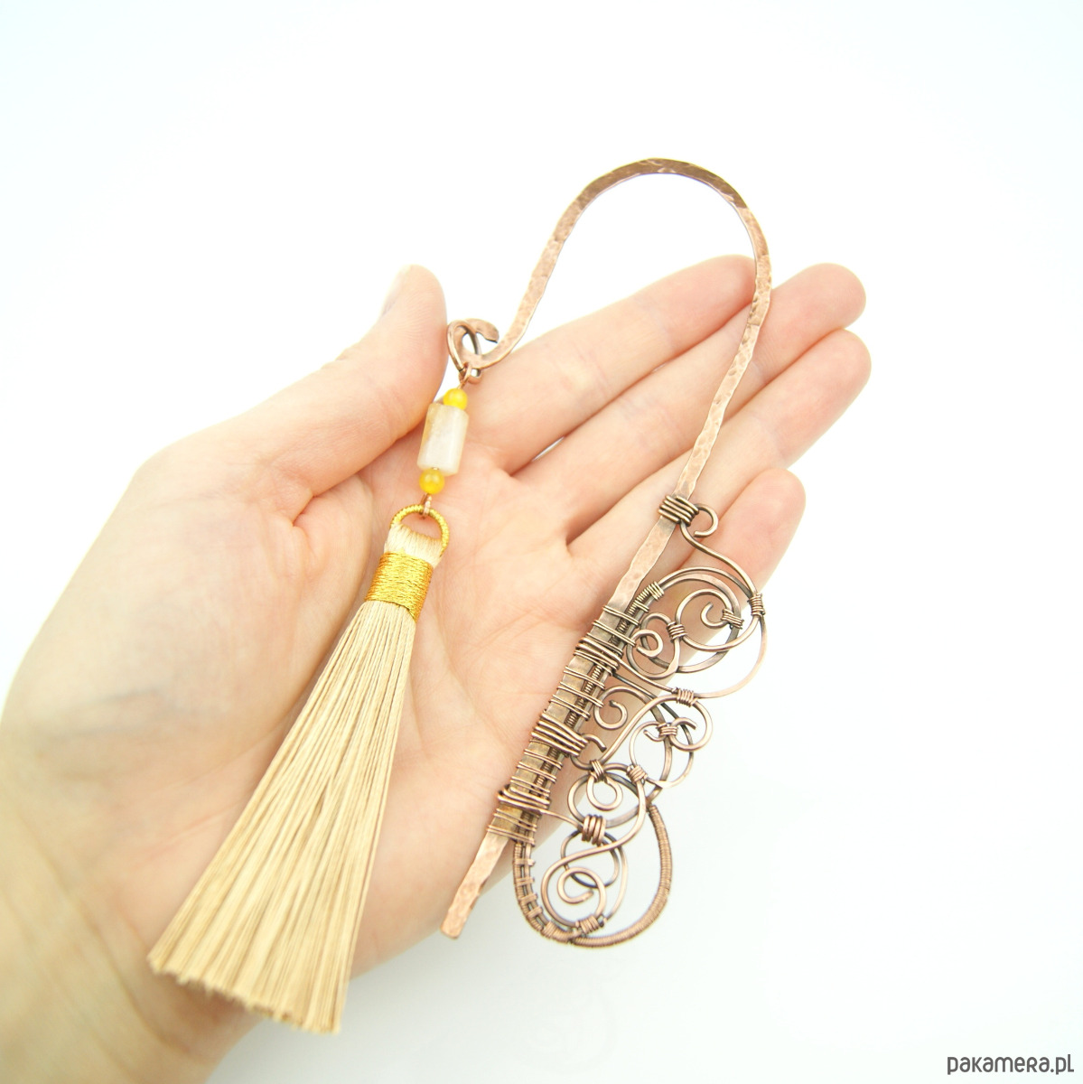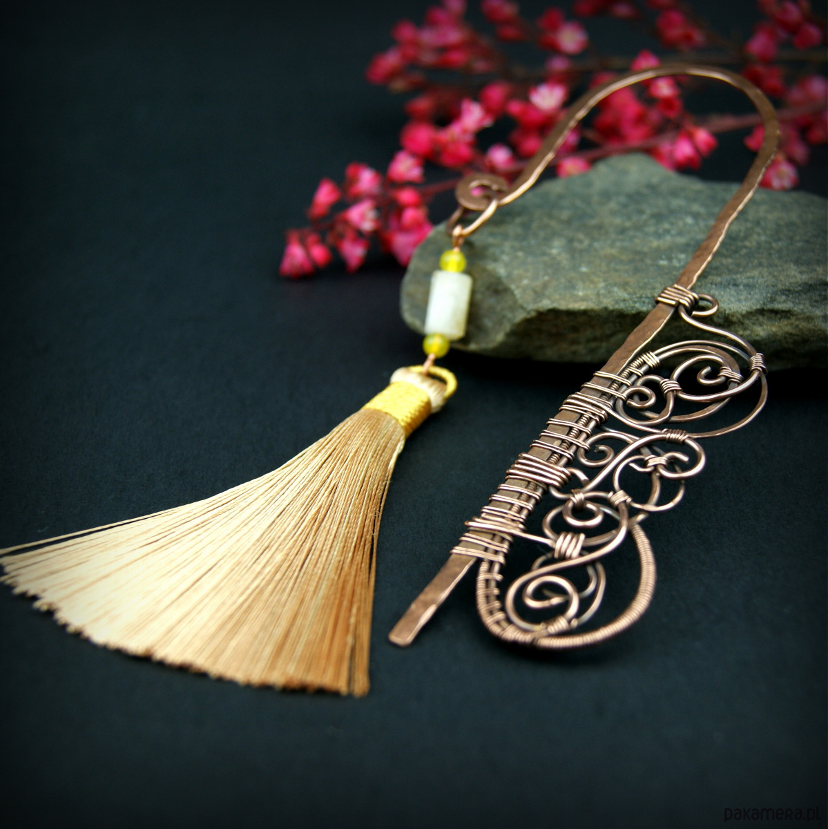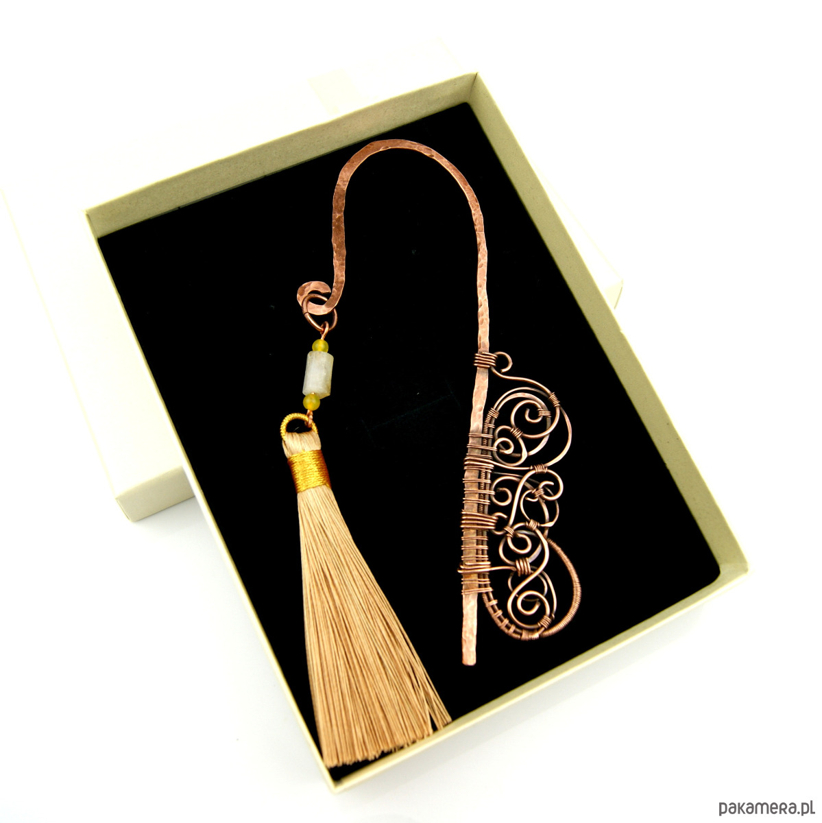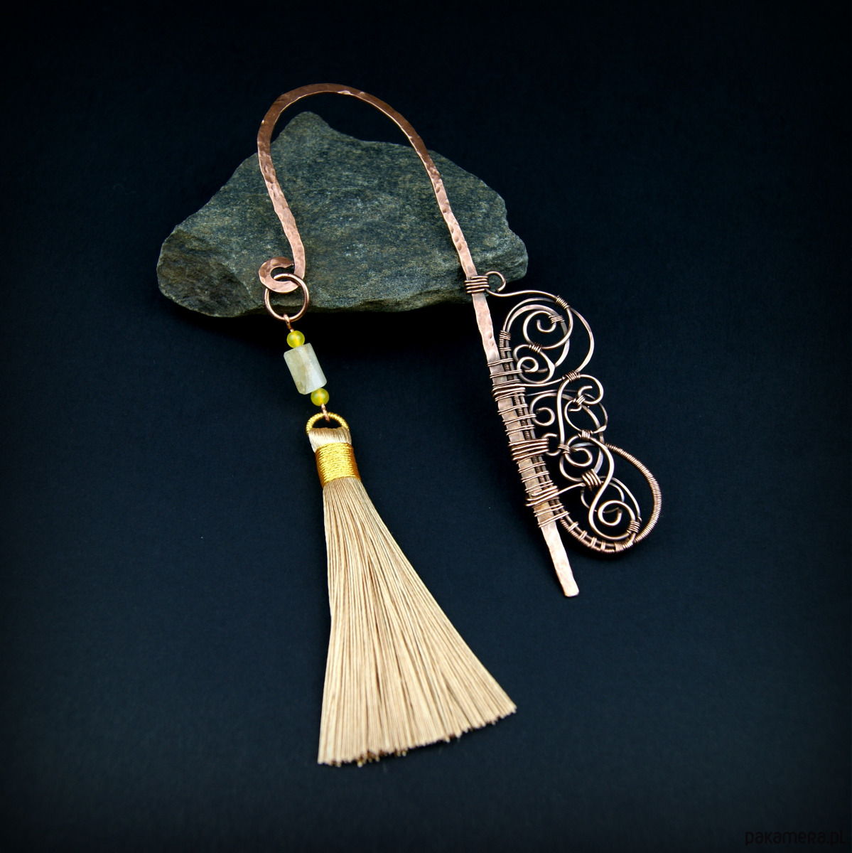 Jedyna w swoim rodzaju zakładka do książki wykonana w pracochłonnej technice wire wrapping. Zakładka wykonana z fakturowanej miedzi, z misternym oplotem. Ozdobna przywieszka z długim wiskozowym chwostem oraz kamieniami: cytrynem i agatami. Całkowita długość zakładki (razem z chwostem) to 17 cm.
