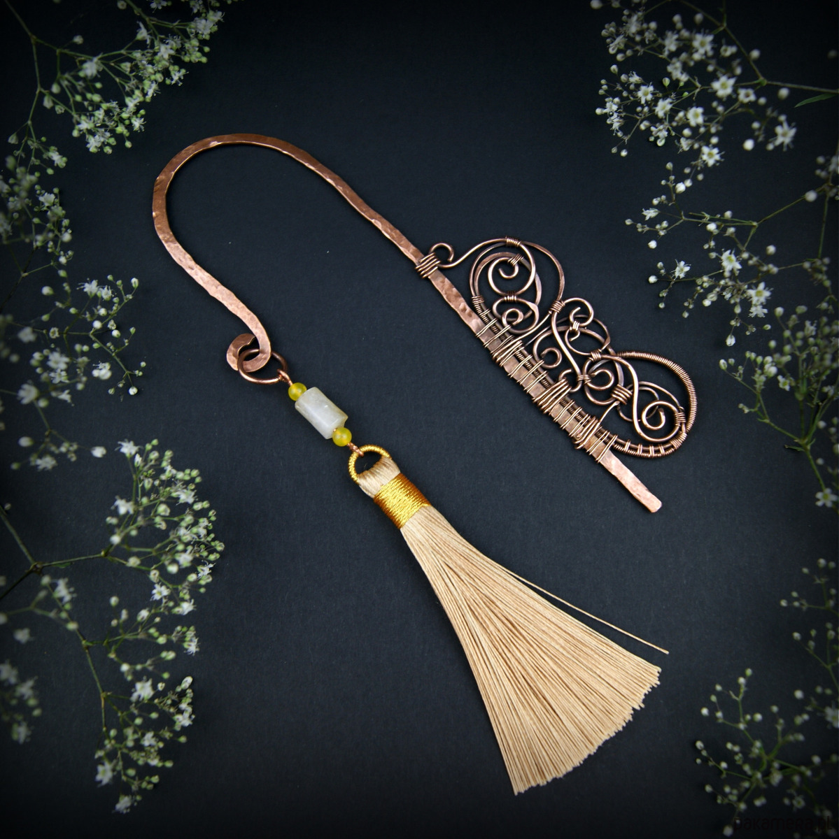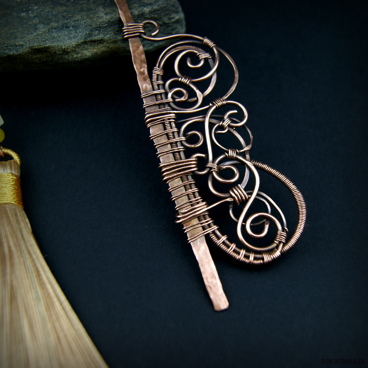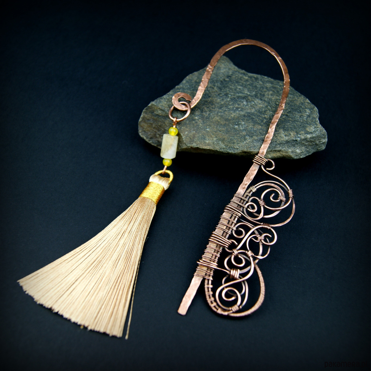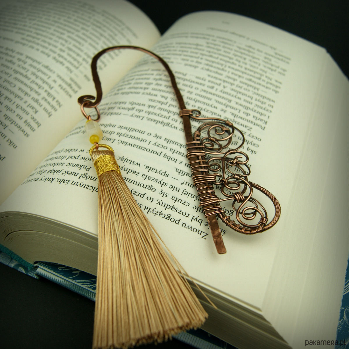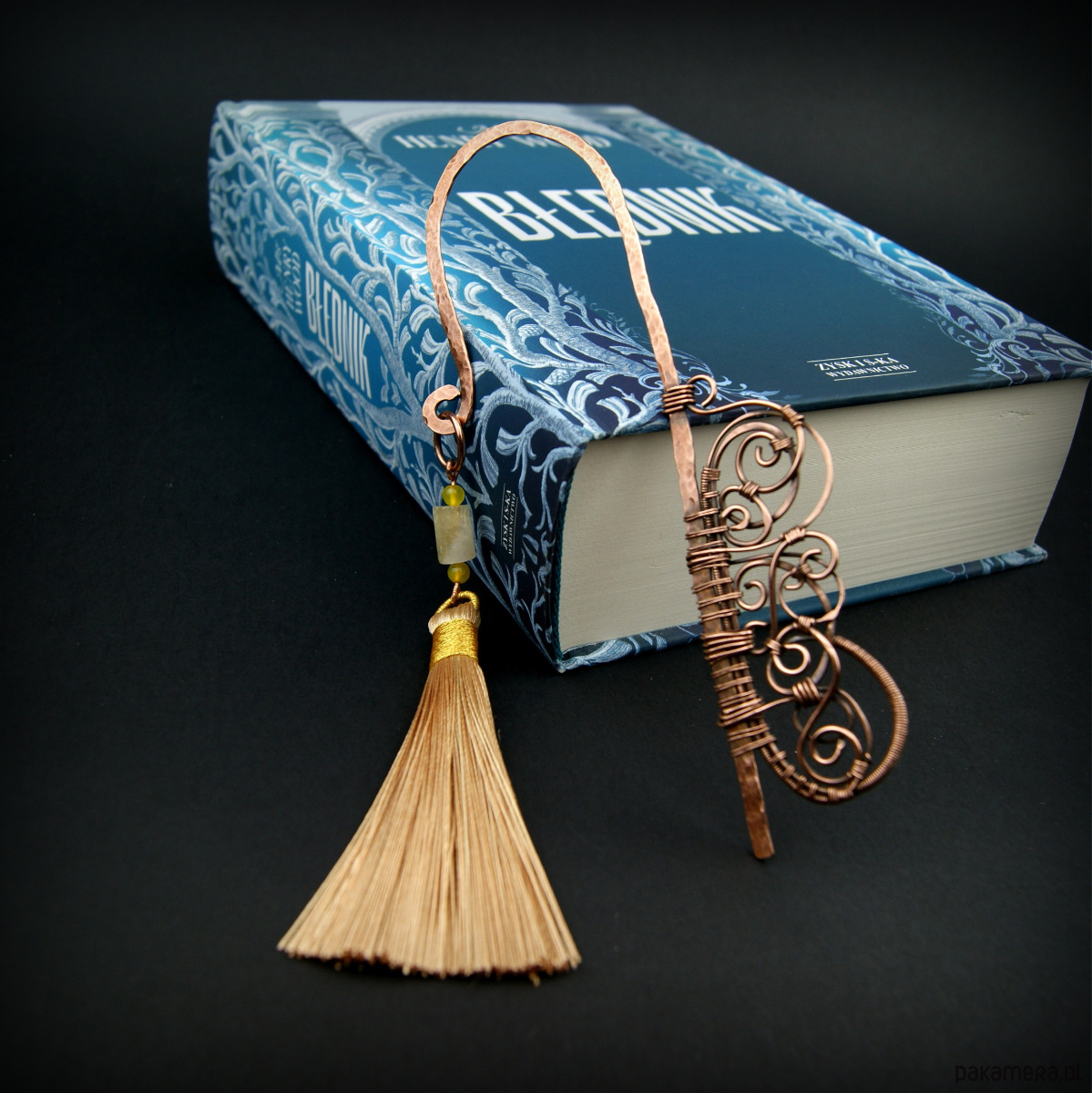 Jedyna w swoim rodzaju zakładka do książki wykonana w pracochłonnej technice wire wrapping. Zakładka wykonana z fakturowanej miedzi, z misternym oplotem. Ozdobna przywieszka z długim wiskozowym chwostem oraz kamieniami: cytrynem i agatami. Całkowita długość zakładki (razem z chwostem) to 17 cm.