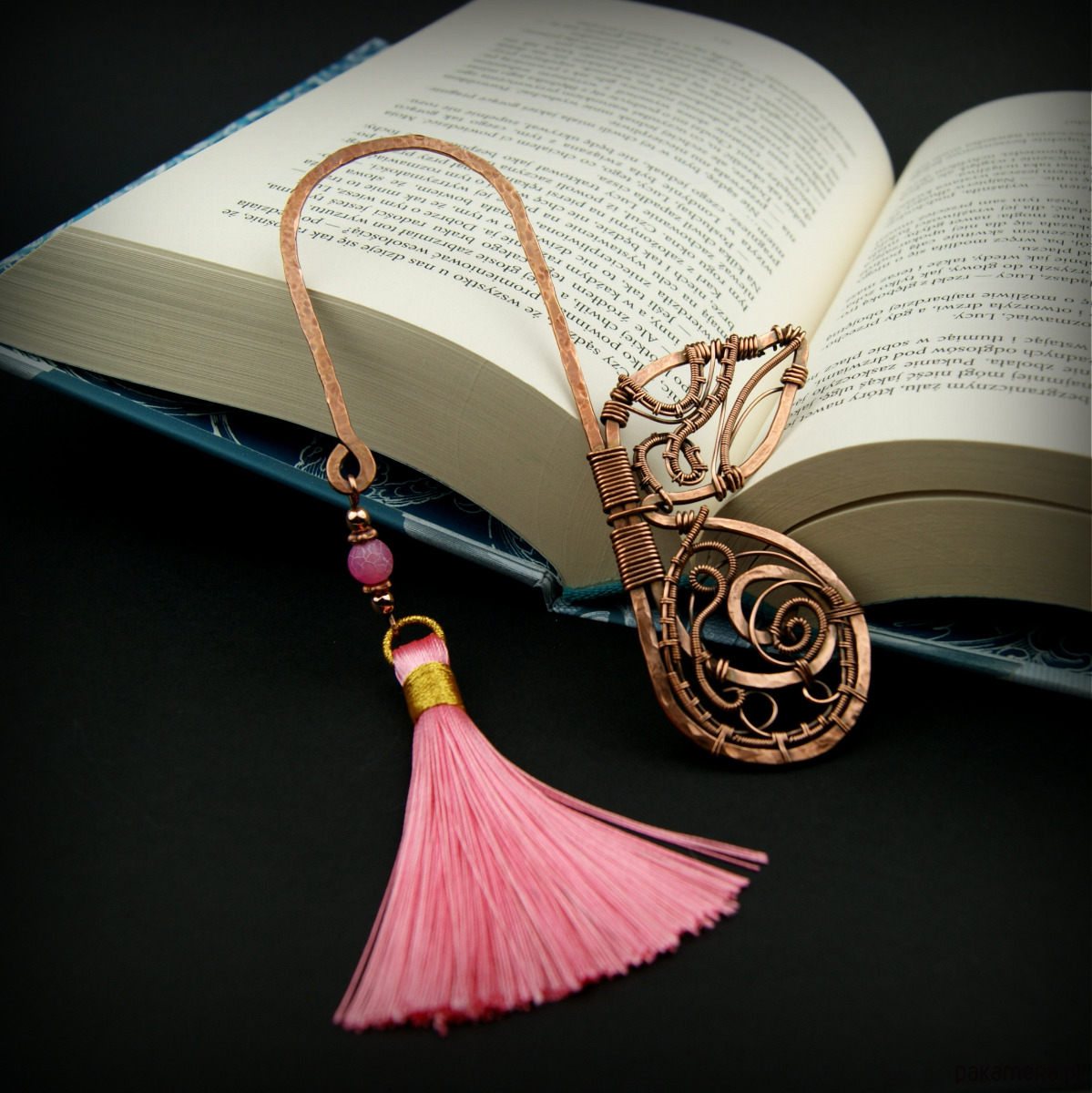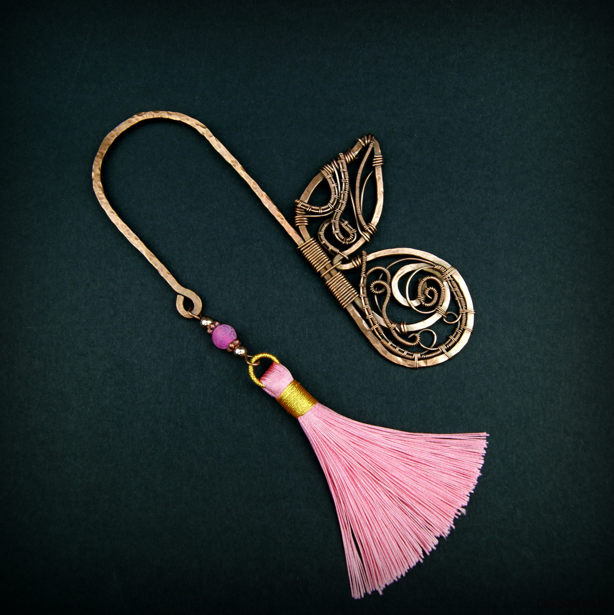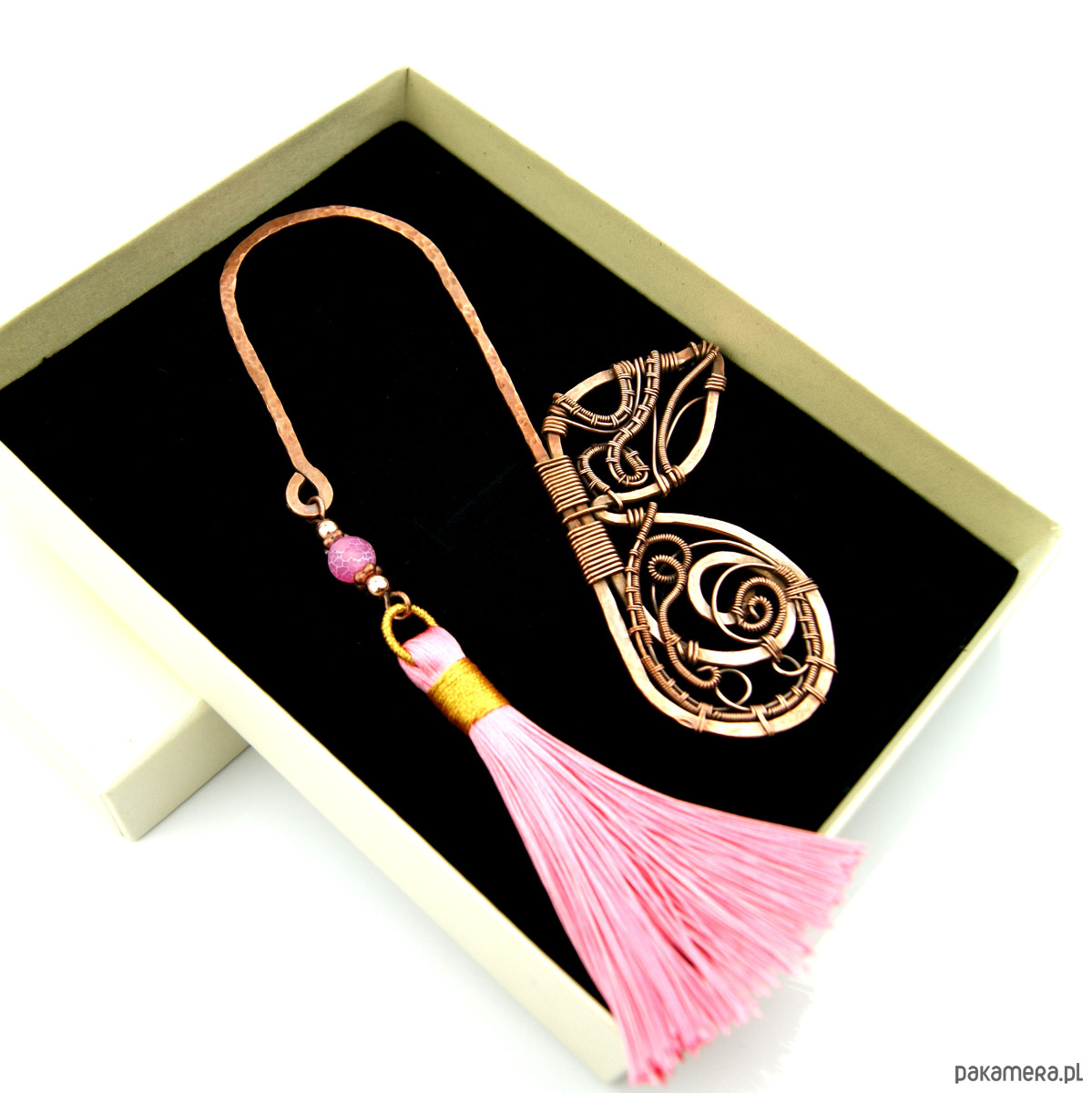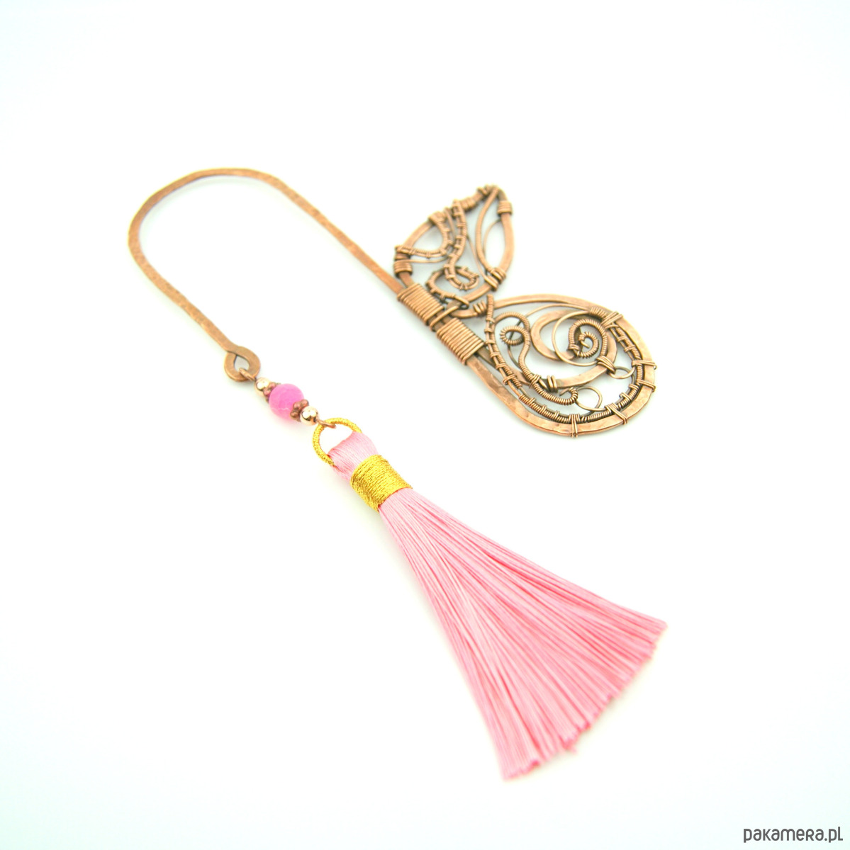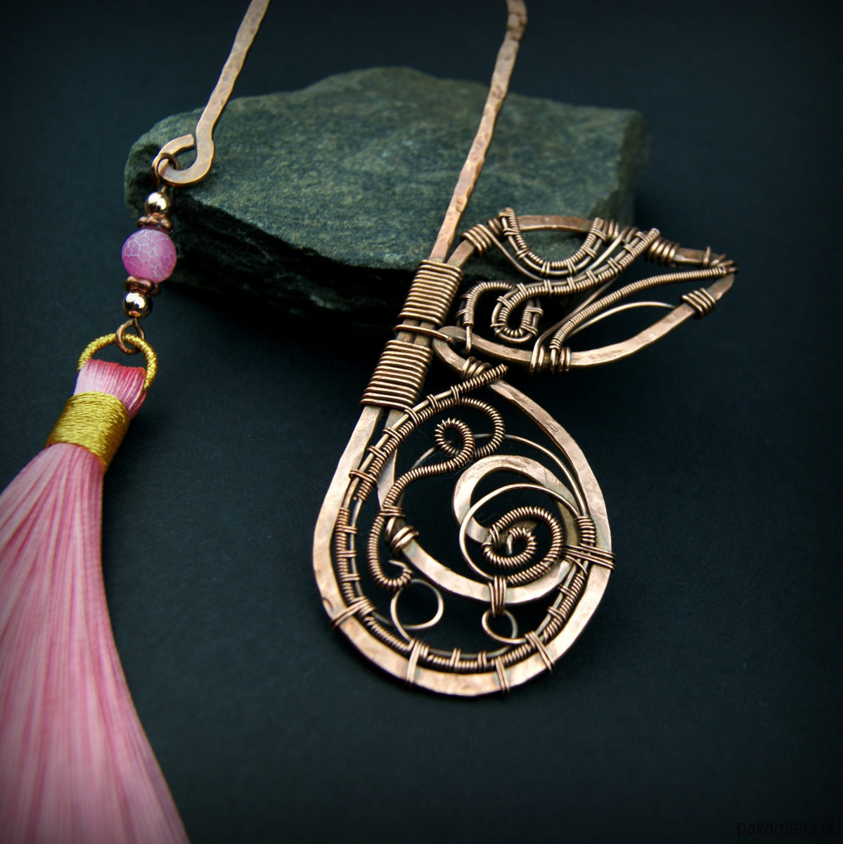 Jedyna w swoim rodzaju zakładka do książki wykonana w pracochłonnej technice wire wrapping. Zakładka wykonana z fakturowanej miedzi, z misternym oplotem. Ozdobna przywieszka z długim wiskozowym chwostem oraz kamieniami: agatem i hematytem. Całkowita długość zakładki (razem z chwostem) to 17 cm.