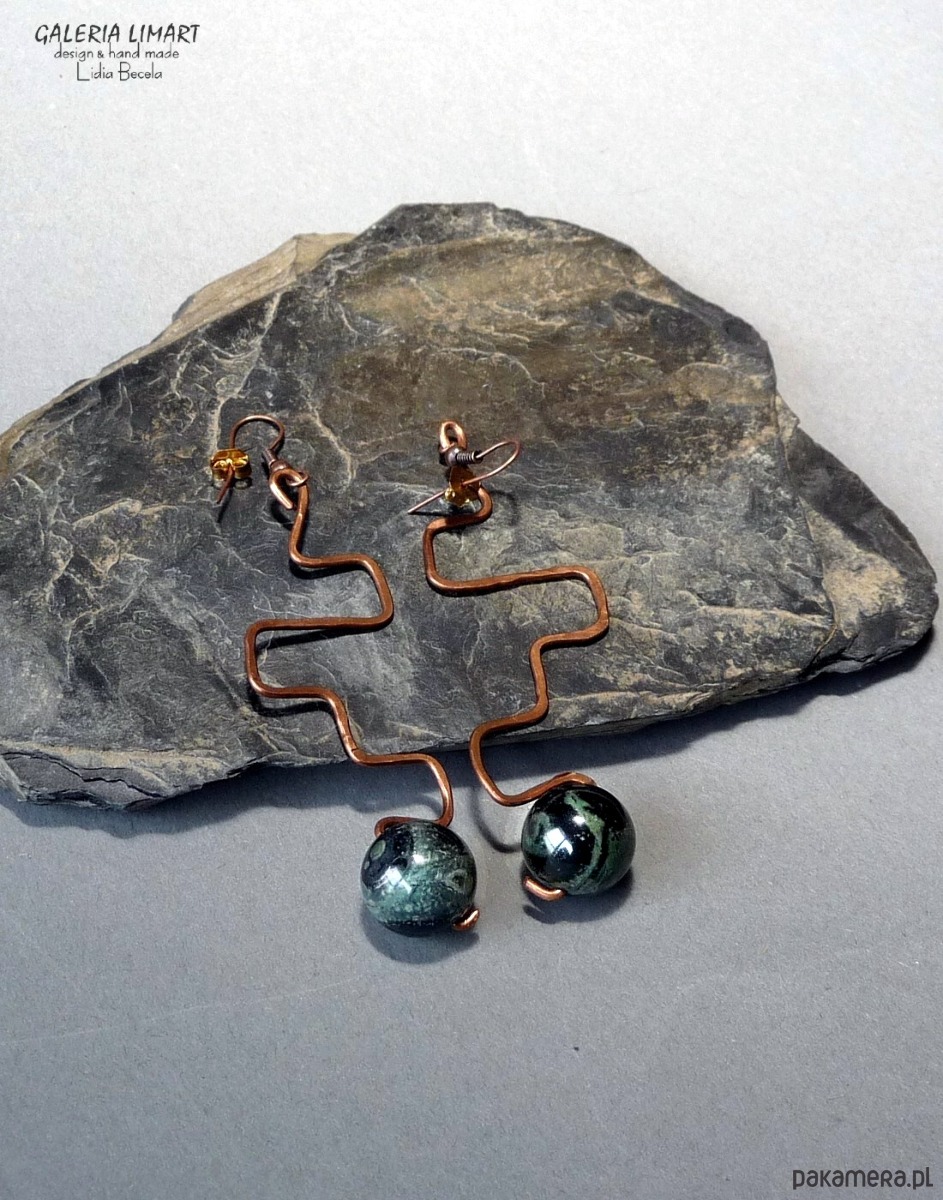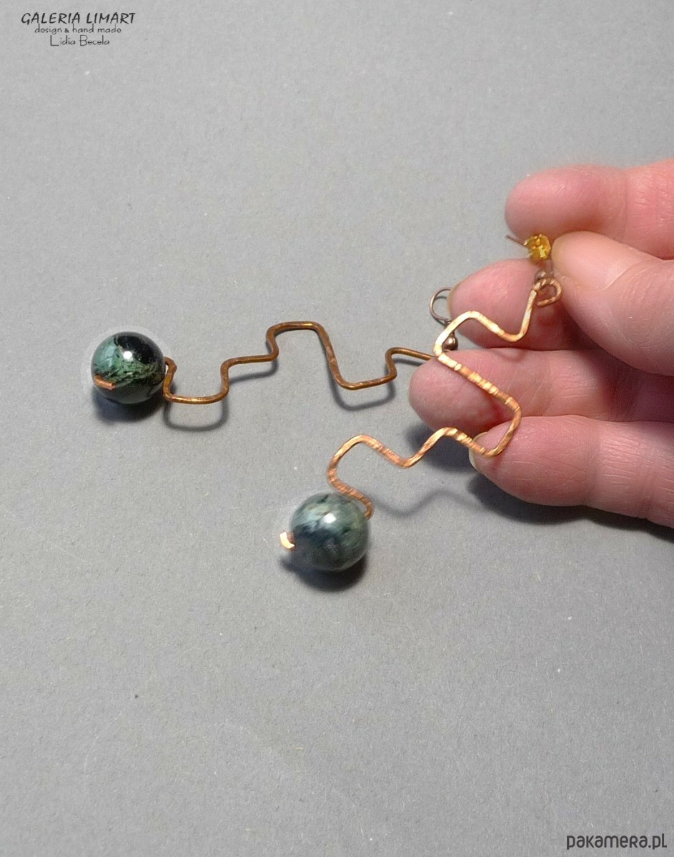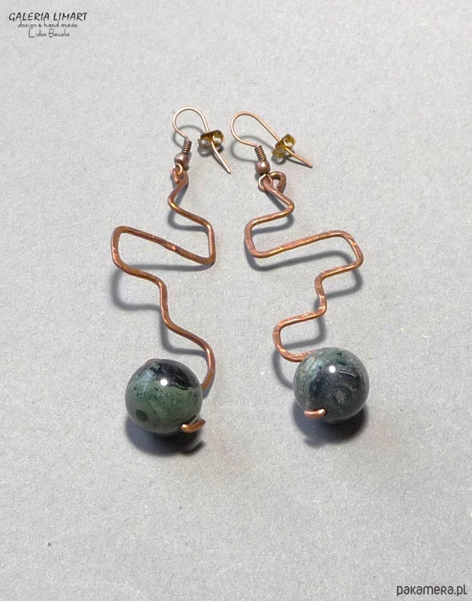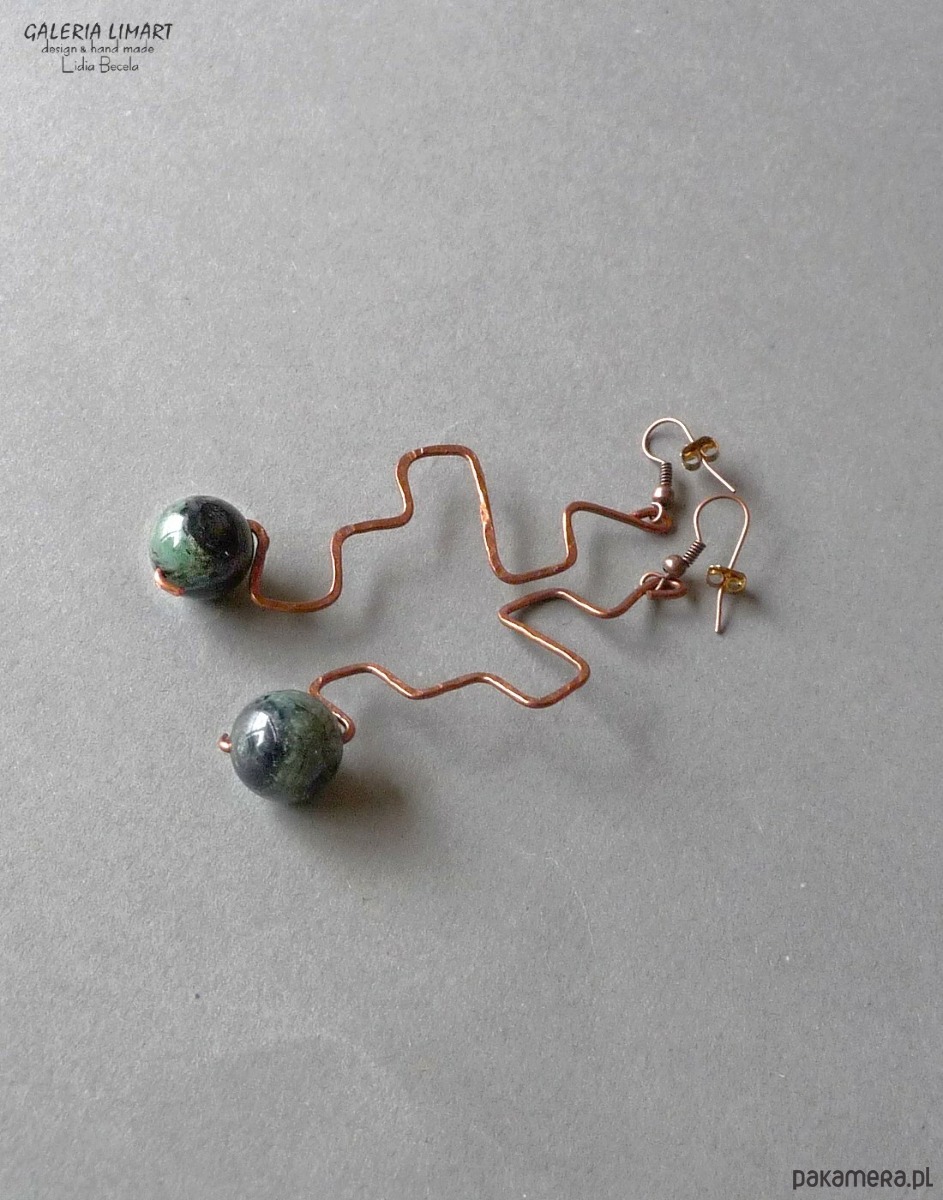 Kolczyki UNIKATOWE w stylu BOHO. Designerskie kolczyki ciekawe w swej formie. Ręcznie repusowane, młotkowane, kute z czystej miedzi w fantazyjnym kształcie zygzaka - ozdobione zieloną kulą z pięknego jaspisu kambaba. Długie ok.8,5 cm z biglem.