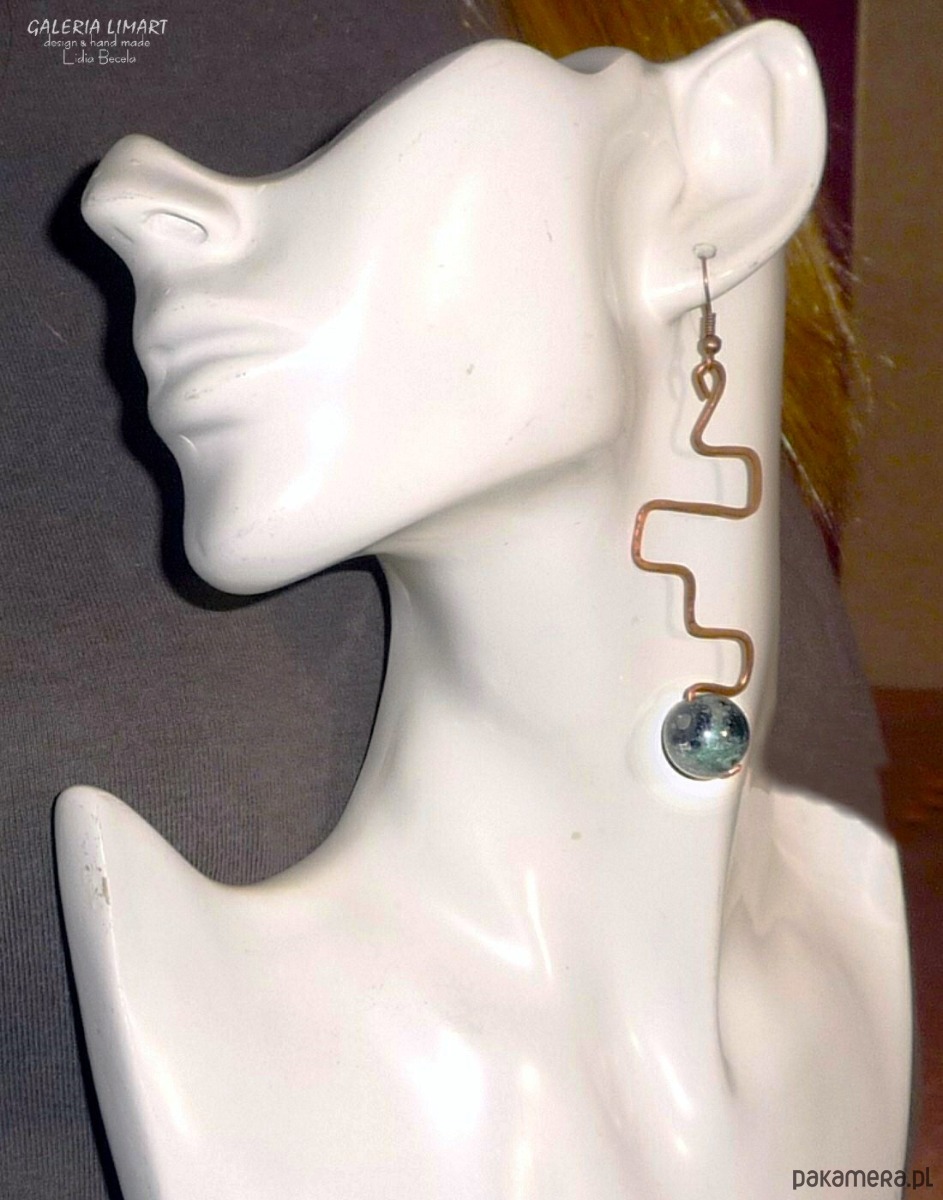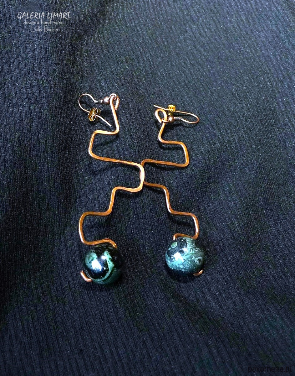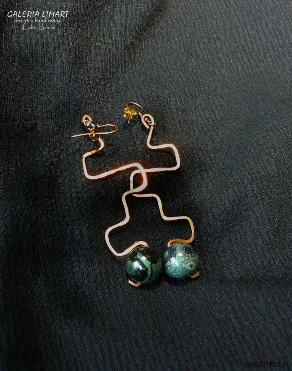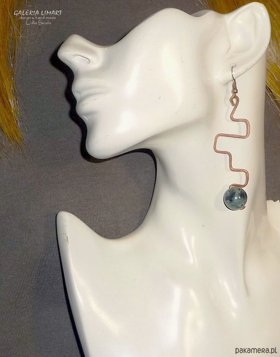 Kolczyki UNIKATOWE w stylu BOHO. Designerskie kolczyki ciekawe w swej formie. Ręcznie repusowane, młotkowane, kute z czystej miedzi w fantazyjnym kształcie zygzaka - ozdobione zieloną kulą z pięknego jaspisu kambaba. Długie ok.8,5 cm z biglem.