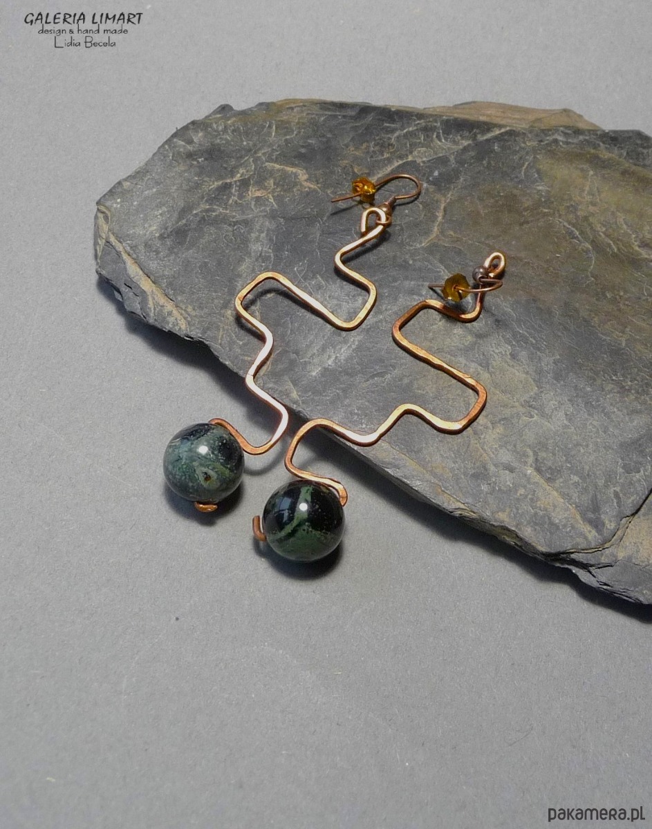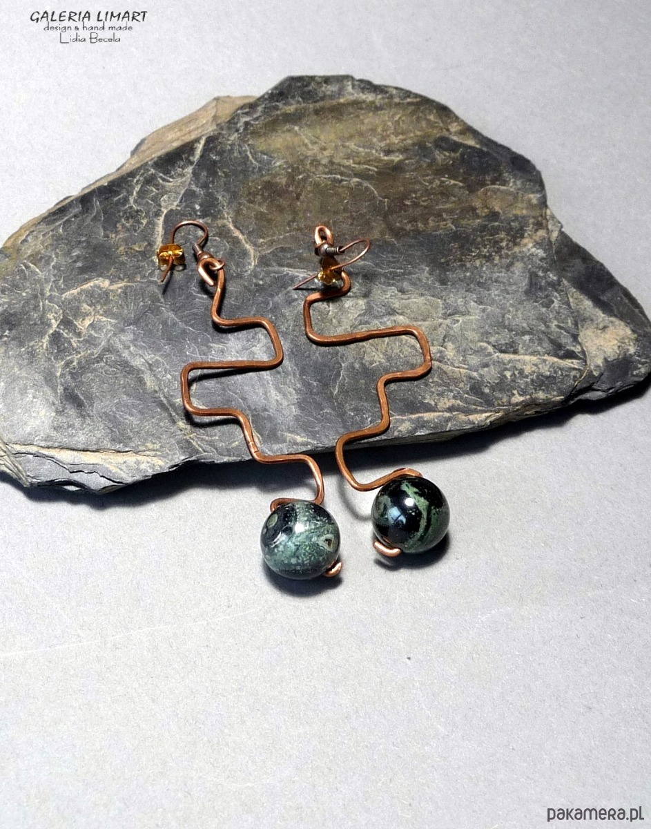 Miedziane kute kolczyki z jaspisem kambaba Unikaty super prezent handmade