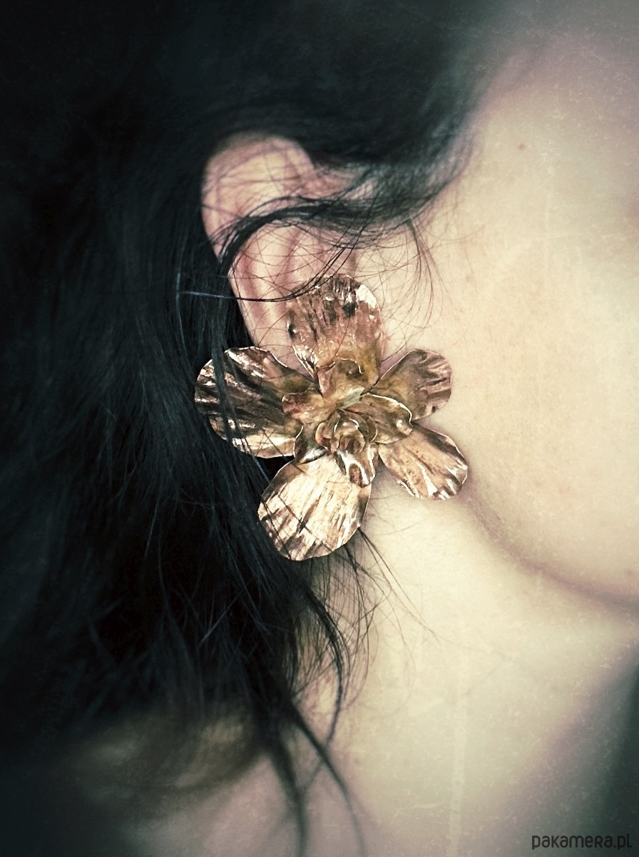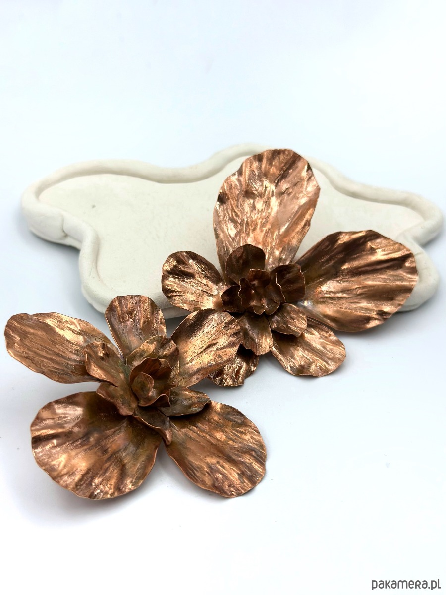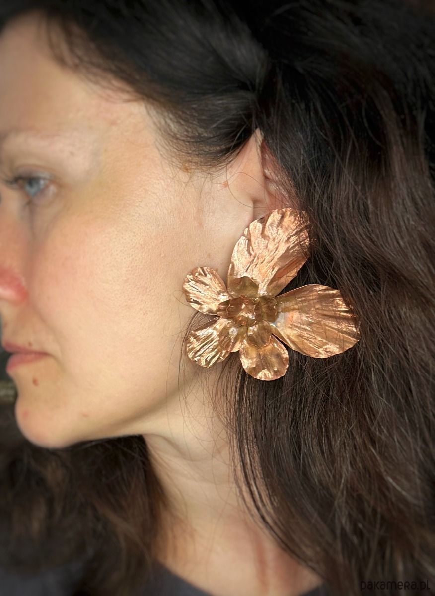 Ręcznie wykonane, rzeźbiarskie kolczyki z miedzi, które swoim kształtem przyciągają uwagę niczym małe dzieła sztuki. Każdy płatek został indywidualnie uformowany, młotkowany i wygładzany, dzięki czemu biżuteria zyskała organiczną, żywą strukturę. Delikatny połysk miedzi sprawia, że kolczyki subtelnie zmieniają się w świetle, podkreślając unikalność formy.