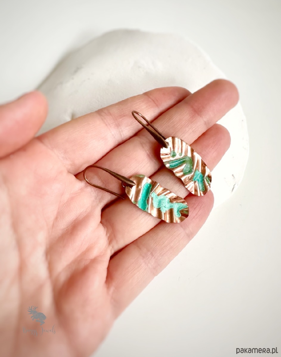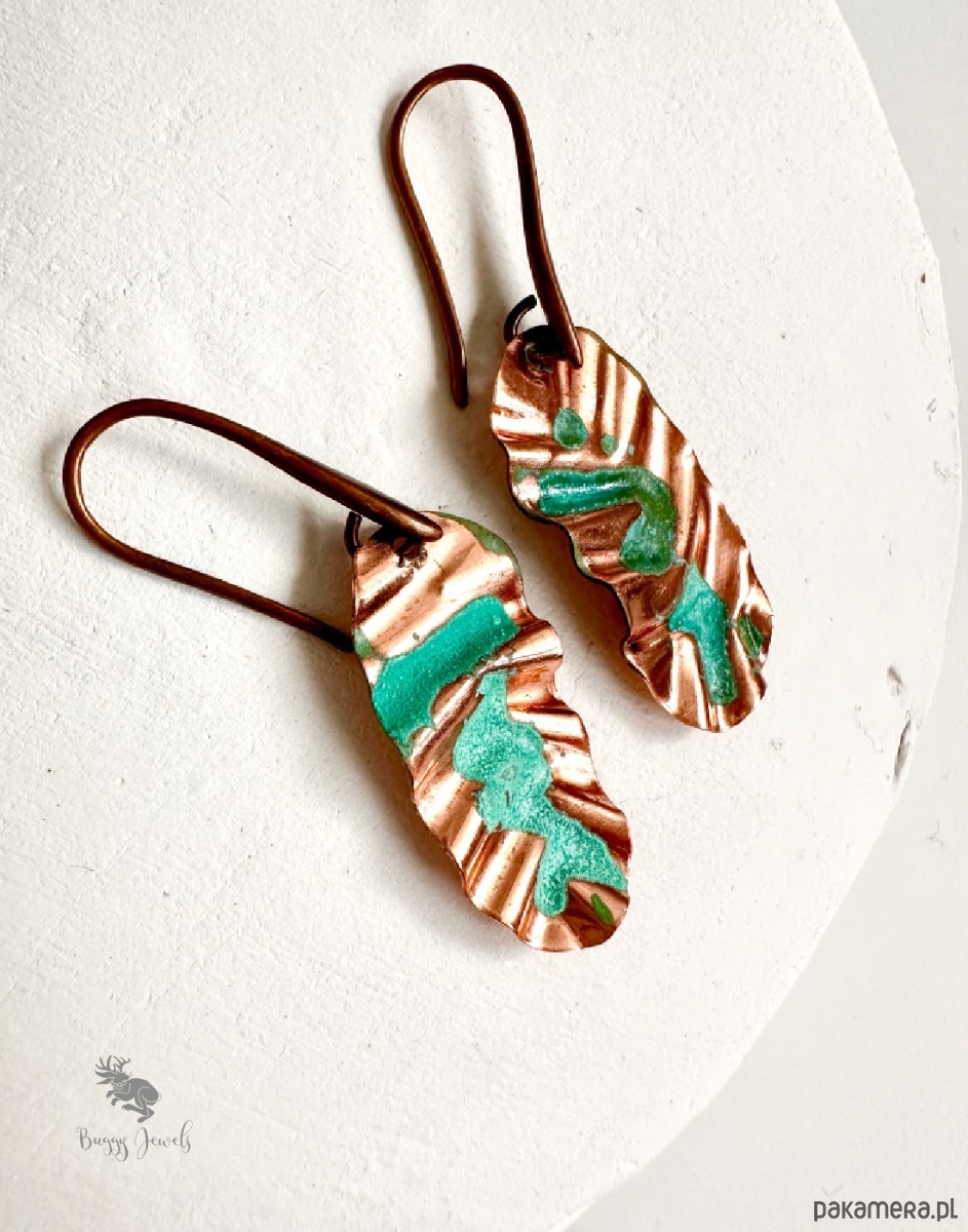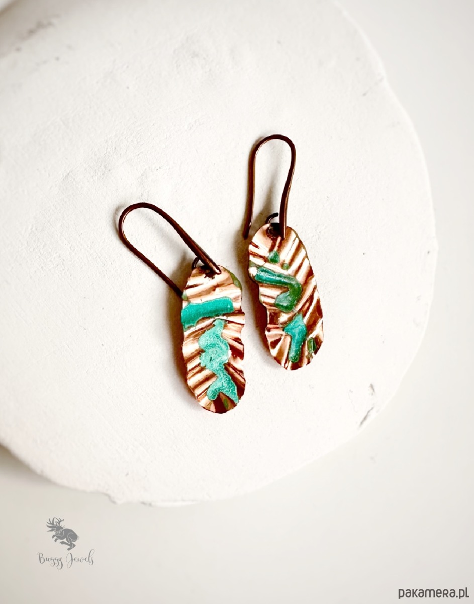 Miedziane kolczyki, fakturowane i patynowane zieloną patyną.