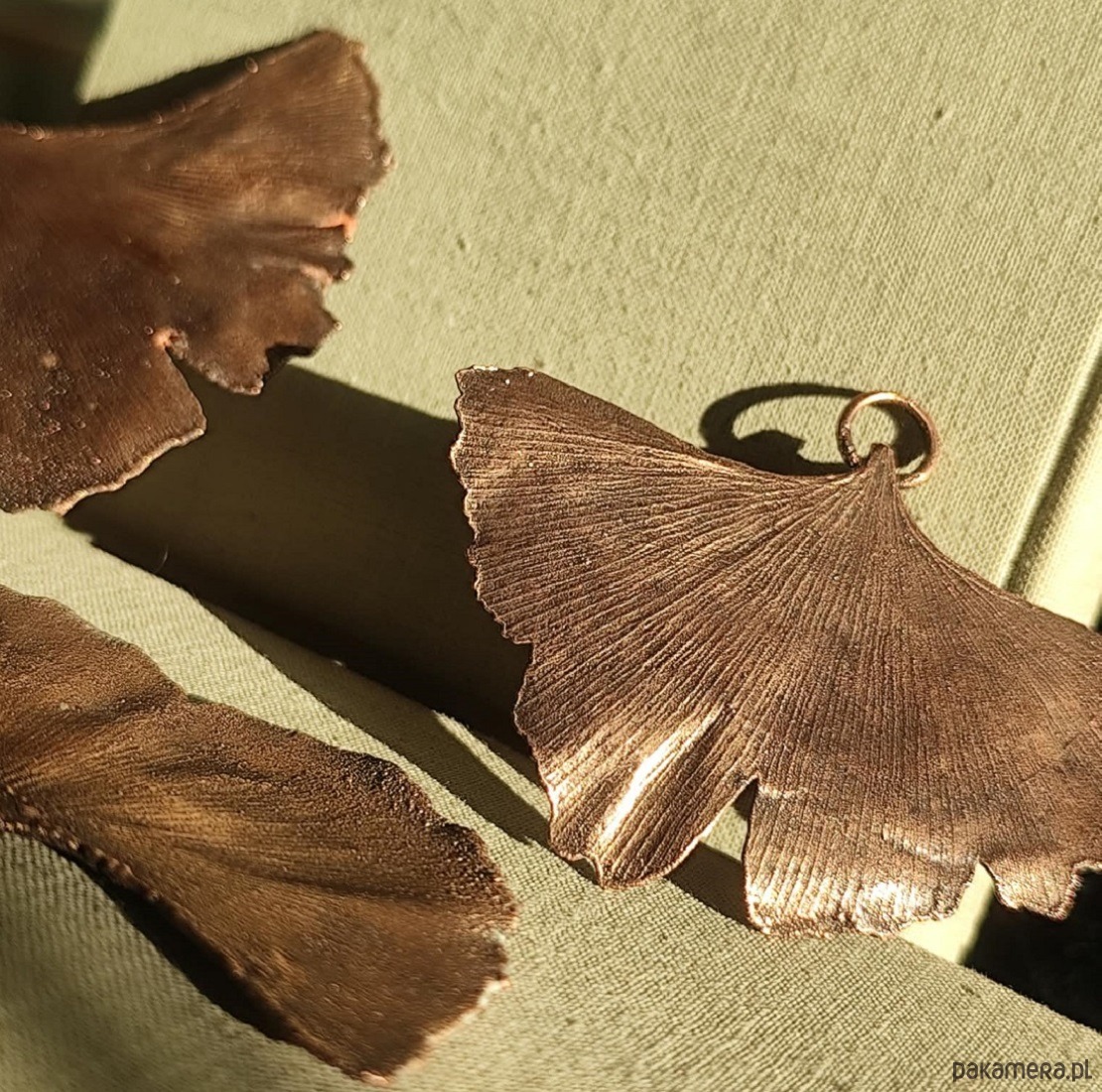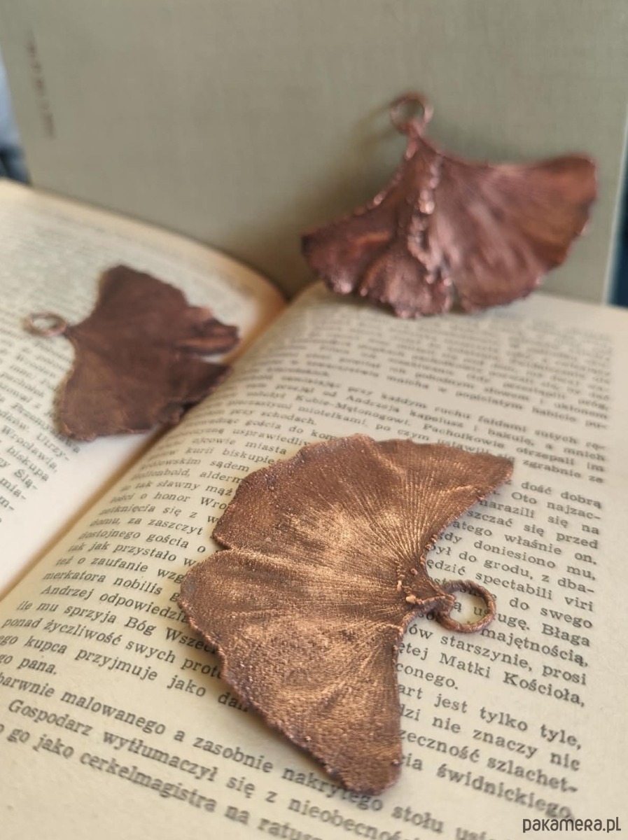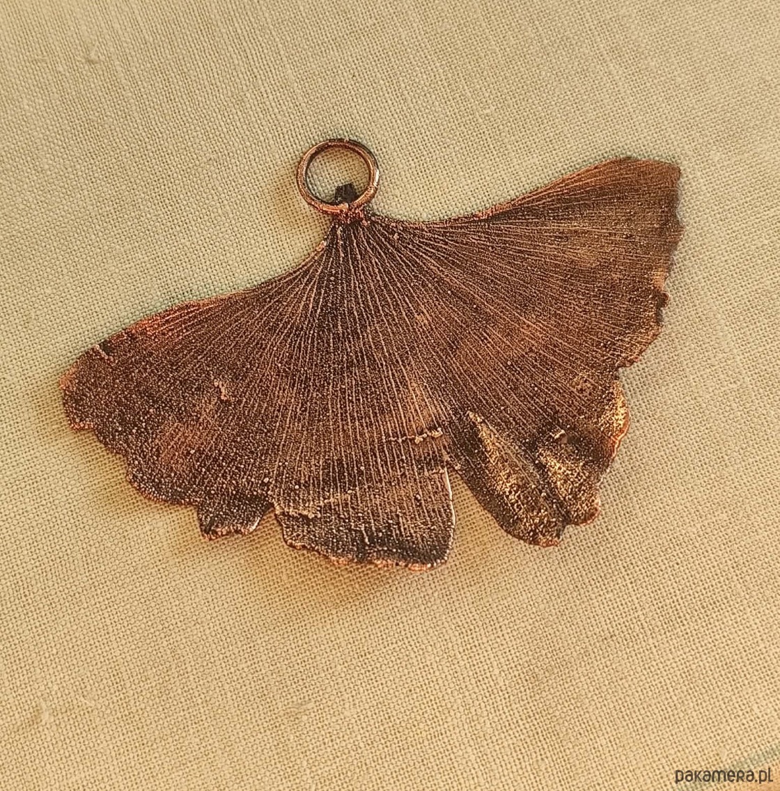 Liść miłorzębu dwuklapowego (Ginko biloba) pokryty warstwą ręcznie polerowanej miedzi uzyskaną w procesie galwanizacji.