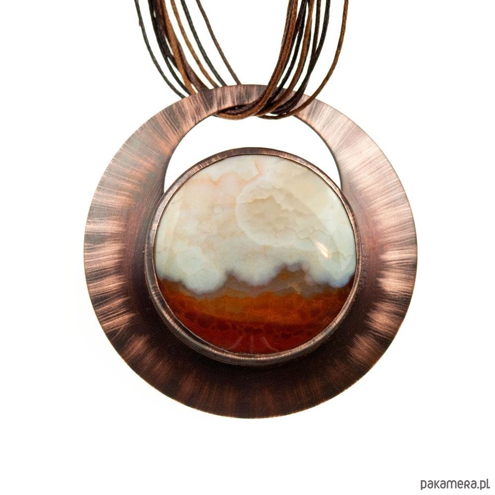 Wisior został wykonany ręcznie z blachy miedzianej i okrągłego agatu. Kamień ma średnicę ok. 40-45 mm i cechuje się wybarwieniem, które przywodzi na myśl intensywny wybuch wulkanu lub chmury unoszące się nad pustynią. W procesie tworzenia wisiora blacha była polerowana, matowiona, a następnie malowana oksydą i przecierana, dzięki czemu powstał niepowtarzalny efekt kolorystyczny. Blacha otaczająca agat jest lekko wypukła oraz zabezpieczona warstwą ochronną. Miedziane koło, którego centralnym elementem jest jedyny w swoim rodzaju agat, ma średnicę ok 7 cm.