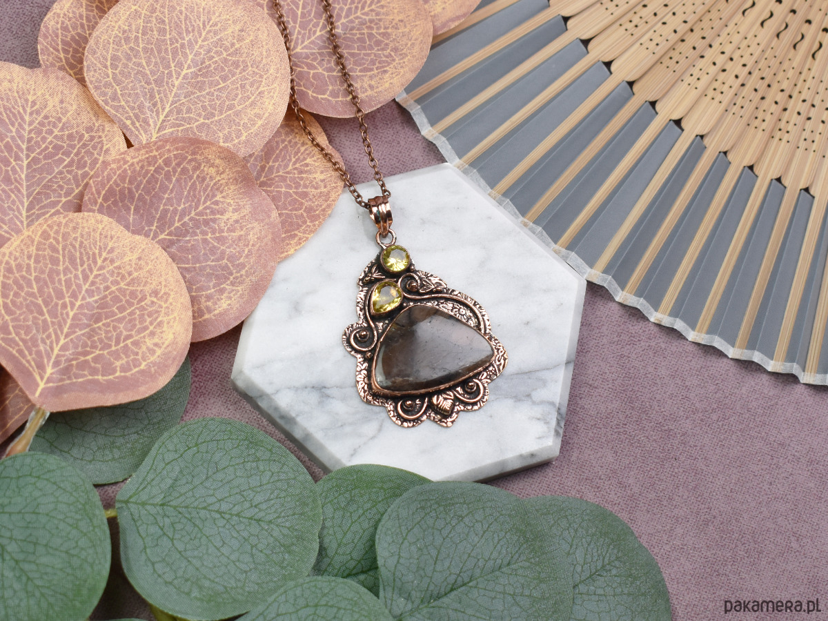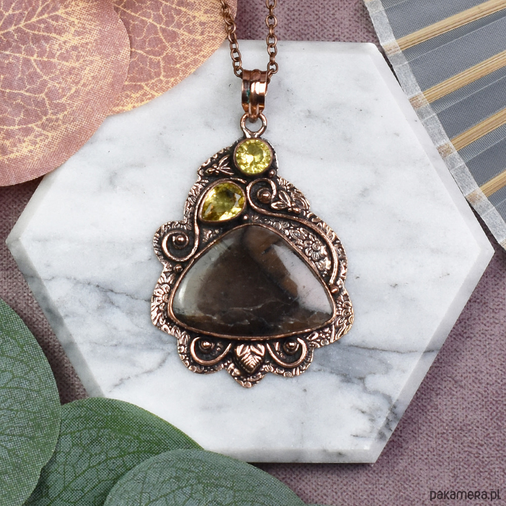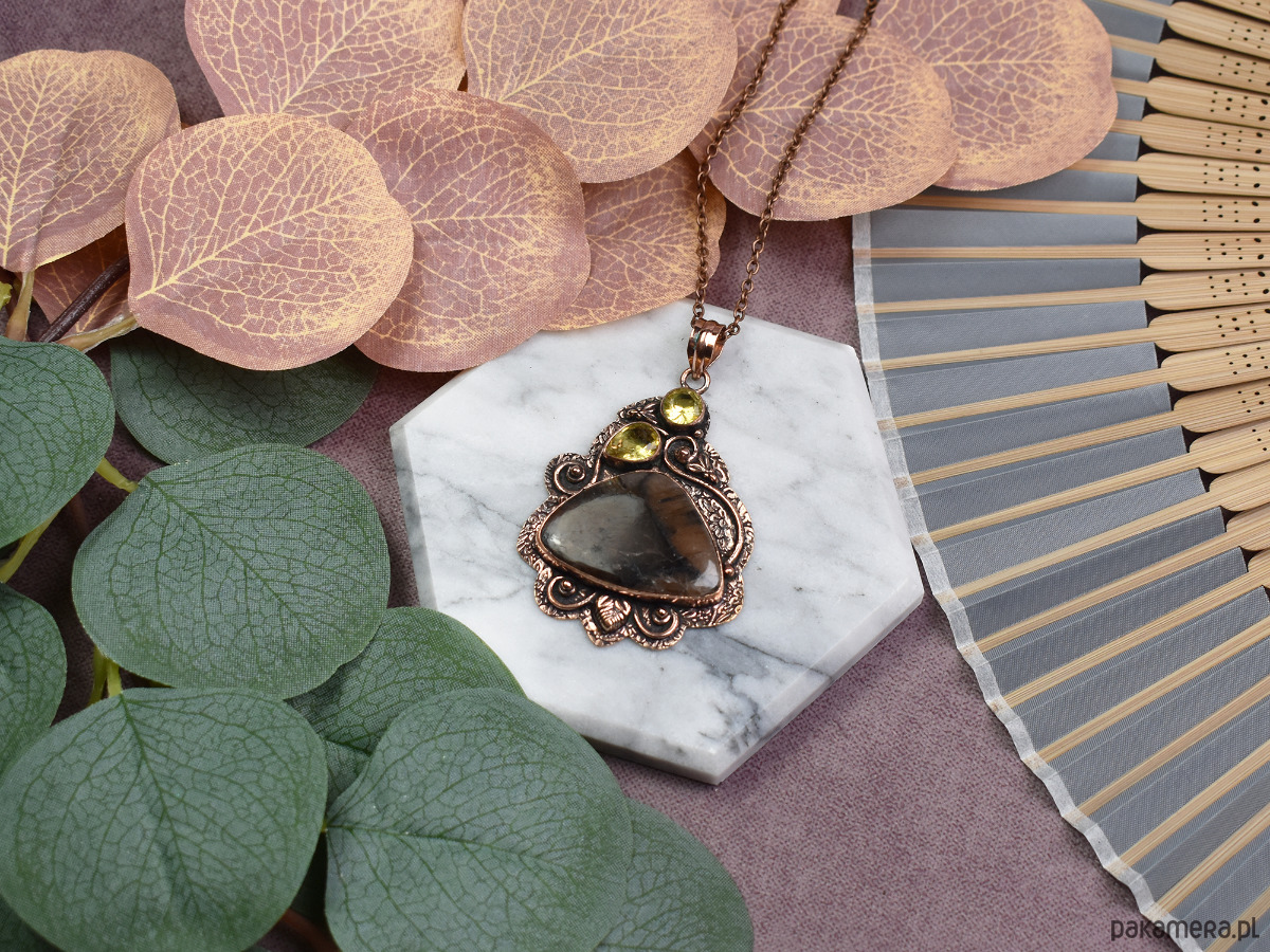 Miedziany ozdobny wisiorek z jaspisem i cytrynem #568