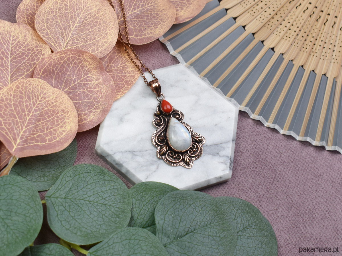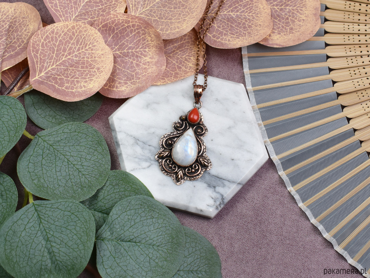 Miedziany ozdobny wisiorek z kamieniem księżycowym i koralem #547