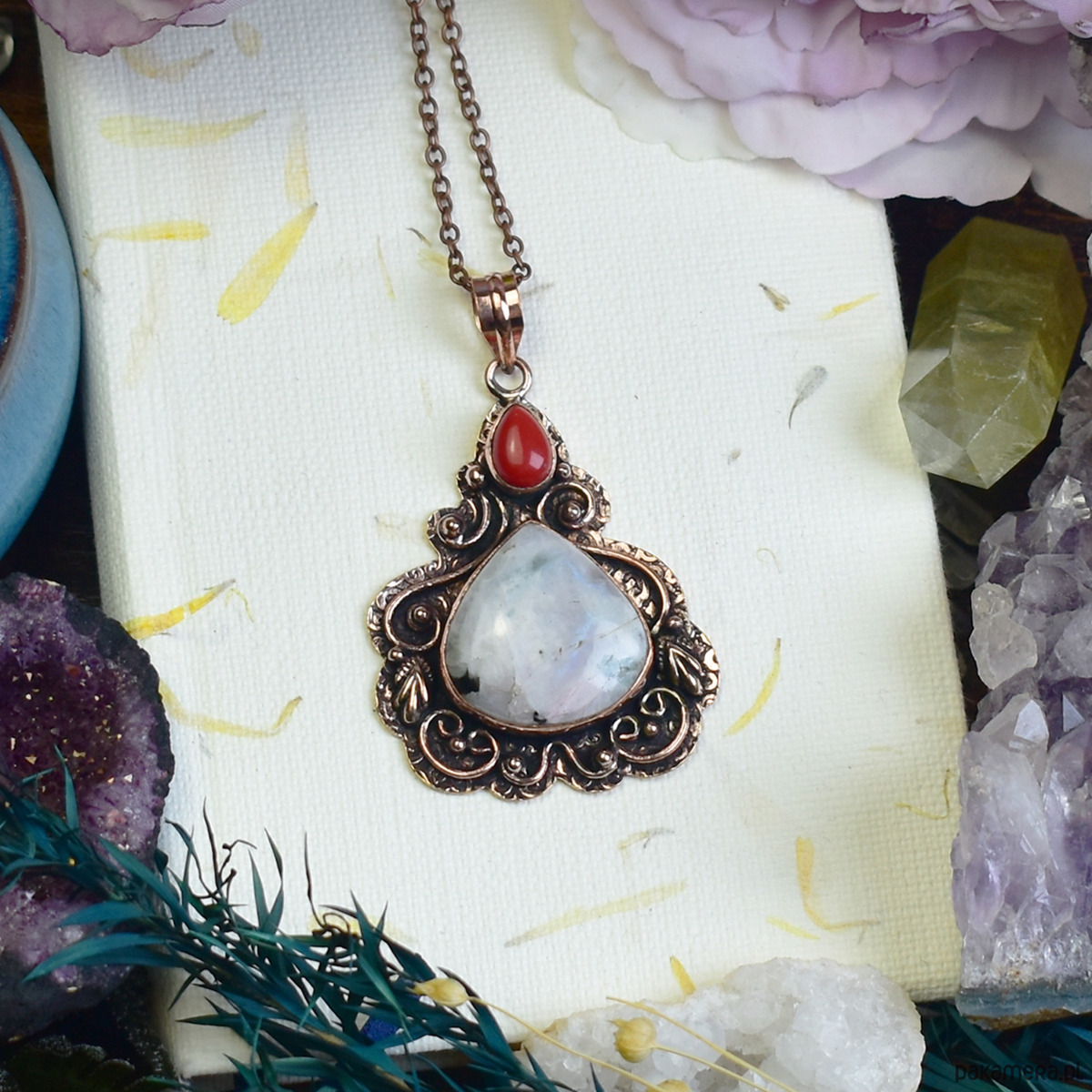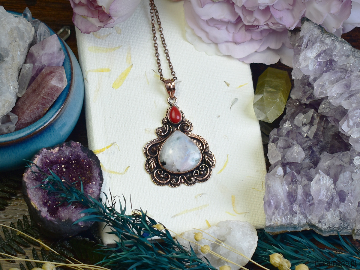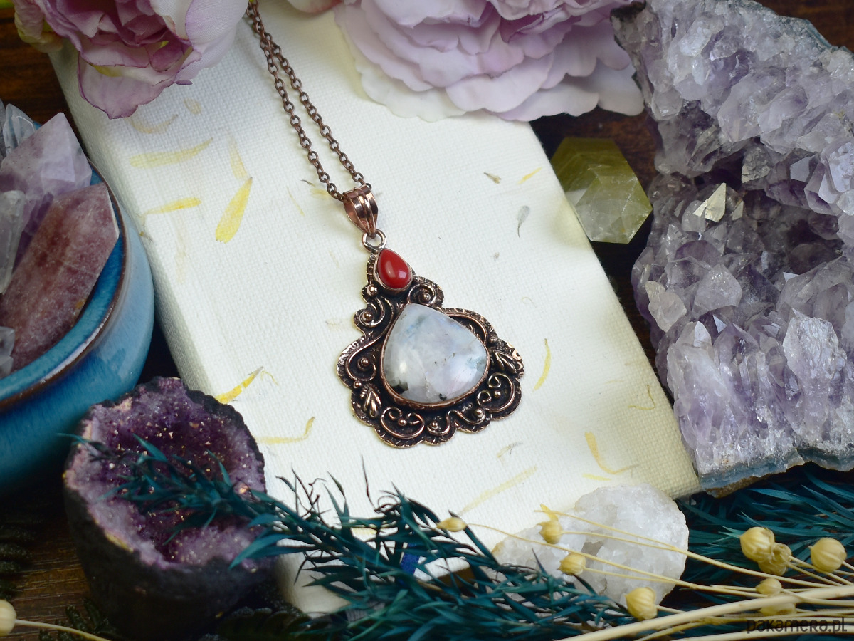 Miedziany ozdobny wisiorek z kamieniem księżycowym i koralem