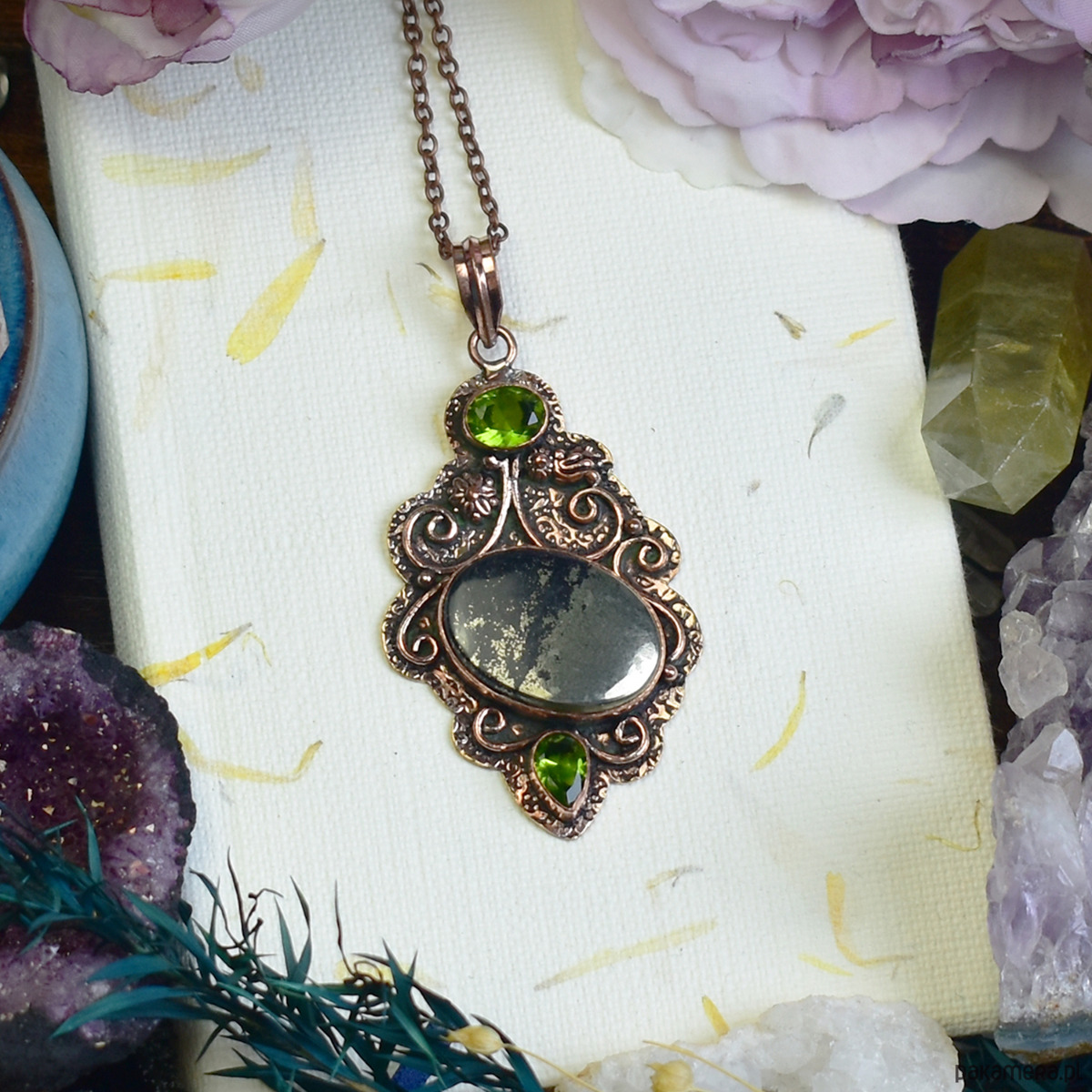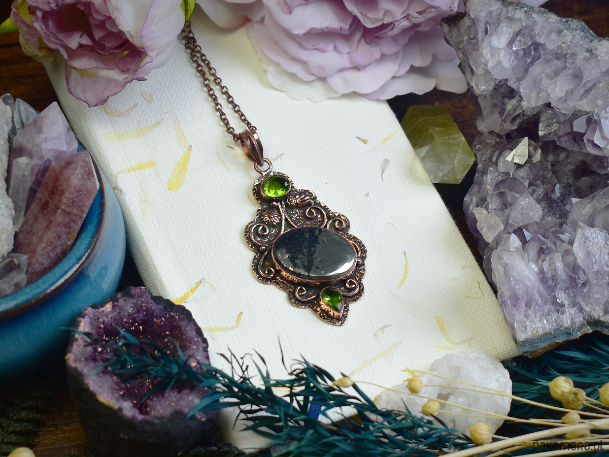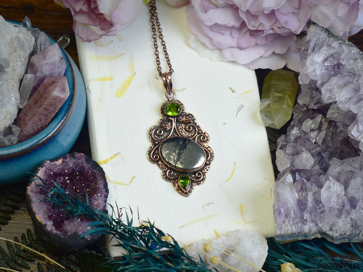 Unikatowy miedziany wisiorek z apache pirytem i peridotem, wykonany tradycyjnymi metodami. Apache piryt, znany ze swojego metalicznego połysku i surowego charakteru, symbolizuje siłę oraz ochronę. Peridot, kamień o świeżym zielonym odcieniu, wspiera wewnętrzną harmonię i pozytywną energię. Połączenie tych minerałów nadaje wisiorkowi niepowtarzalny wygląd i mistyczny charakter. Idealny dla osób ceniących biżuterię inspirowaną naturą i duchowością.