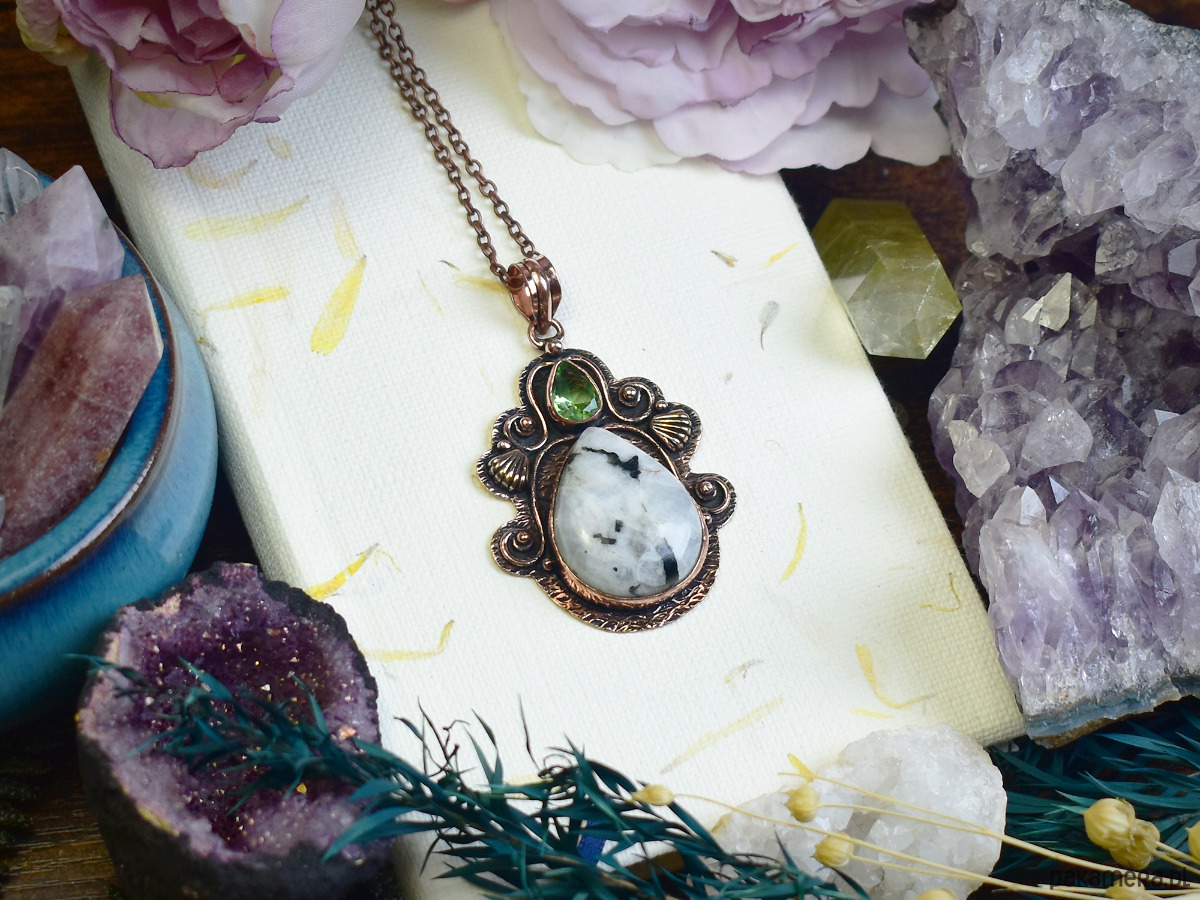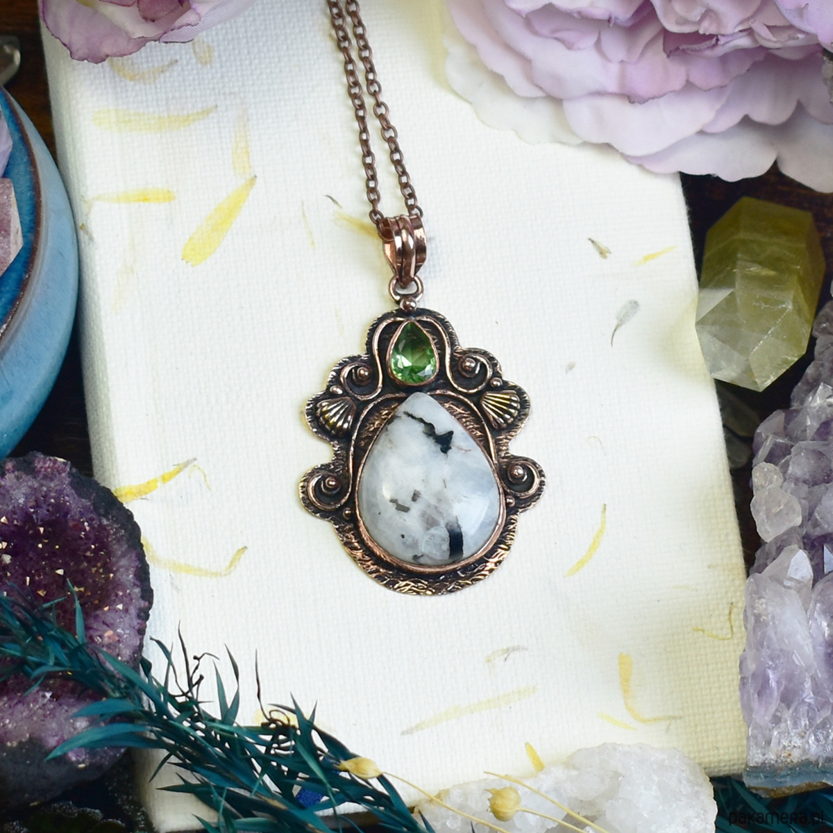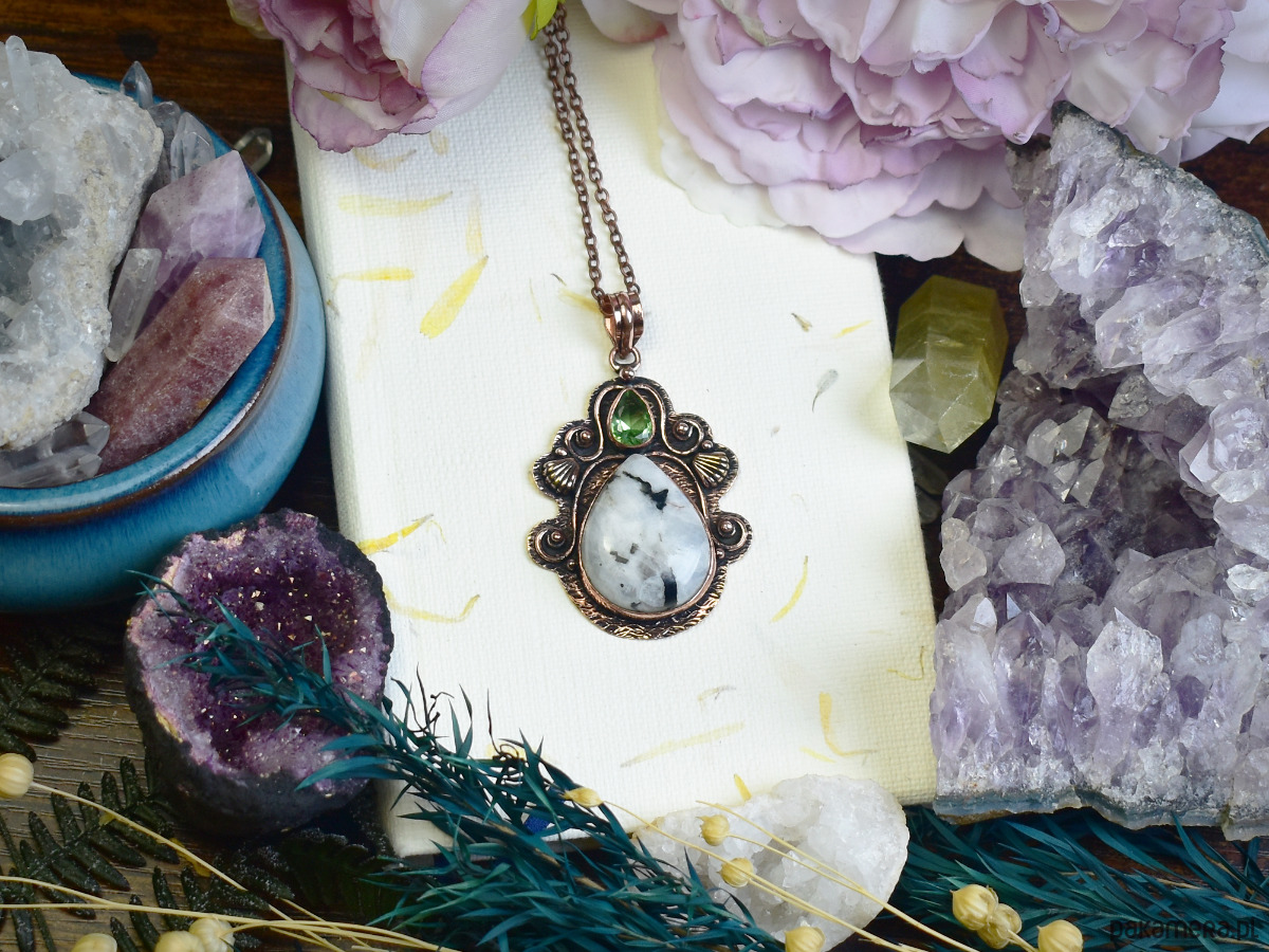 Miedziany ozdobny wisiorek z kamieniem księżycowym i peridotem