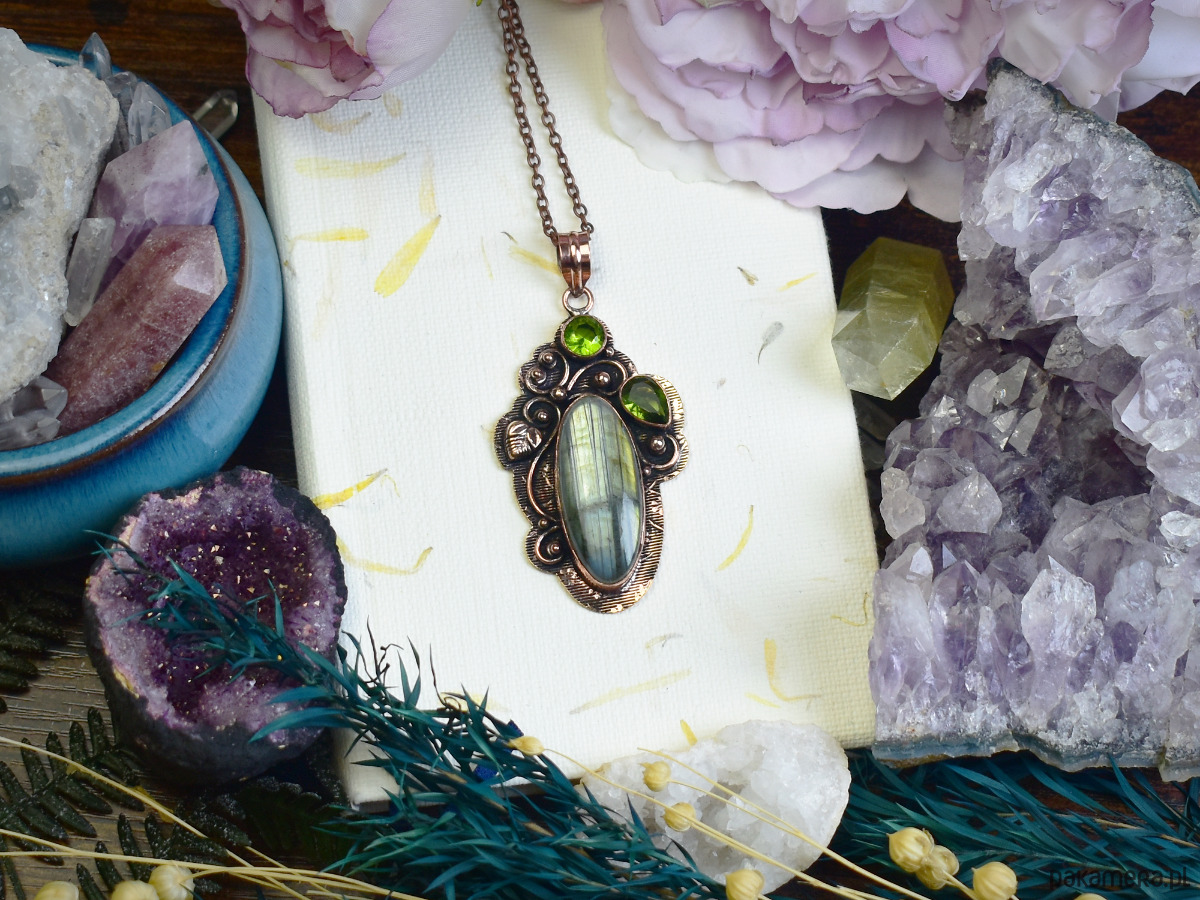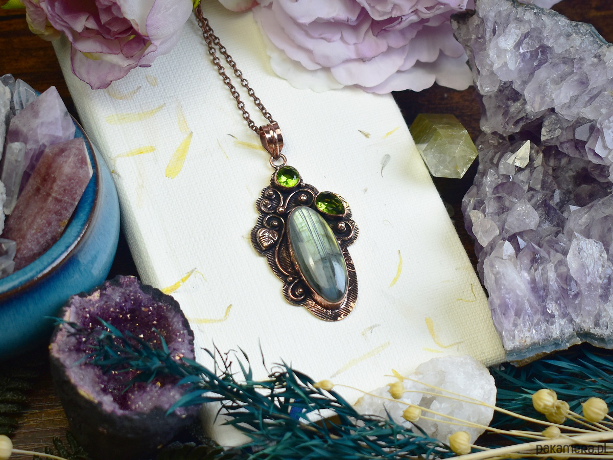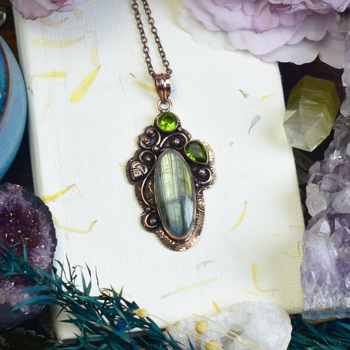 Miedziany ozdobny wisiorek z labradorytem i zielonym kwarcem