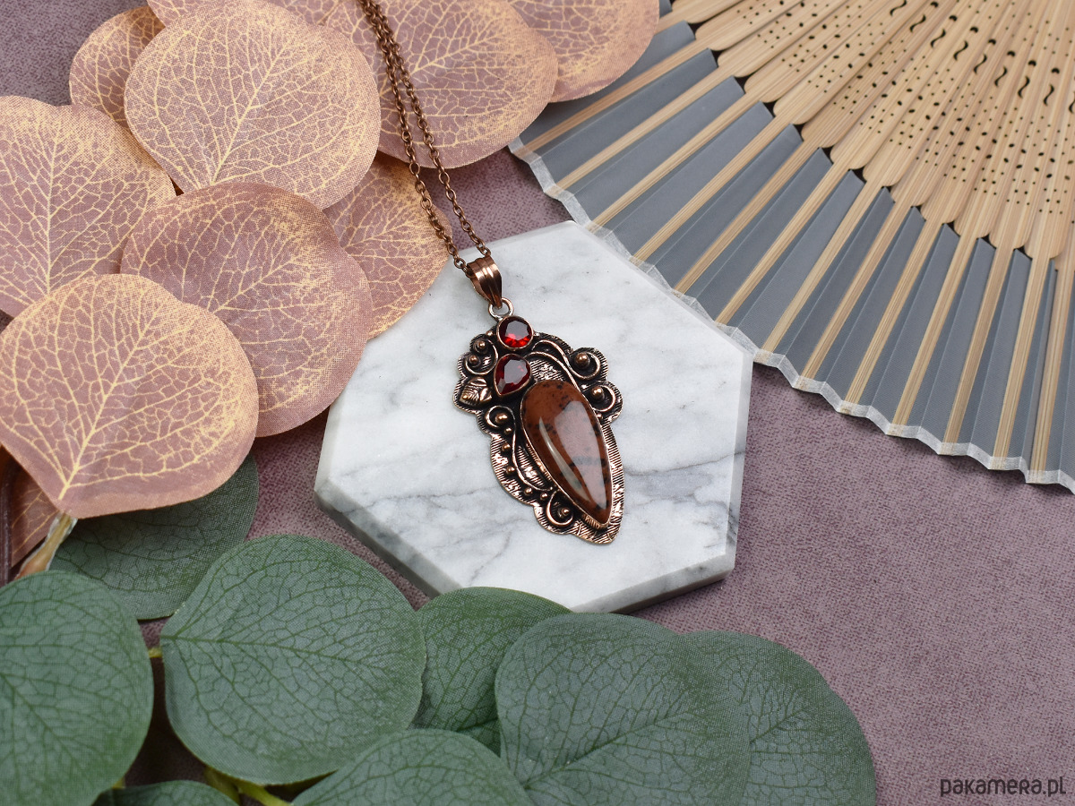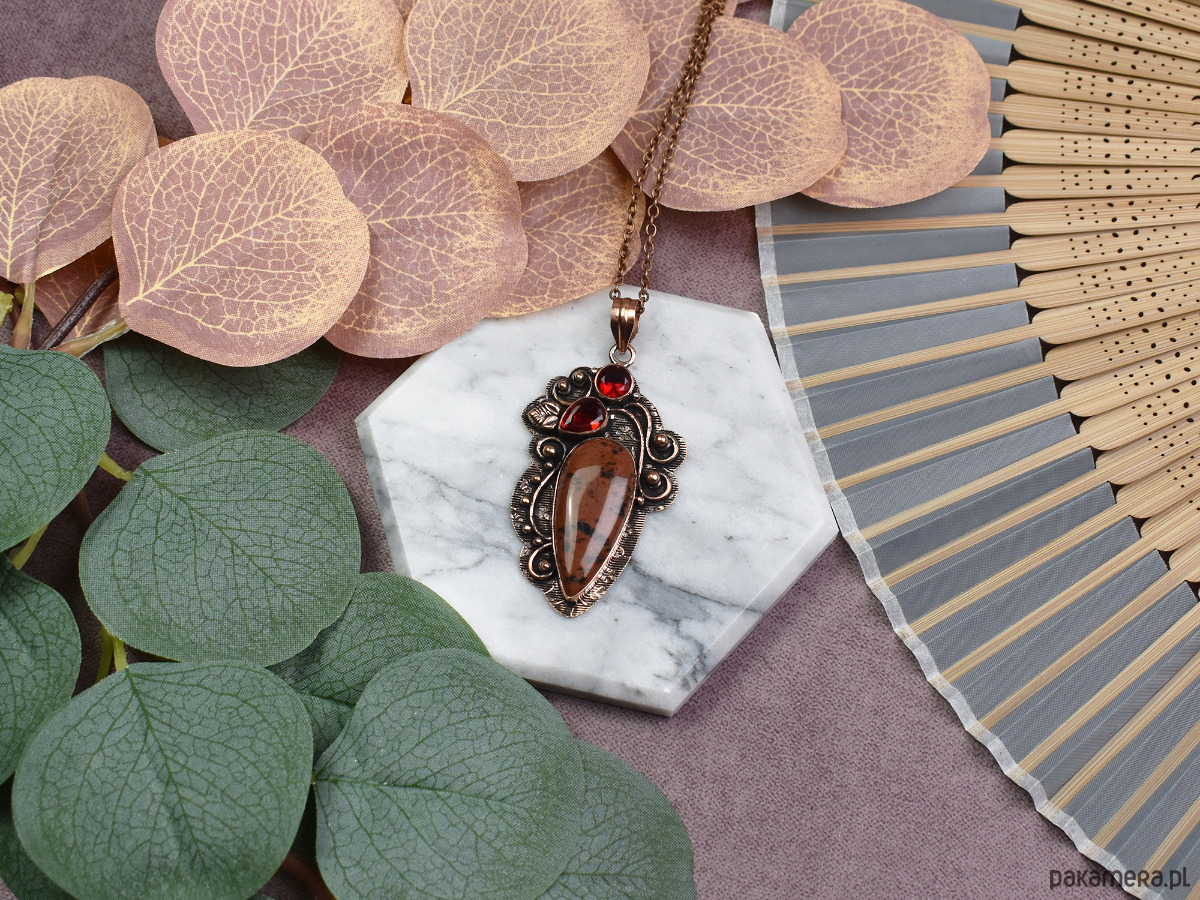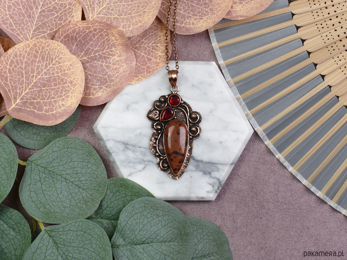 Miedziany ozdobny wisiorek z obsydianem mahoniowym i granatem #543