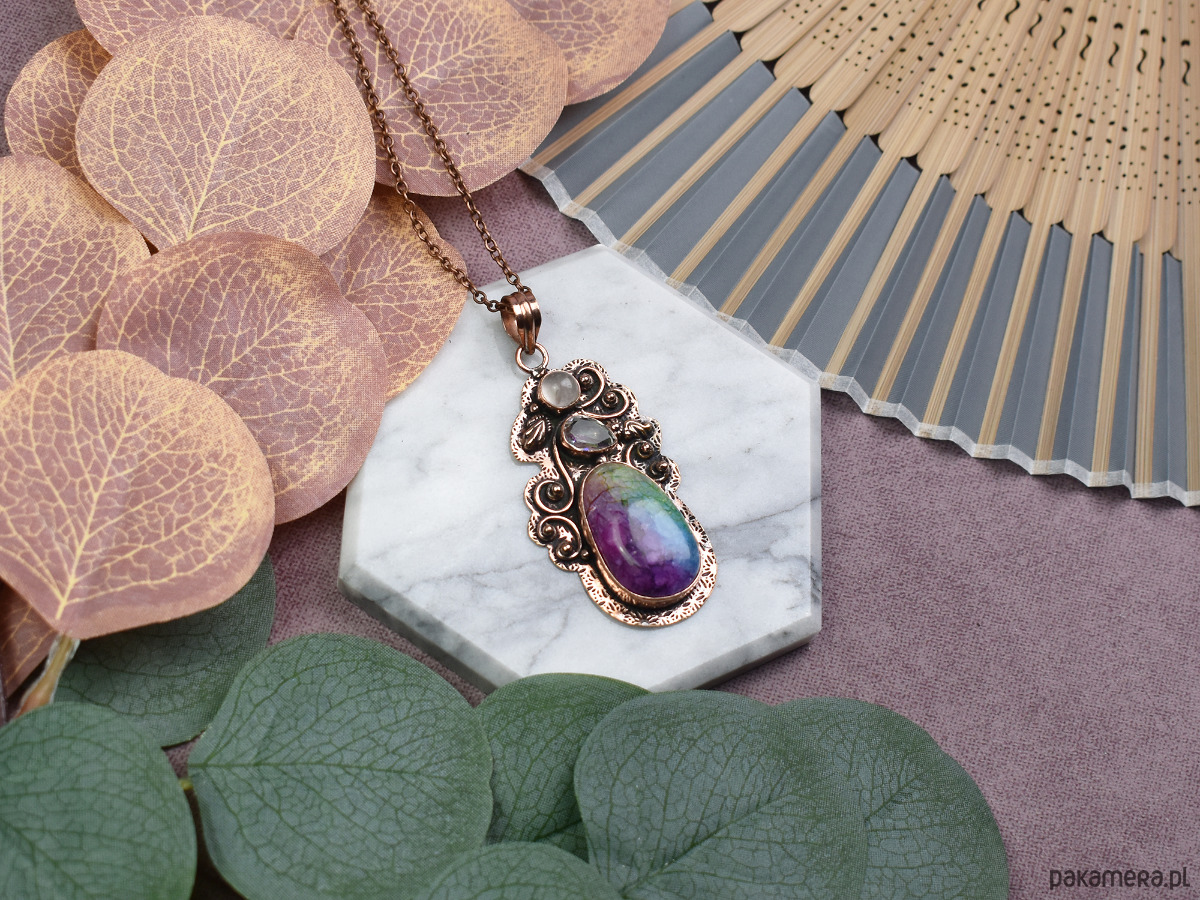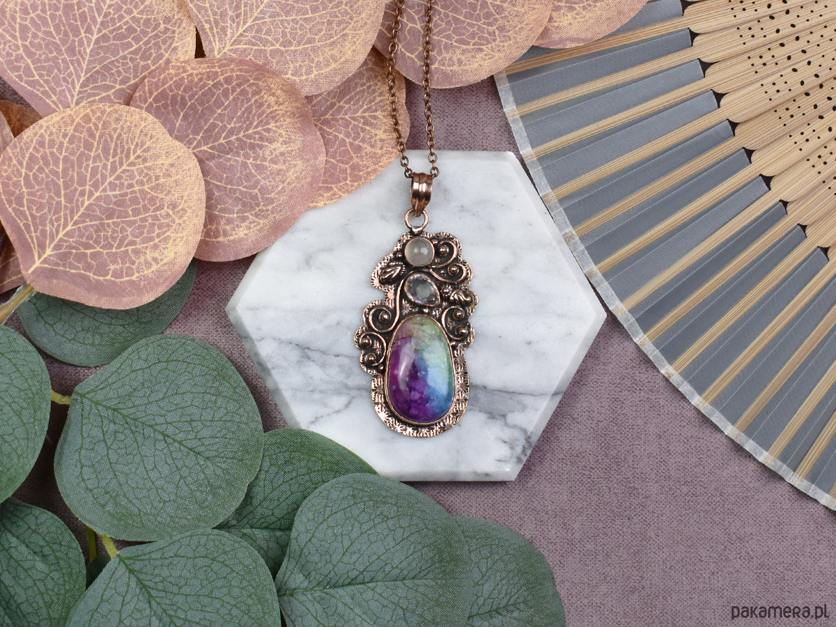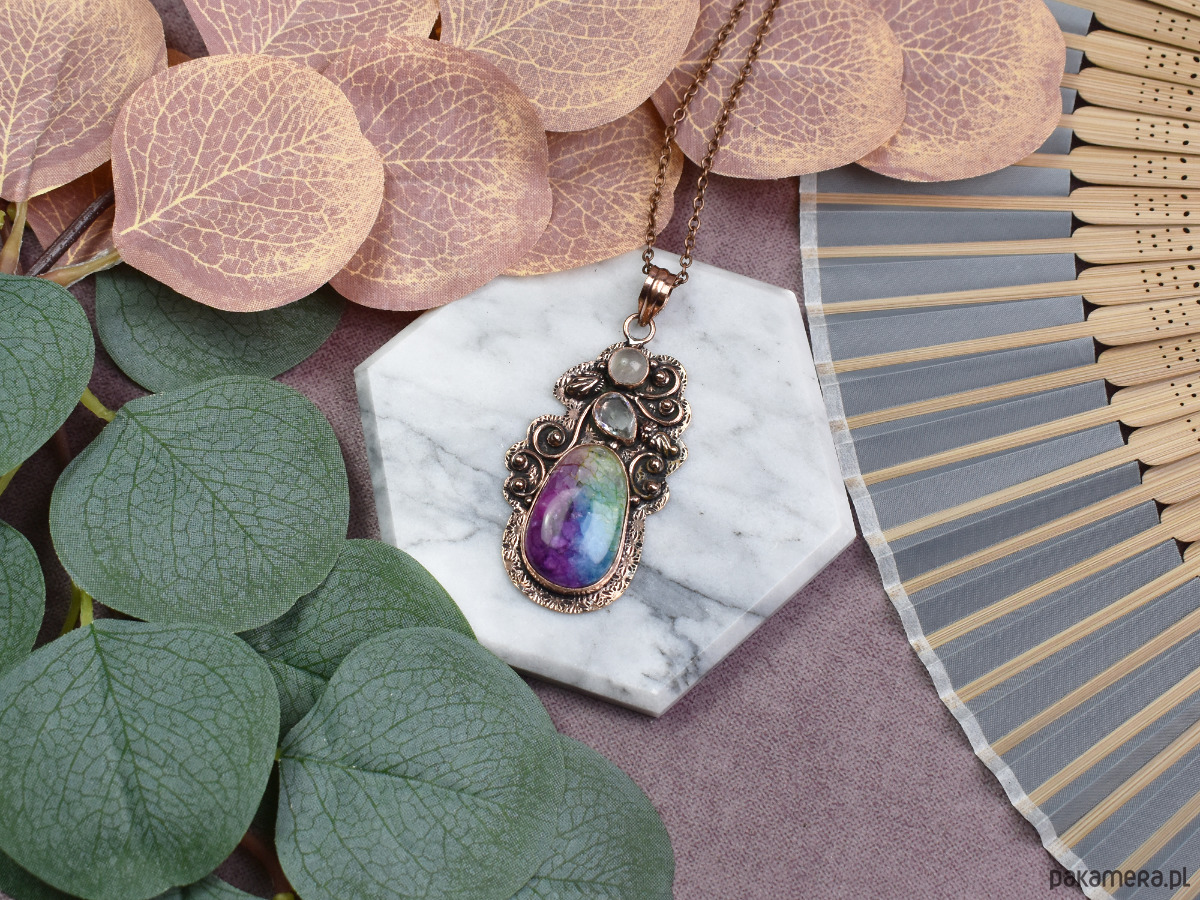 Miedziany ozdobny wisiorek z tęczowym kwarcem solarnym i różowym kwarcem #546