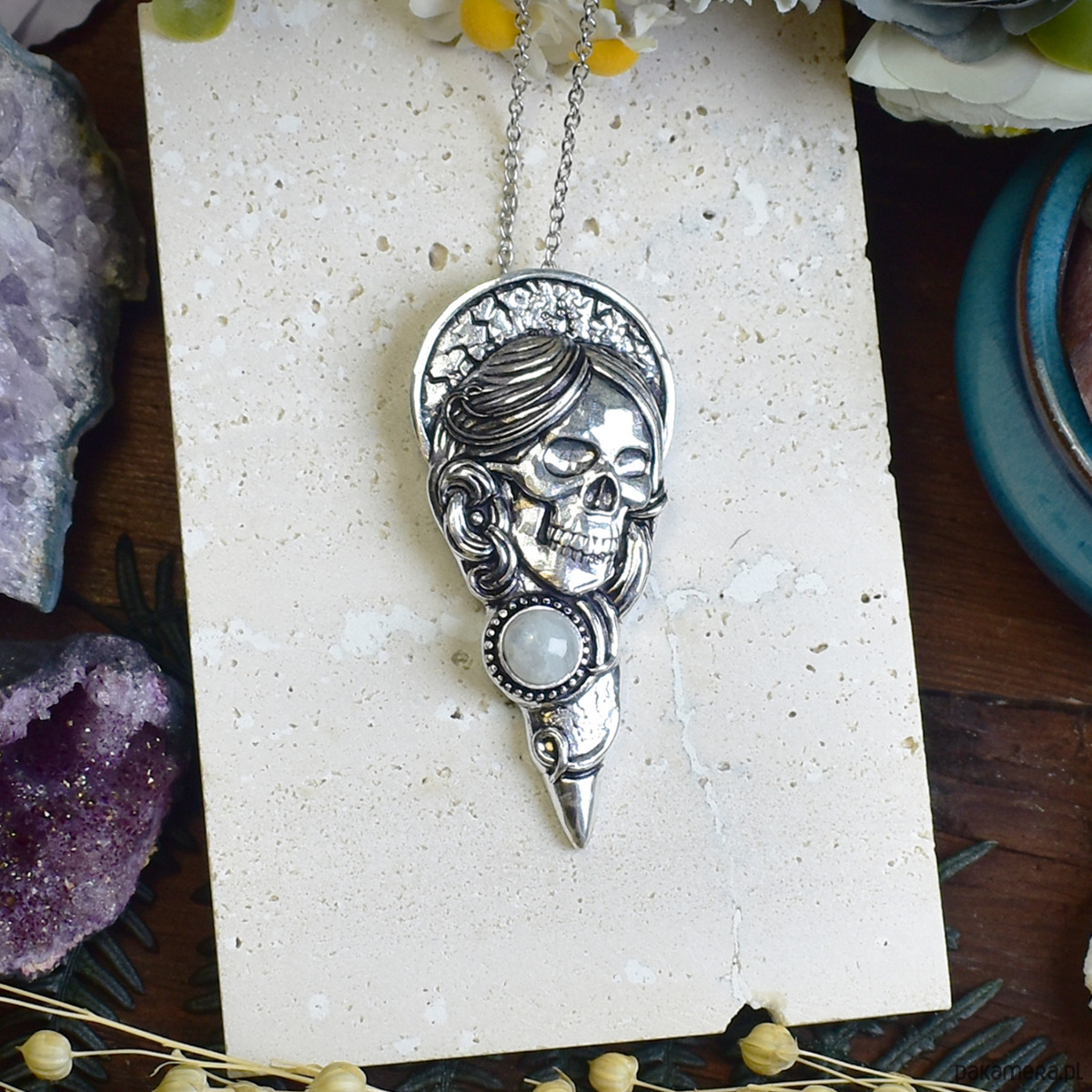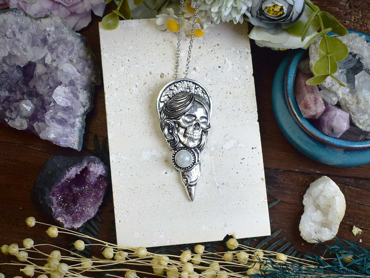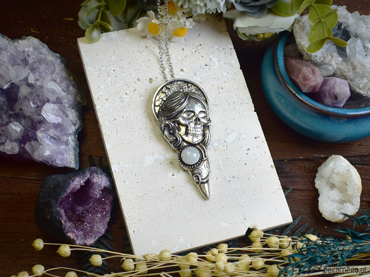 Miedziany posrebrzany ciężki wisior Dead Madonna z kamieniem księżycowym