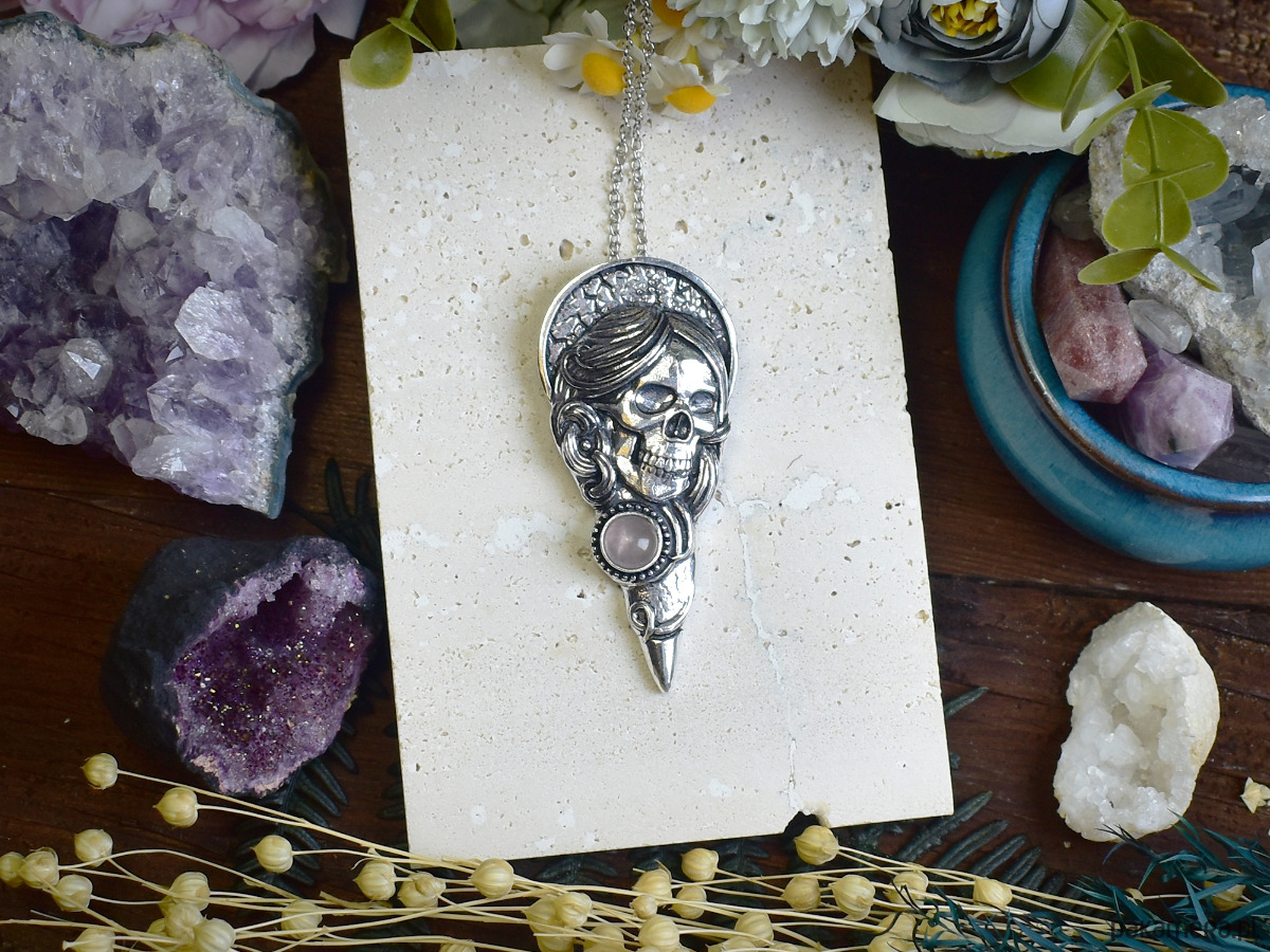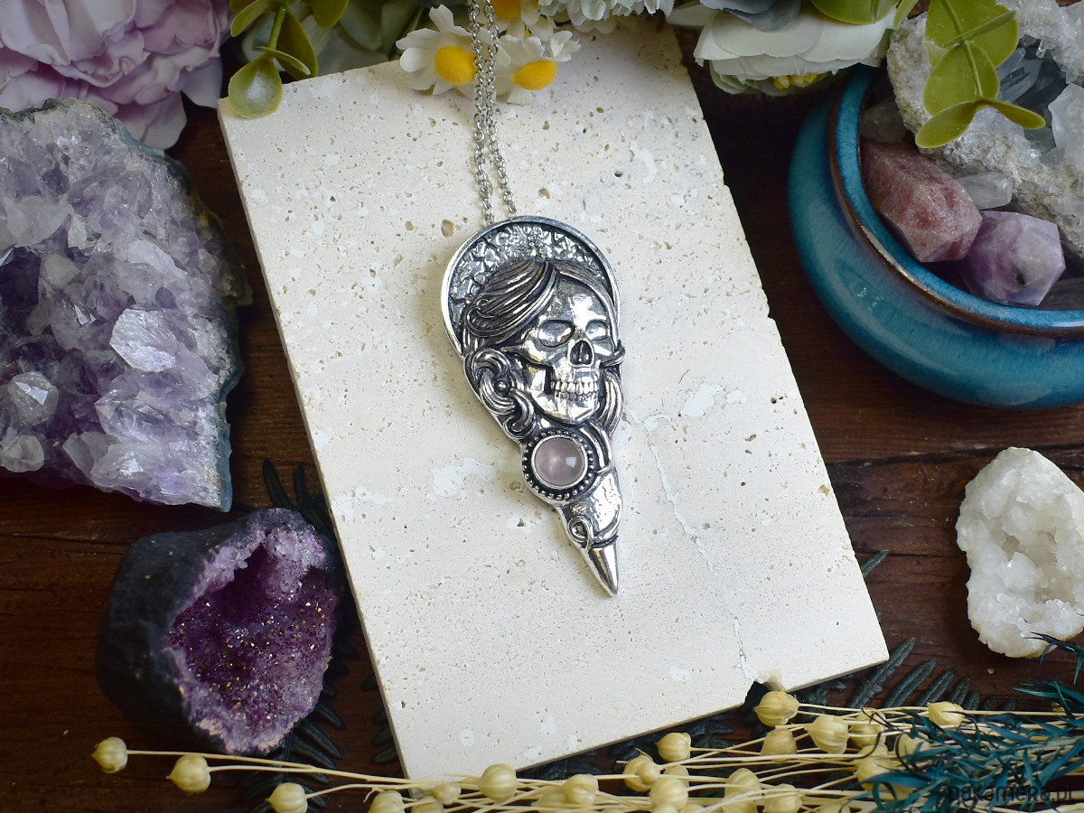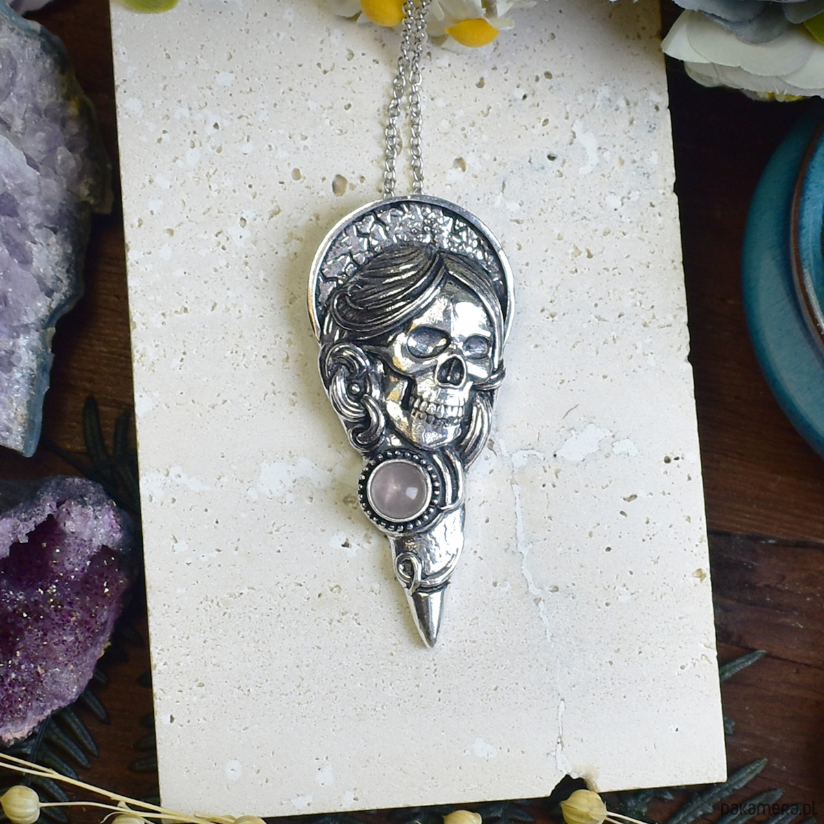 Miedziany posrebrzany ciężki wisior Dead Madonna z kwarcem różowym