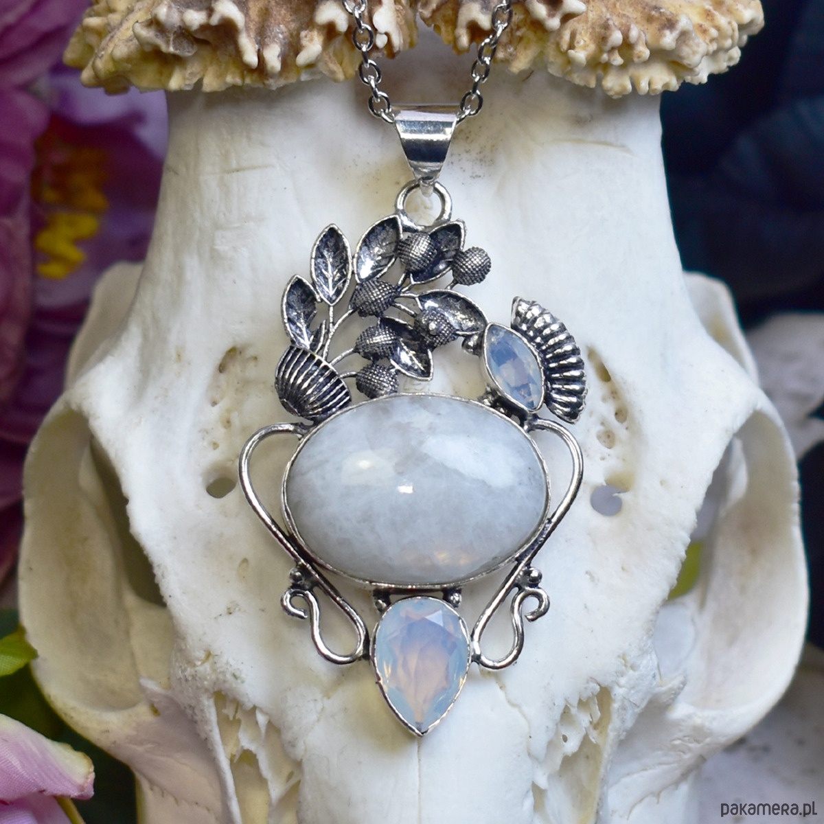 Miedziany wisiorek pokryty srebrem, wykonany tradycyjnymi metodami rzemieślniczymi, ozdobiony dużym kamieniem księżycowym o mlecznej barwie i subtelnym, perłowym połysku. Centralny kamień otaczają drobne opality, które dodają kompozycji delikatnego blasku i lekko eterycznego charakteru. Całość uzupełnia ozdobny motyw roślinny inspirowany liśćmi i pąkami, nadający wisiorkowi organiczny, dekoracyjny wygląd. Płynne linie oprawy i starannie dopracowane detale tworzą harmonijną formę, w której naturalność kamieni łączy się z elegancją. Kamień księżycowy kojarzony jest z intuicją, spokojem i równowagą emocjonalną, a jasna kolorystyka w połączeniu ze srebrzystym wykończeniem nadaje biżuterii łagodny, ponadczasowy charakter. To wyjątkowy wisiorek dla osób ceniących rękodzieło, roślinne motywy i subtelną, romantyczną estetykę.