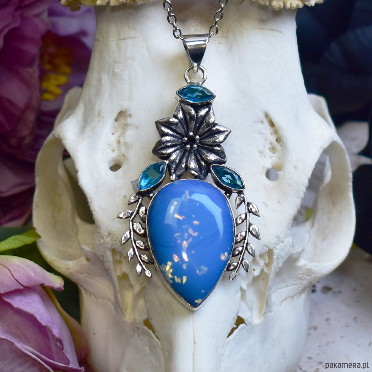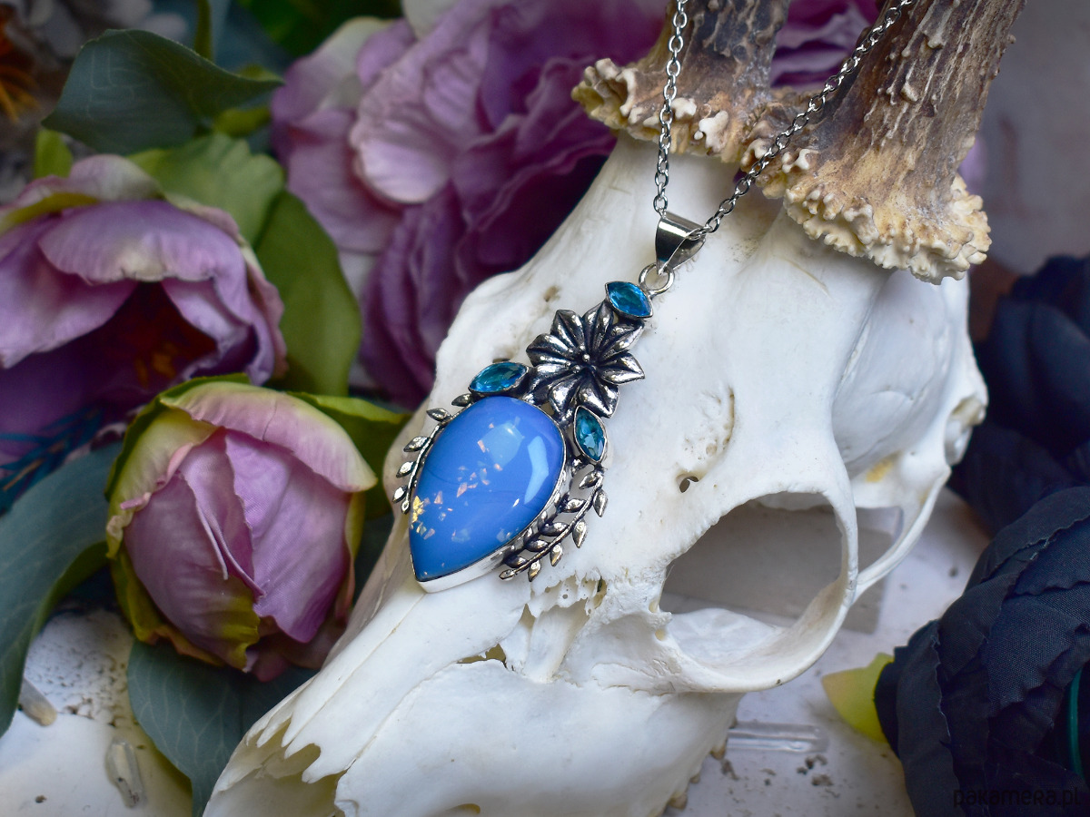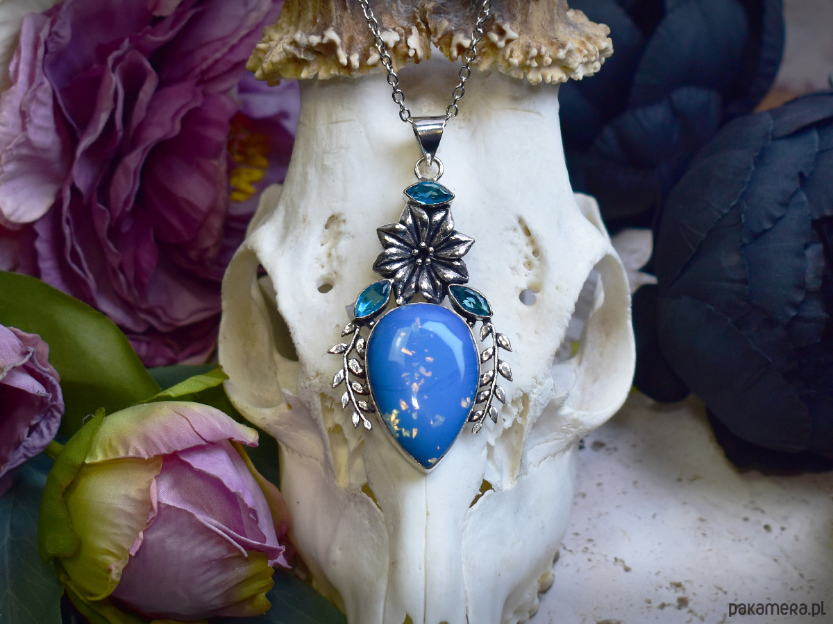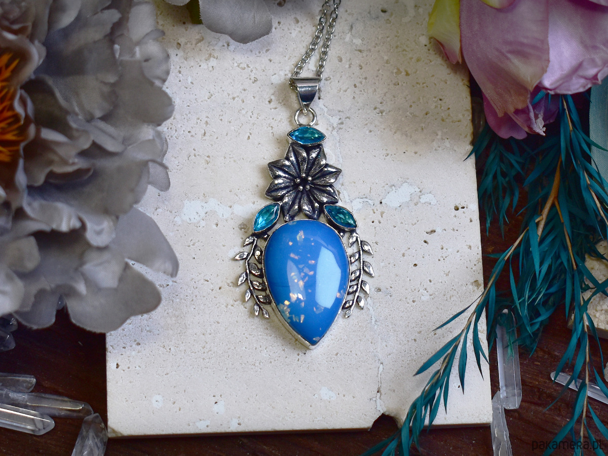 Miedziany wisiorek pokryty srebrem, wykonany tradycyjnymi metodami rzemieślniczymi, ozdobiony niebieskim opalem dubletowym o intensywnej, mleczno-błękitnej barwie i delikatnych refleksach światła. Centralny kamień otaczają syntetyczne topazy w chłodnym, turkusowo-niebieskim odcieniu, które dodają kompozycji lekkości i subtelnego blasku. Całość zwieńczona jest ozdobnym motywem kwiatu oraz delikatnymi, roślinnymi detalami, nadającymi wisiorkowi dekoracyjny, harmonijny charakter. Płynne linie oprawy łączą klasyczną elegancję z artystycznym wyrazem, tworząc spójną i wyważoną formę. Połączenie opalowego połysku z chłodnymi akcentami kamieni i srebrzystym wykończeniem sprawia, że wisiorek ma wyrafinowany, a jednocześnie lekki charakter, idealny dla osób ceniących rękodzieło i ozdobną biżuterię inspirowaną naturą.