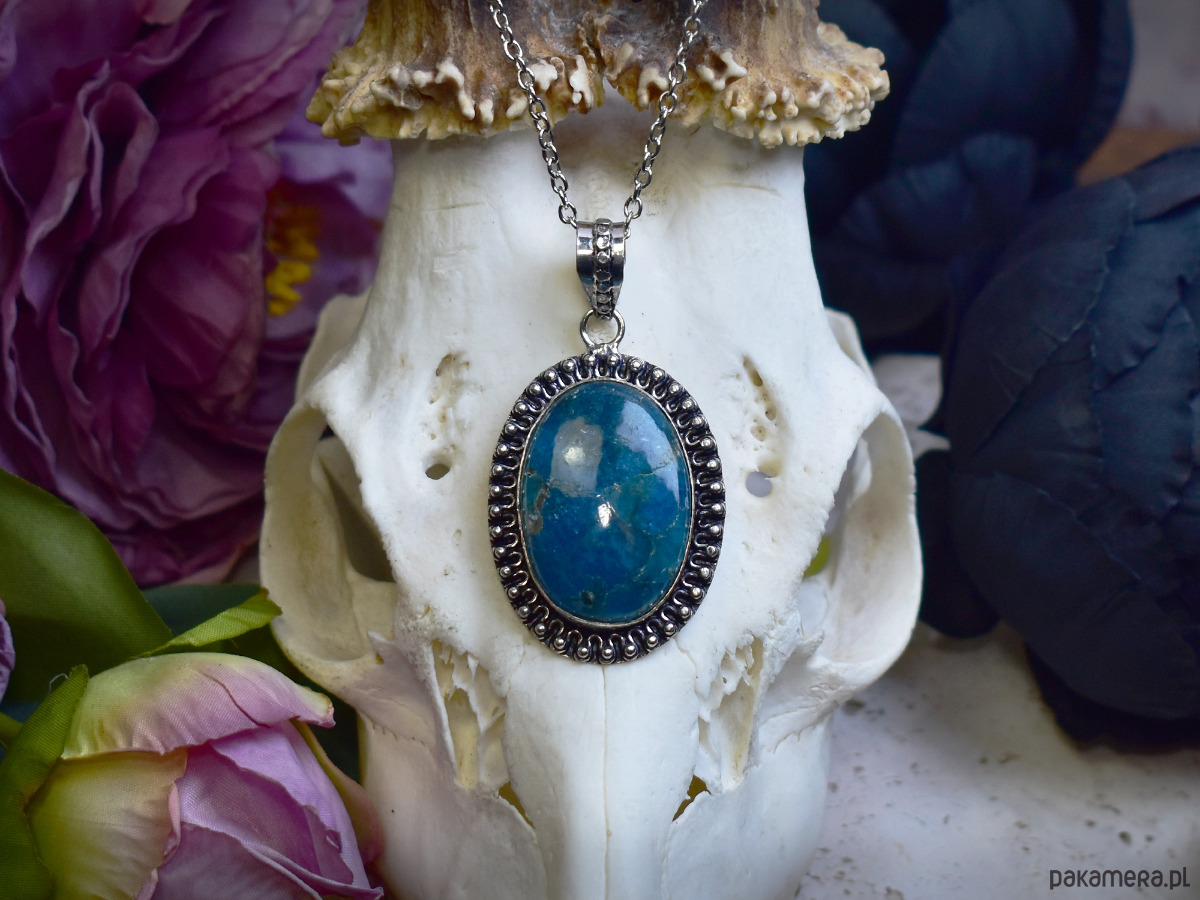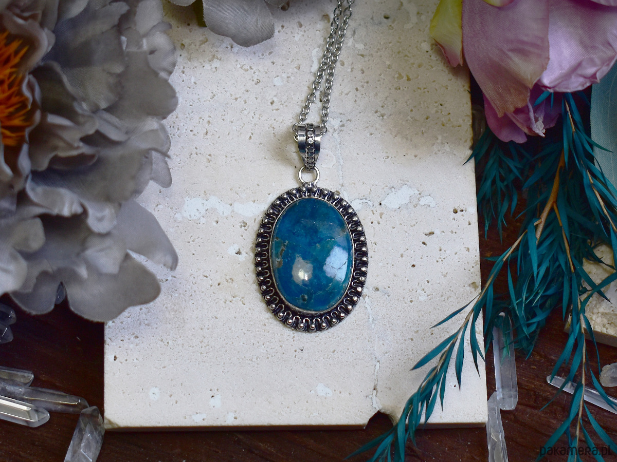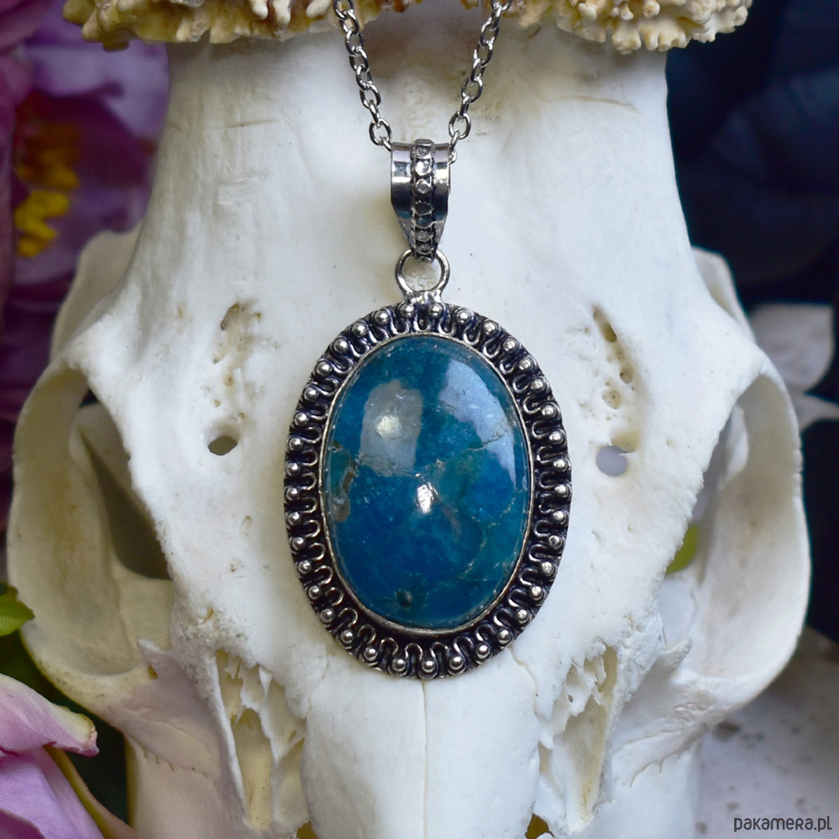 Miedziany wisiorek wykonany tradycyjnymi metodami rzemieślniczymi, ozdobiony apatytetem o intensywnej, głębokiej barwie z delikatnym, naturalnym połyskiem. Kamień przyciąga uwagę swoją wyrazistą kolorystyką, nadając biżuterii świeżości i lekkości. Prosta, elegancka forma oprawy pozwala w pełni wyeksponować naturalne piękno minerału i jego energetyczny charakter. Apatyt kojarzony jest z inspiracją, jasnością myśli i motywacją, wspierając kreatywność oraz wewnętrzną równowagę. Ciepły odcień miedzi harmonijnie współgra z chłodną tonacją kamienia, tworząc elegancki, ponadczasowy wisiorek dla osób ceniących rękodzieło, naturalne kamienie i biżuterię o subtelnym, a zarazem wyrazistym charakterze.