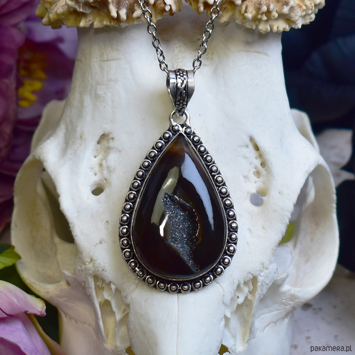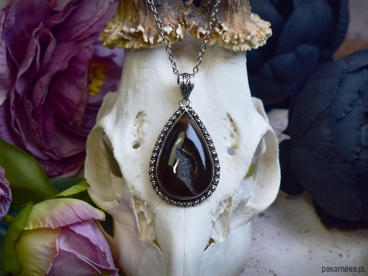 Miedziany posrebrzany wisiorek z czarnym agatem z druzą