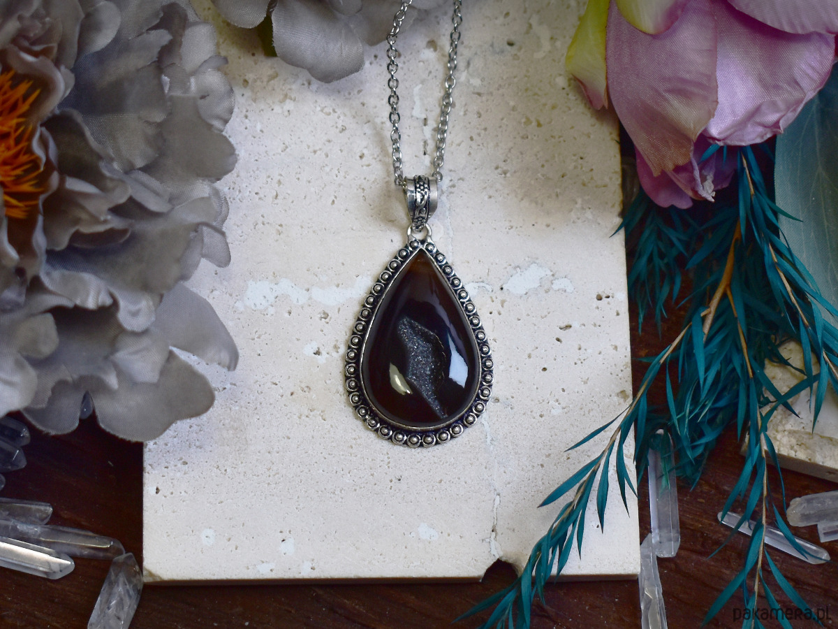 Miedziany wisiorek wykonany tradycyjnymi metodami rzemieślniczymi, ozdobiony **czarnym agatem z naturalną drużą**. Głęboka, ciemna barwa kamienia kontrastuje z delikatnie połyskującą strukturą kryształków, nadając biżuterii wyrazisty, a jednocześnie elegancki charakter. Naturalna druza podkreśla surowe piękno minerału i sprawia, że każdy egzemplarz jest niepowtarzalny. Prosta, stonowana oprawa pozwala skupić uwagę na kamieniu, zachowując ponadczasową formę. Czarny agat z druzą kojarzony jest z ochroną, stabilnością i ugruntowaniem, sprzyjając spokojowi i wewnętrznej równowadze. Połączenie surowej struktury kryształu z ciepłym odcieniem miedzi tworzy wisiorek o mocnym, lecz eleganckim wyrazie, idealny dla miłośników naturalnych minerałów i rękodzieła.