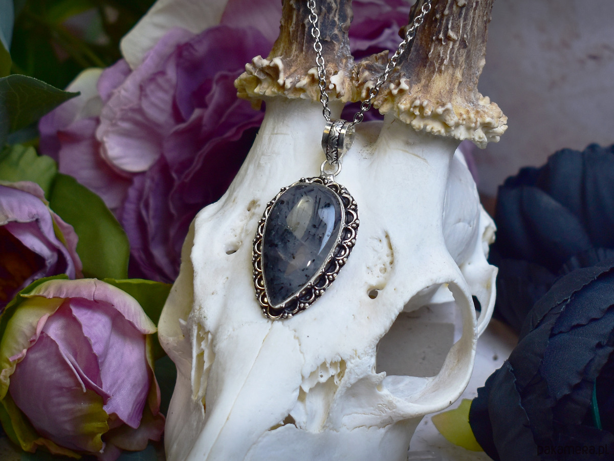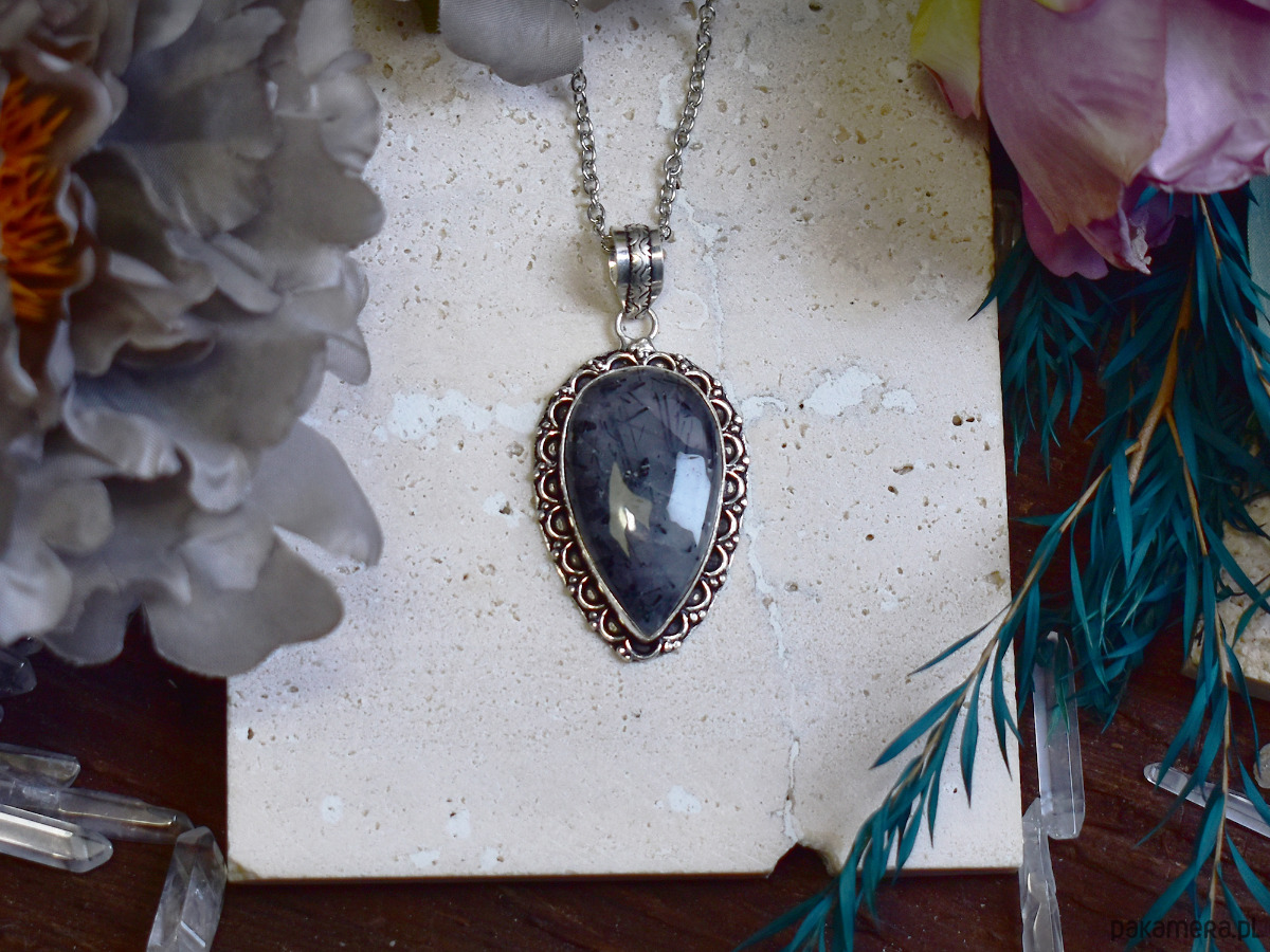 Miedziany wisiorek pokryty srebrem próby 925, wykonany tradycyjnymi metodami rzemieślniczymi, ozdobiony kwarcem z czarnym rutylem. Kamień zachwyca kontrastowym połączeniem przejrzystego kwarcu z naturalnymi, ciemnymi inkluzjami rutylu, tworząc efekt wyrazisty, a zarazem elegancki. Prosta, klasyczna forma podkreśla unikatowy rysunek minerału i nadaje biżuterii ponadczasowy charakter. Kwarc z czarnym rutylem kojarzony jest z ochroną, klarownością myśli i wzmocnieniem wewnętrznej siły. Połączenie chłodnego, srebrzystego wykończenia z wyrazistą strukturą kamienia tworzy harmonijny, szlachetny wisiorek dla osób ceniących minimalizm, rękodzieło i naturalne kamienie o symbolicznym znaczeniu.