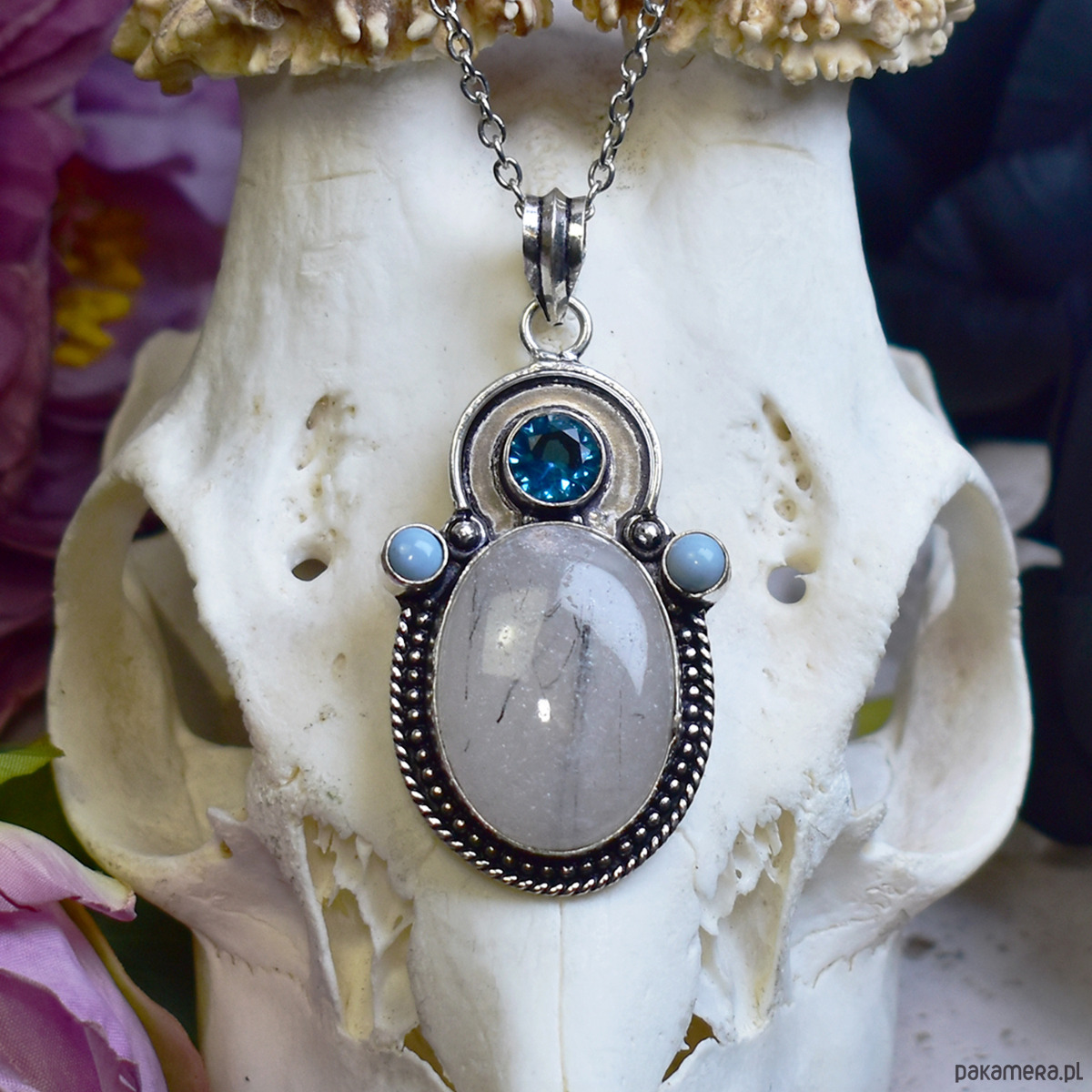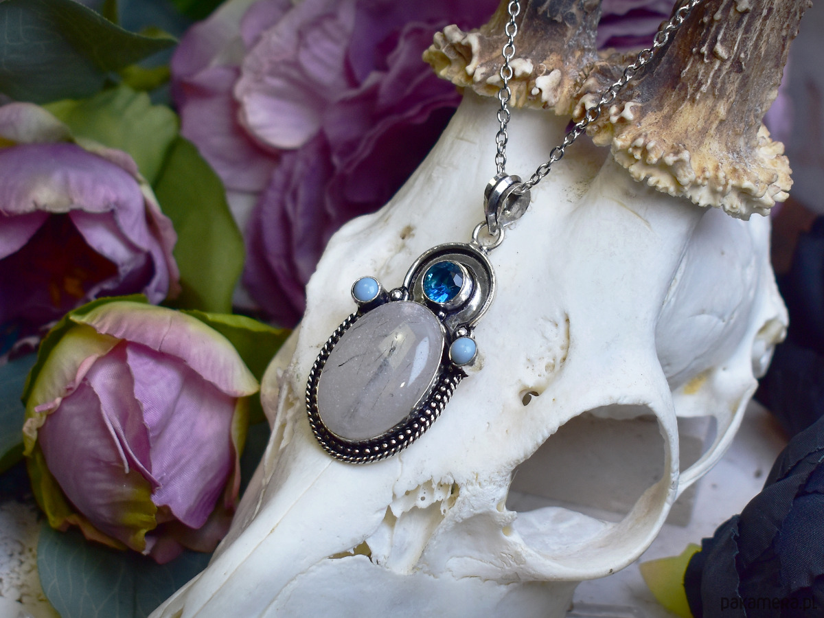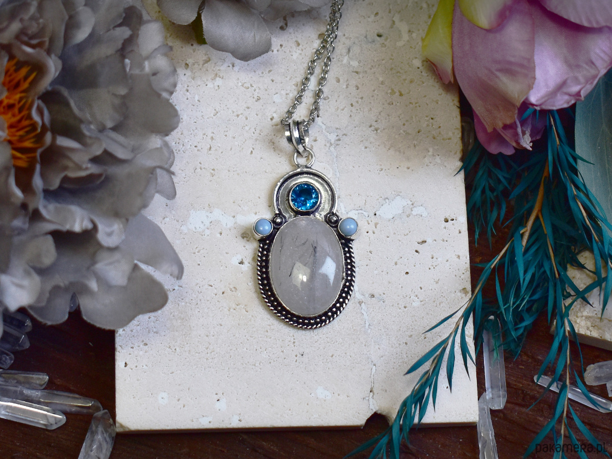 Wisiorek wykonany ze srebrnej blachy, ręcznie formowany tradycyjnymi metodami rzemieślniczymi, ozdobiony kwarcem z czarnym rutylem o jasnej, półprzezroczystej strukturze i delikatnych, naturalnych inkluzjach. Centralny kamień uzupełnia syntetyczny topaz w intensywnie niebieskim odcieniu, umieszczony w górnej części kompozycji, oraz drobne niebieskie opale, które wprowadzają subtelny, mleczny połysk i równoważą całość kolorystycznie. Starannie dopracowana oprawa z ozdobnym rantem podkreśla elegancki, a jednocześnie lekko artystyczny charakter wisiorka. Zestawienie chłodnych tonów kamieni tworzy harmonijną, spokojną kompozycję o wyrafinowanym wyglądzie. Kwarc z rutylem kojarzony jest z klarownością i koncentracją, a niebieskie akcenty dodają biżuterii lekkości i świeżości. To wisiorek dla osób ceniących rękodzieło, naturalne kamienie i elegancką biżuterię z subtelnym detalem.