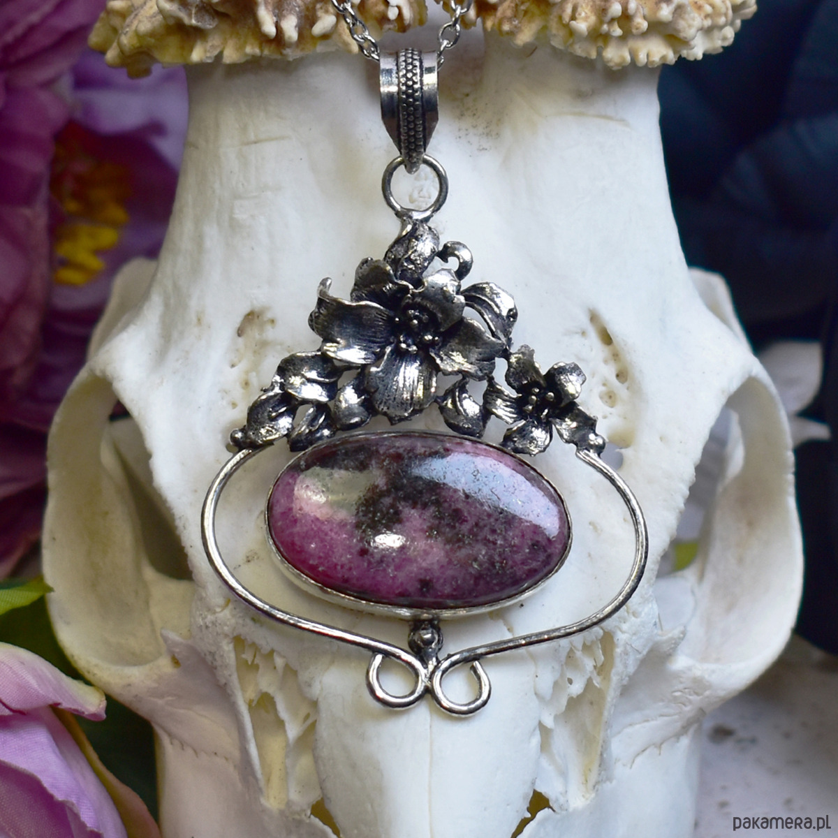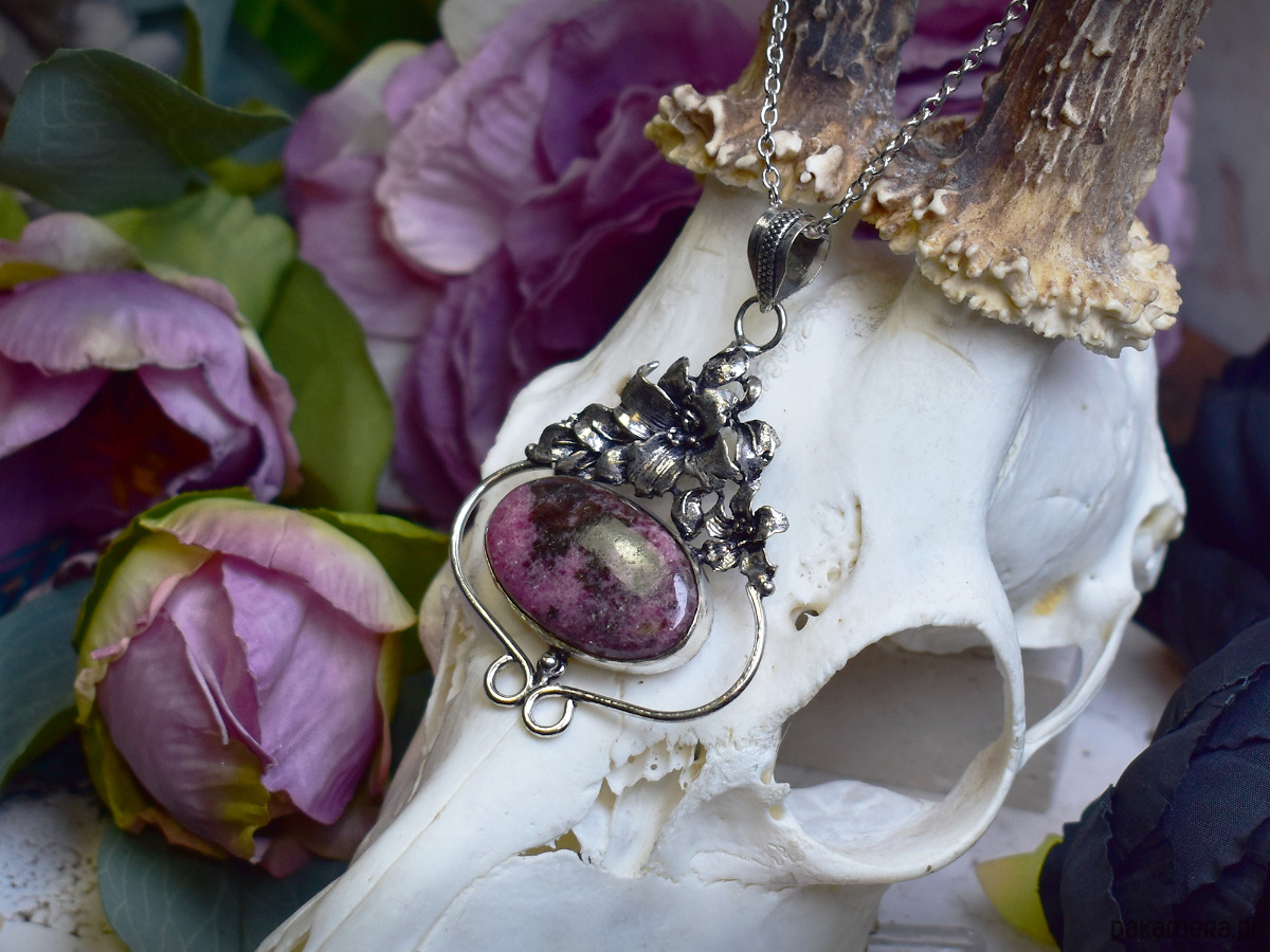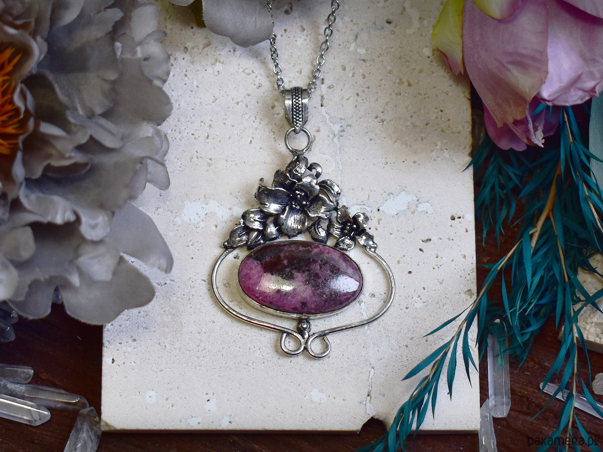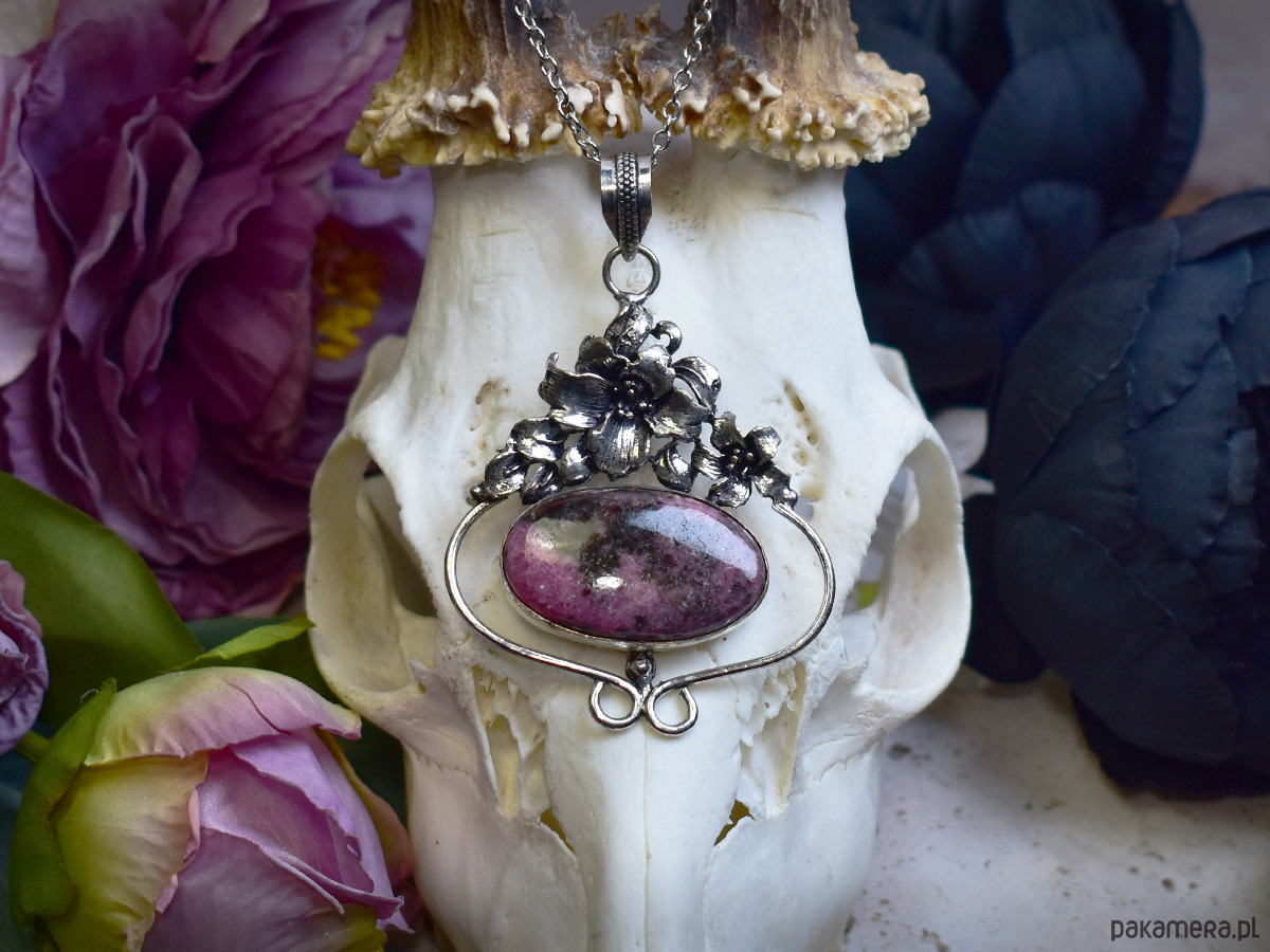 Miedziany wisiorek pokryty srebrem, wykonany tradycyjnymi metodami rzemieślniczymi, ozdobiony rodonitem o intensywnej, różowej barwie z naturalnymi, ciemniejszymi inkluzjami. Centralny kamień stanowi główny punkt kompozycji, a jego miękka kolorystyka kontrastuje z chłodnym połyskiem srebrzystej powierzchni. Oprawę uzupełniają bogato modelowane motywy kwiatowe, które nadają całości dekoracyjny, lekko secesyjny charakter. Płynna linia dolnej części wisiorka wprowadza lekkość i równowagę, podkreślając artystyczny wyraz biżuterii.