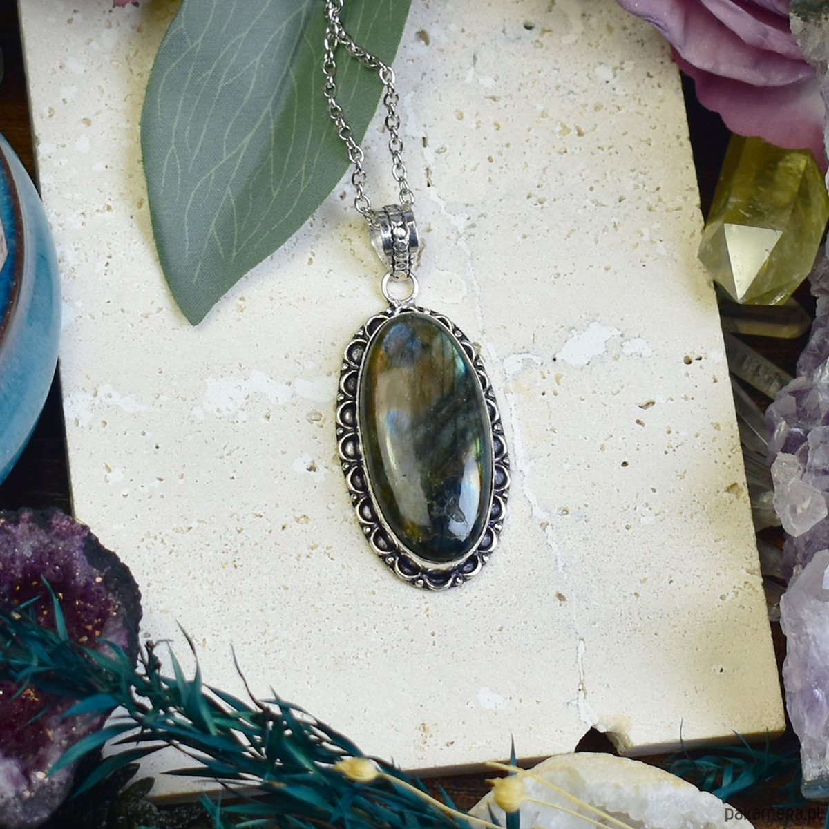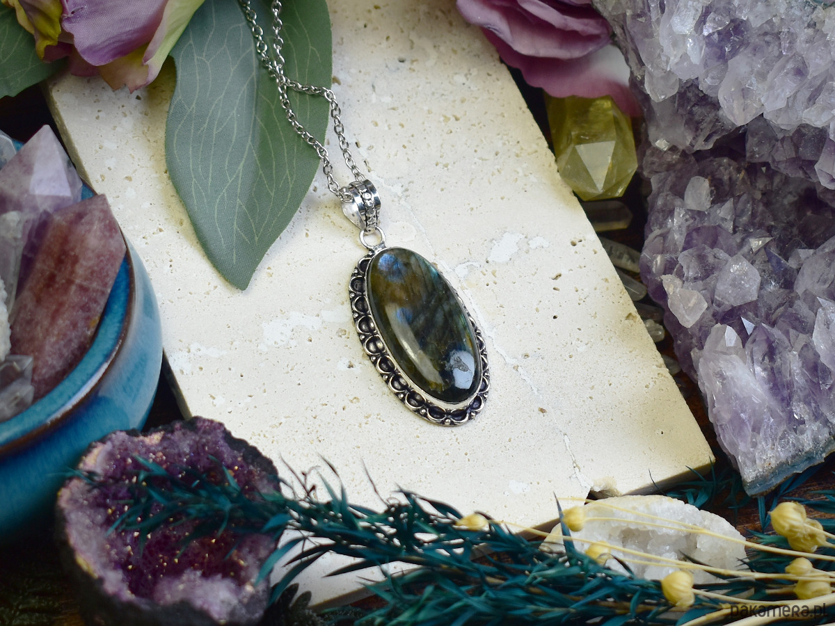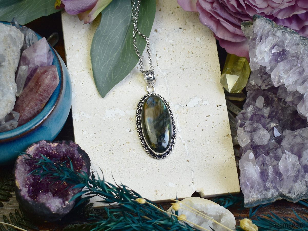 Ręcznie wykonany wisiorek z labradorytem, stworzony z miedzi, a następnie posrebrzany tradycyjnymi technikami jubilerskimi. Kamień labradoryt, o unikalnym, zmieniającym się w świetle odcieniu, symbolizuje magię i intuicję. Jego tajemniczy blask doskonale komponuje się z elegancką, metaliczną oprawą. Wisiorek jest wyjątkową ozdobą, która przyciąga wzrok i dodaje charakteru każdej stylizacji. Idealny wybór dla osób ceniących niepowtarzalne, ręcznie wykonane dzieła.