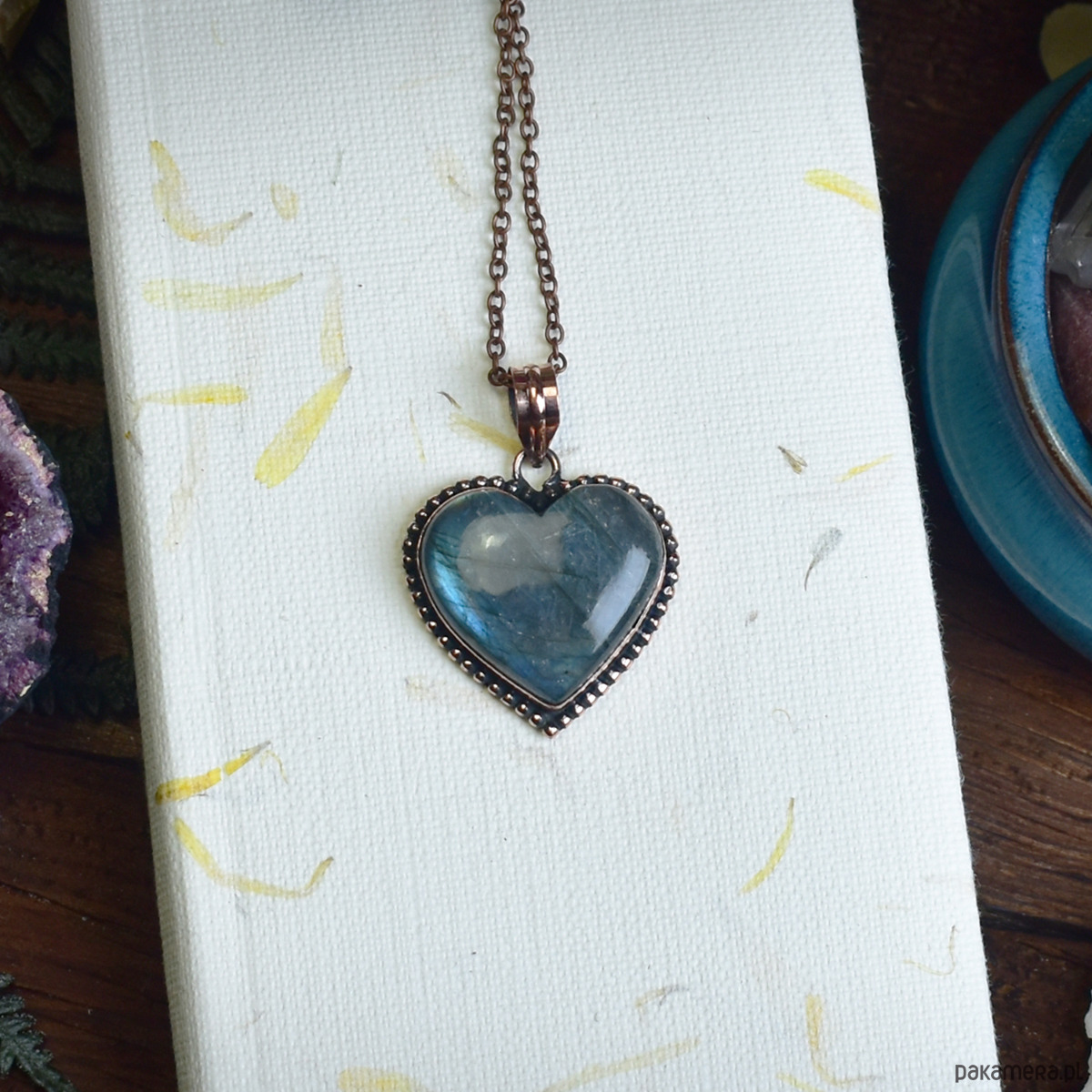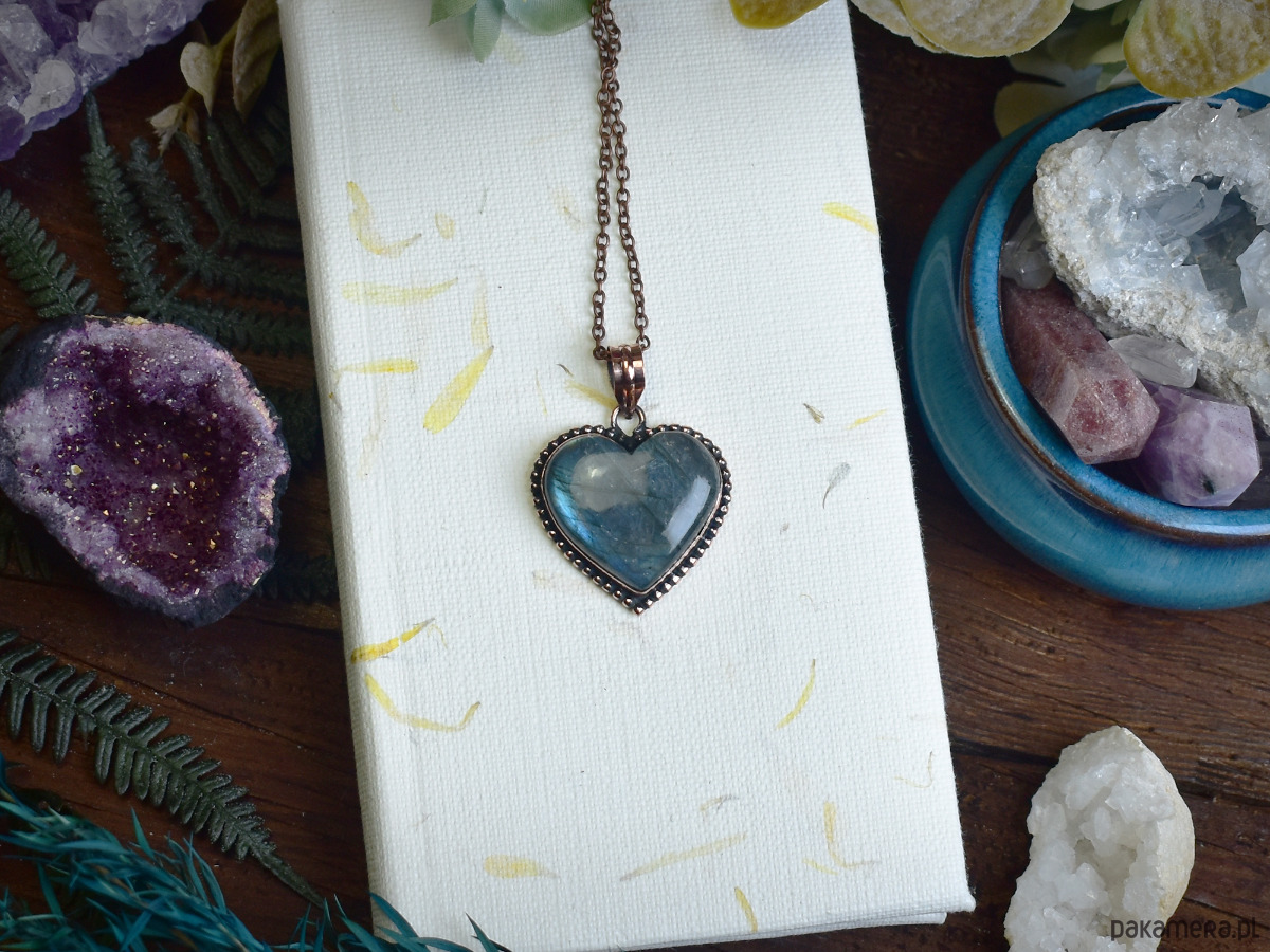 Miedziany ozdobny wisiorek z labradorytem w kształcie serca