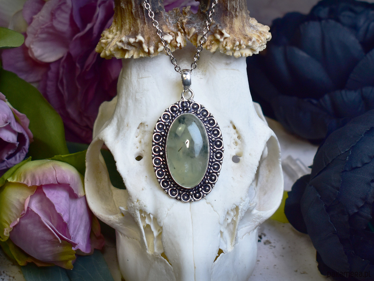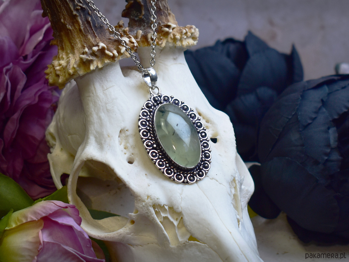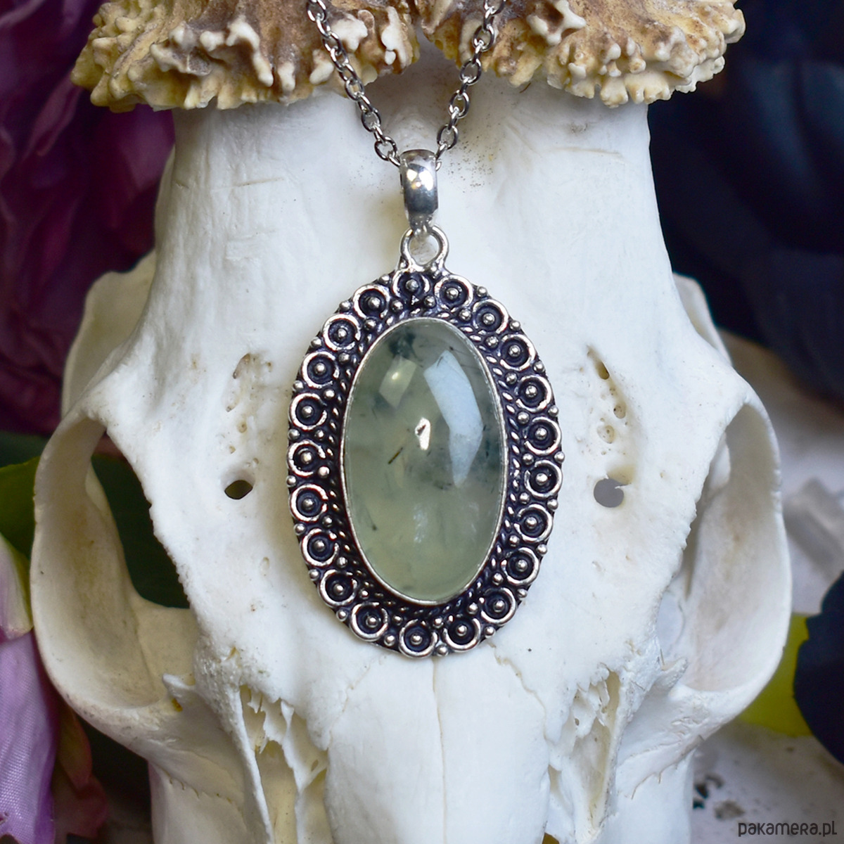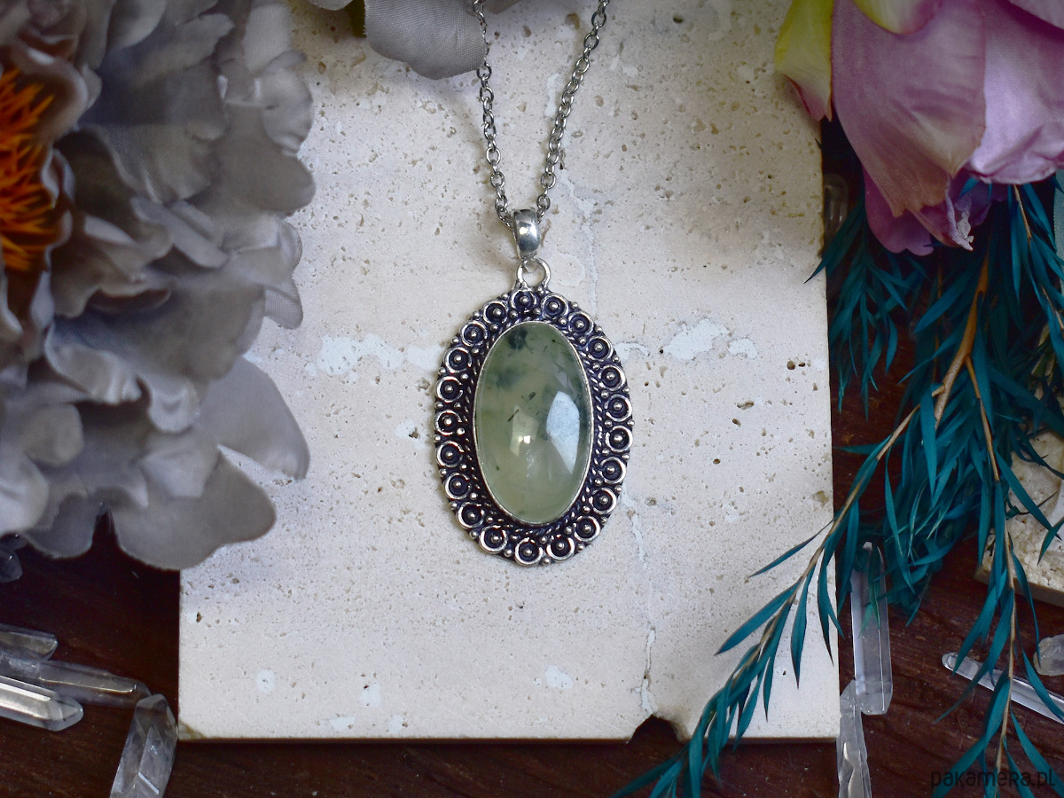 Miedziany wisiorek pokryty srebrem próby 925, wykonany tradycyjnymi metodami rzemieślniczymi, ozdobiony prehnitem – kamieniem o delikatnej, zielonej barwie z subtelnym, naturalnym połyskiem. Prosta, minimalistyczna oprawa pozwala w pełni podkreślić naturalne piękno kamienia, tworząc elegancki i ponadczasowy projekt. Prehnit jest kamieniem harmonii, wspierającym spokój umysłu, równowagę emocjonalną i wewnętrzną jasność. Połączenie stonowanego odcienia kamienia z srebrnym wykończeniem nadaje wisiorkowi subtelny, klasyczny charakter. To idealna propozycja dla osób ceniących rękodzieło, minimalistyczną biżuterię i naturalne kamienie szlachetne.
