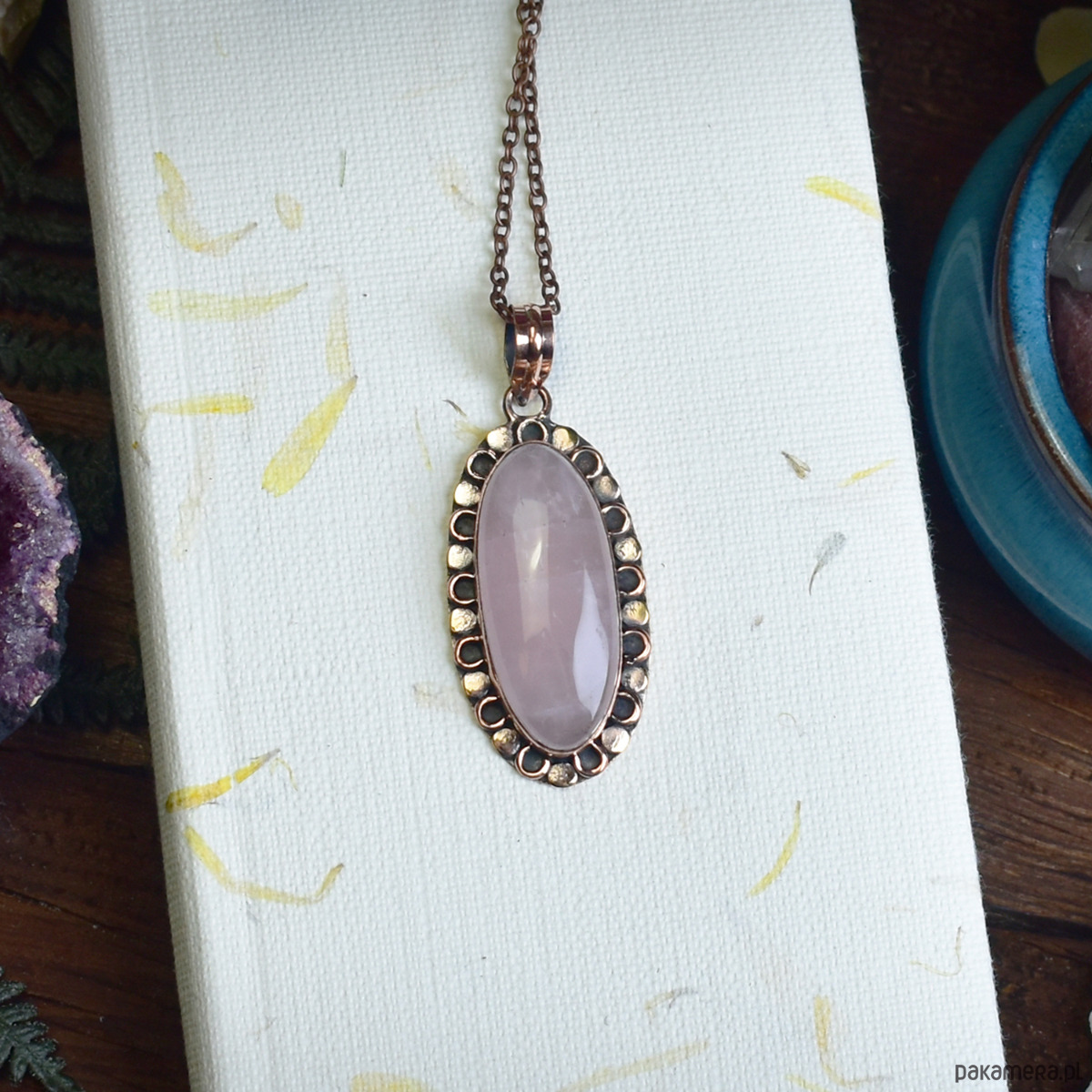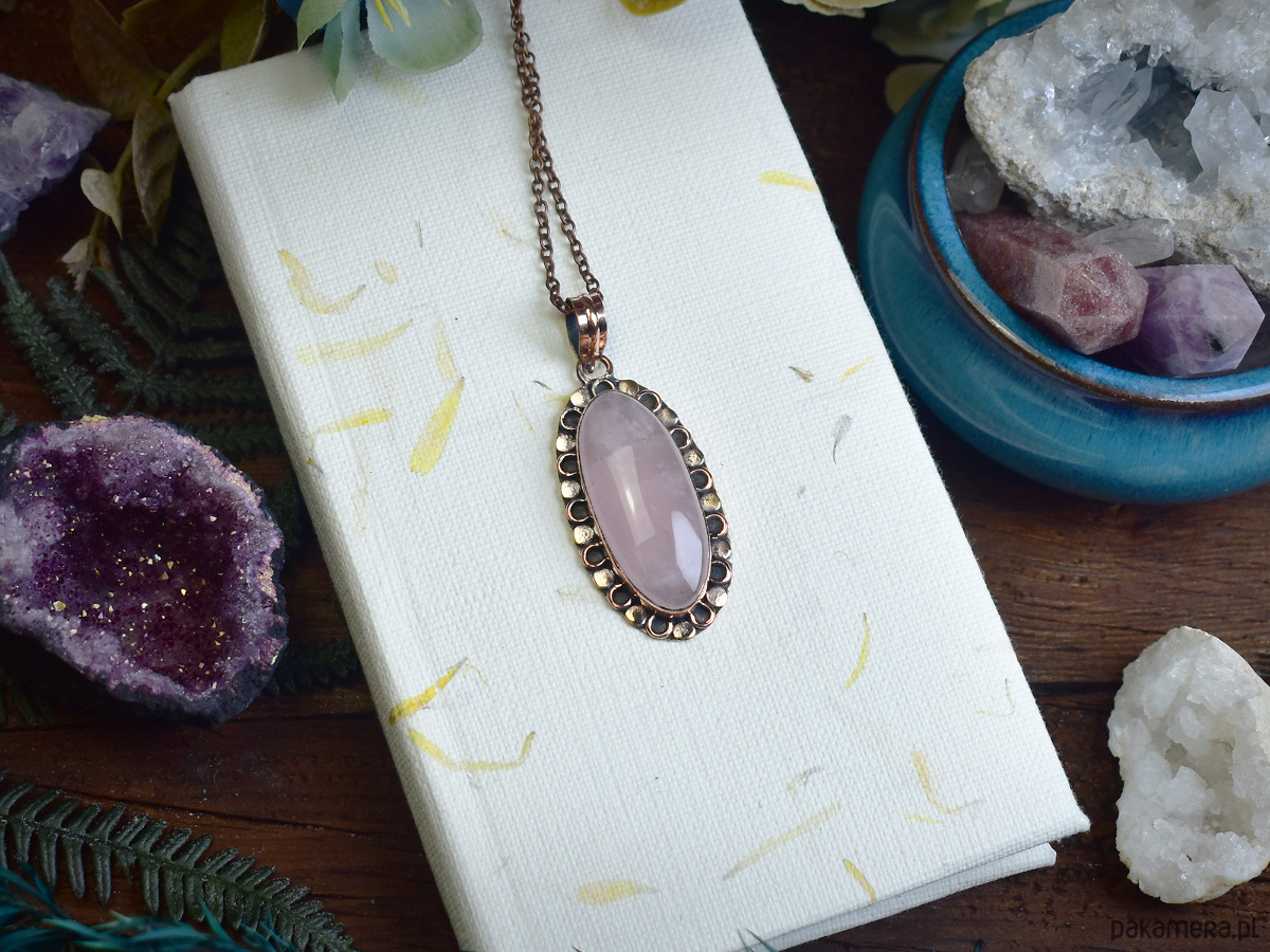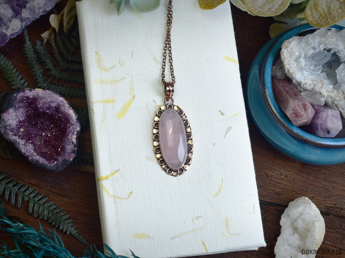 Miedziany wisiorek z różowym kwarcem to połączenie subtelnej elegancji i naturalnego piękna. Kamień o delikatnym, różowym odcieniu od wieków uznawany jest za symbol miłości, harmonii i uzdrowienia. Jego łagodna energia pomaga w przywracaniu emocjonalnej równowagi, łagodzi stres i wspiera procesy uzdrawiające. Oprawa wykonana tradycyjnymi metodami jubilerskimi podkreśla naturalne piękno kamienia, tworząc unikalną ozdobę, która jest zarówno elegancka, jak i pełna pozytywnej energii.