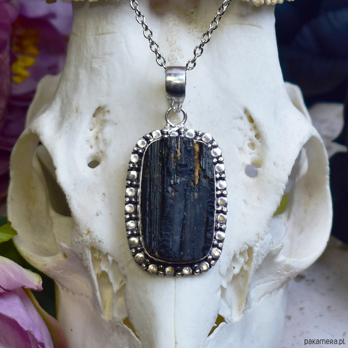 Miedziany wisiorek pokryty srebrem próby 925, wykonany tradycyjnymi metodami rzemieślniczymi, ozdobiony turmalinem o surowym, naturalnym charakterze. Kamień przyciąga uwagę swoją nieregularną strukturą oraz głęboką, intensywną barwą, dzięki czemu każdy egzemplarz jest unikatowy. Prosta, klasyczna oprawa podkreśla autentyczne piękno minerału, nadając biżuterii wyważony i ponadczasowy wygląd. Turmalin kojarzony jest z ochroną, stabilnością i równowagą energetyczną, wzmacniając poczucie bezpieczeństwa i wewnętrznej siły. Połączenie surowej formy kamienia z chłodnym, srebrzystym wykończeniem miedzi tworzy elegancki wisiorek o subtelnie mistycznym charakterze, idealny dla osób ceniących minimalizm i naturalne kamienie.