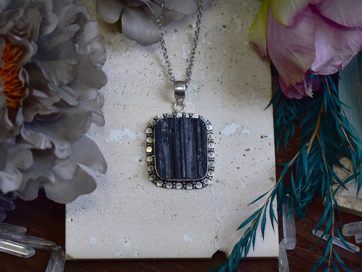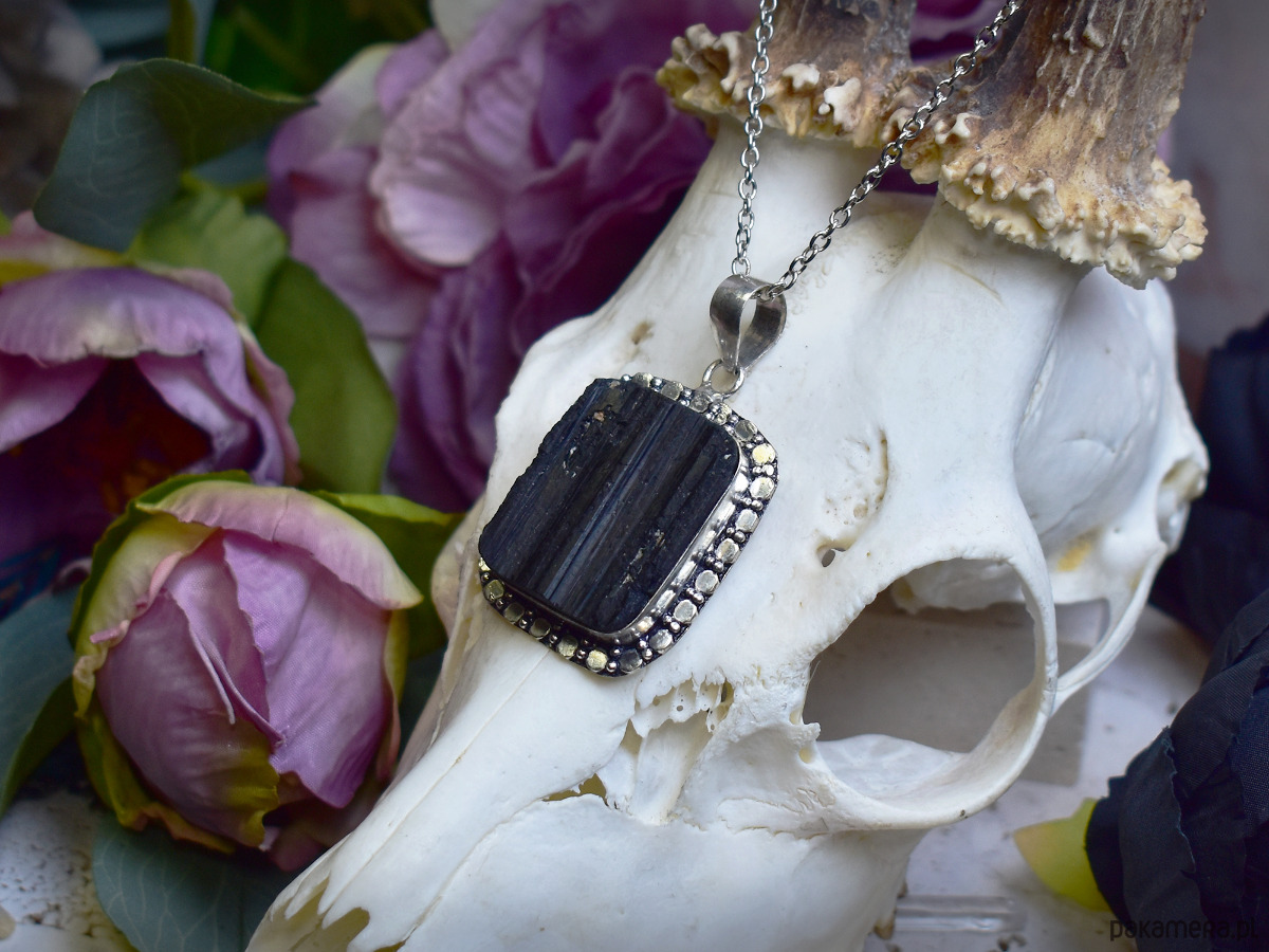 Miedziany wisiorek pokryty srebrem próby 925, wykonany tradycyjnymi metodami rzemieślniczymi, ozdobiony turmalinem o surowym, naturalnym charakterze. Kamień przyciąga uwagę swoją nieregularną strukturą oraz głęboką, intensywną barwą, dzięki czemu każdy egzemplarz jest unikatowy. Prosta, klasyczna oprawa podkreśla autentyczne piękno minerału, nadając biżuterii wyważony i ponadczasowy wygląd. Turmalin kojarzony jest z ochroną, stabilnością i równowagą energetyczną, wzmacniając poczucie bezpieczeństwa i wewnętrznej siły. Połączenie surowej formy kamienia z chłodnym, srebrzystym wykończeniem miedzi tworzy elegancki wisiorek o subtelnie mistycznym charakterze, idealny dla osób ceniących minimalizm i naturalne kamienie.