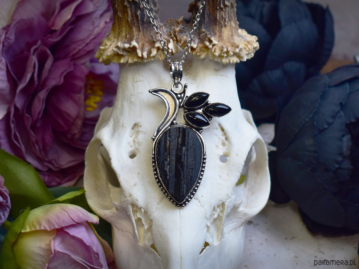 Miedziany wisiorek pokryty srebrem, wykonany tradycyjnymi metodami rzemieślniczymi, ozdobiony surowym turmalinem o wyraźnej, naturalnej strukturze oraz trzema onyksami o głębokiej, czarnej barwie. Centralny kamień zachowuje pierwotny charakter minerału, nadając biżuterii surowy i organiczny wyraz. Gładkie onyksy tworzą wyraźny kontrast z nieregularną powierzchnią turmalinu i porządkują kompozycję, dodając jej elegancji i równowagi. Ozdobna, ręcznie formowana oprawa łączy dynamiczne linie z delikatnymi detalami, tworząc harmonijną całość inspirowaną naturą. Turmalin kojarzony jest z ochroną i ugruntowaniem, a onyks z siłą wewnętrzną i stabilnością, dzięki czemu wisiorek łączy wyrazistą estetykę z symbolicznym znaczeniem. To propozycja dla osób ceniących rękodzieło, surowe kamienie i biżuterię o zdecydowanym, a jednocześnie wyrafinowanym charakterze.