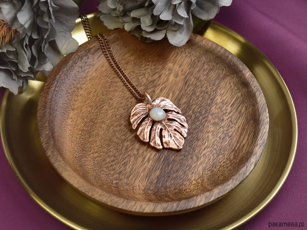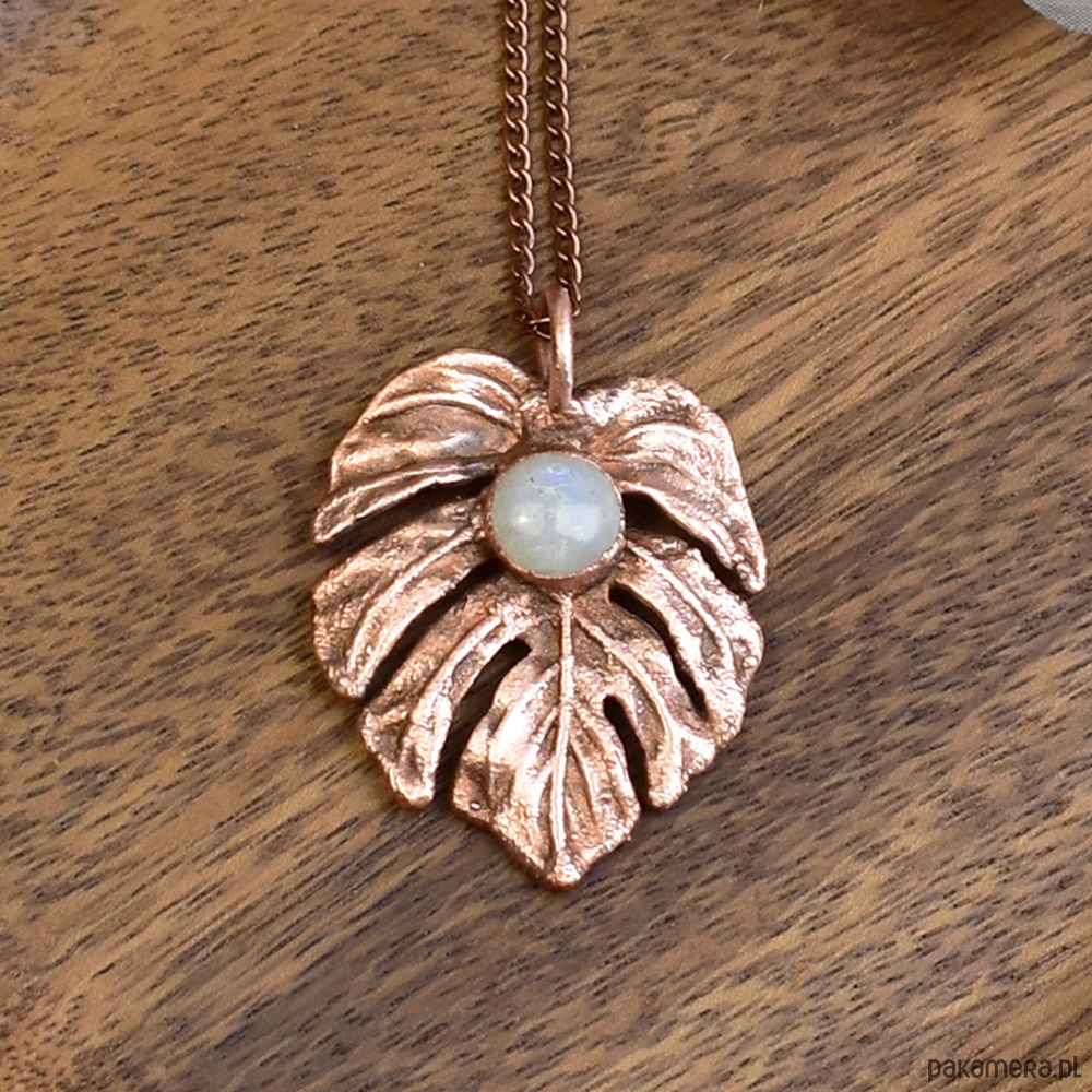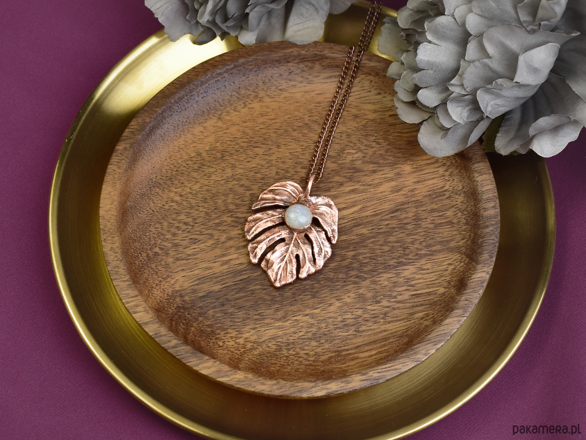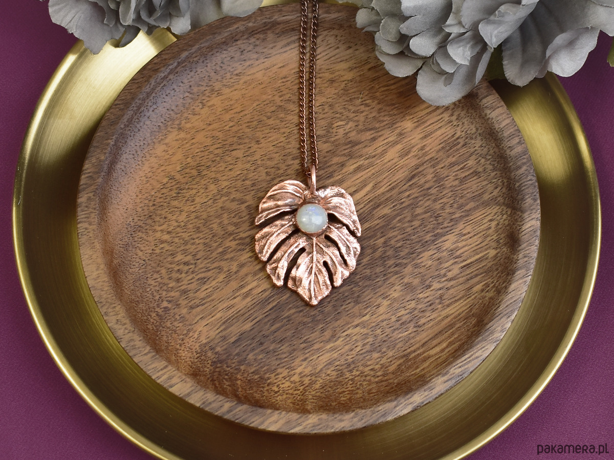 Ręcznie wykonany wisior w kształcie liścia monstery deliciosa z kamieniem księżycowym. Oprawa wykonana z miedzi metodą elektroformowania, patynowana.