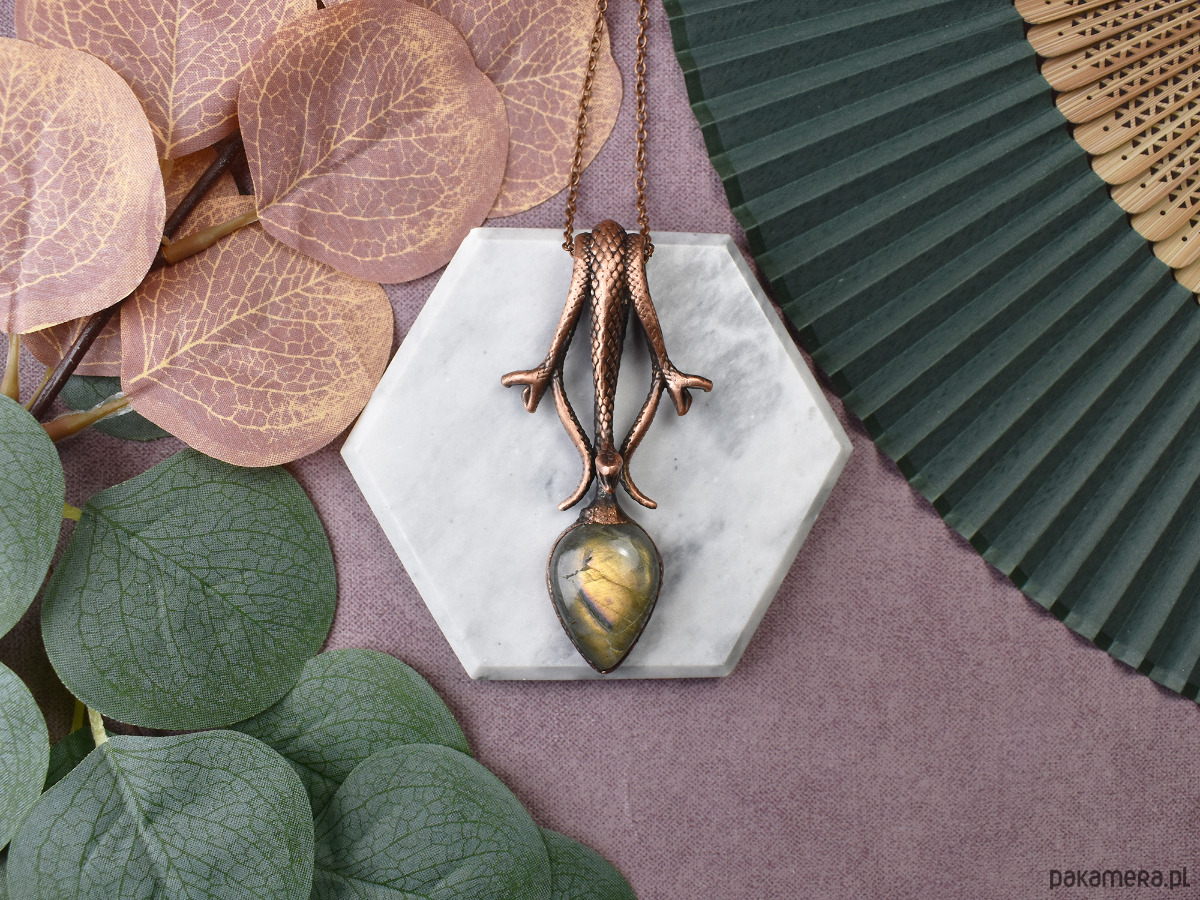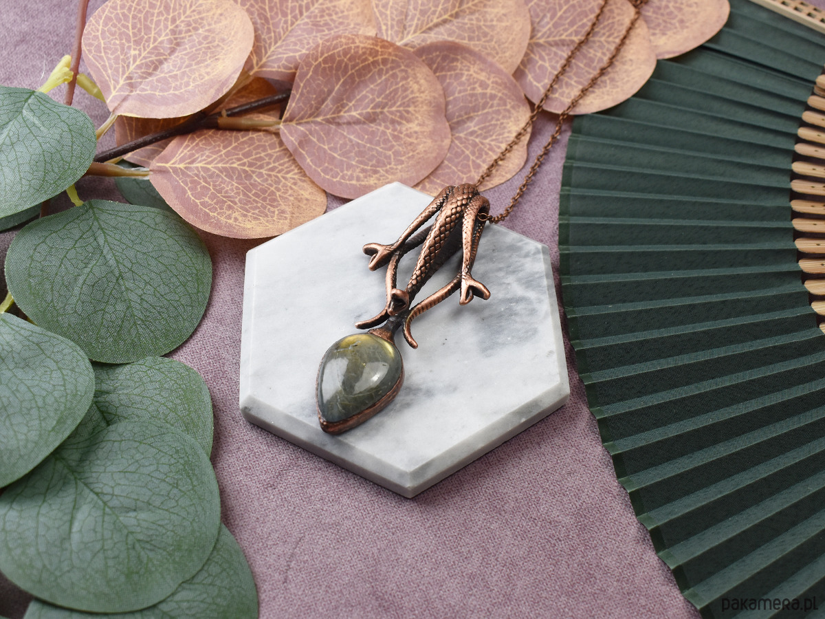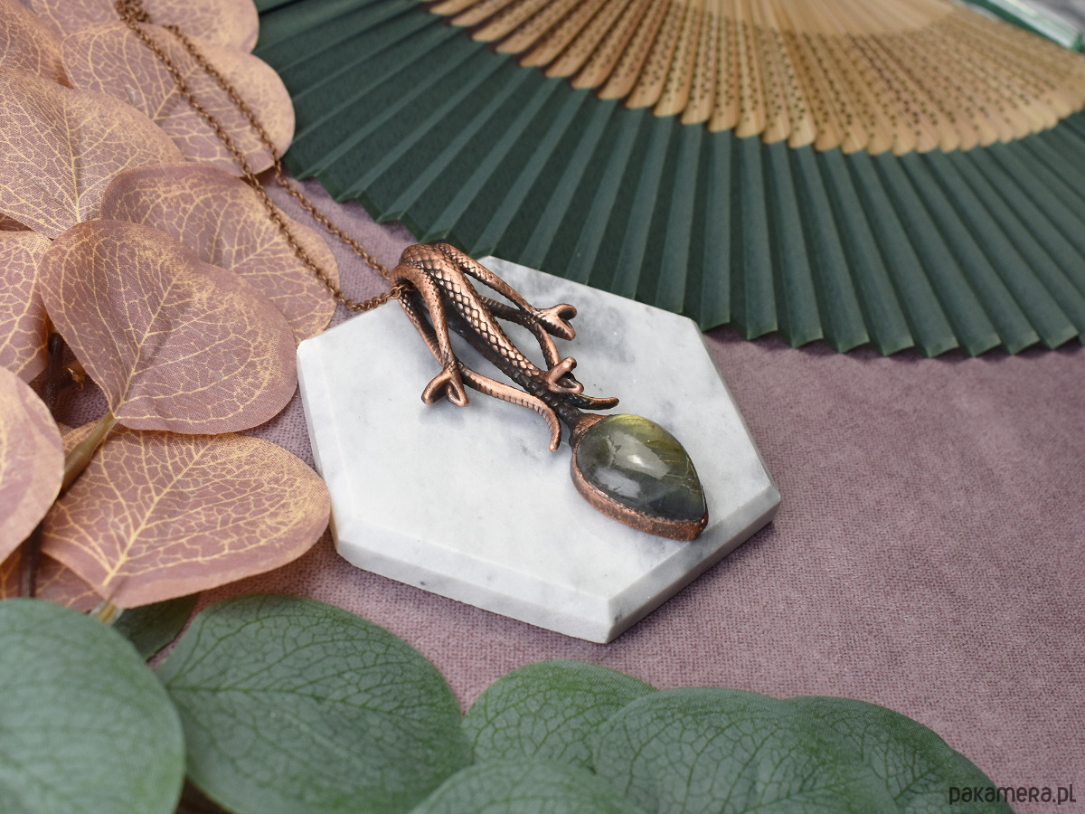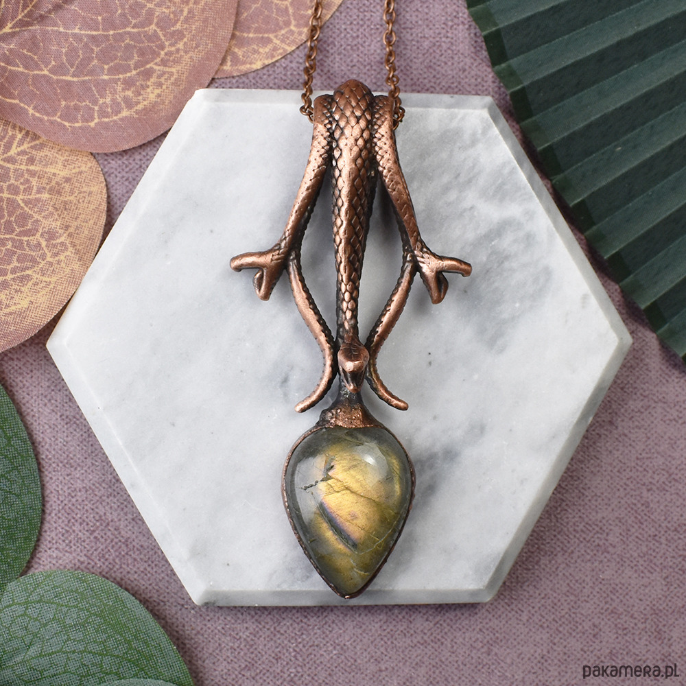Ręcznie wykonany wisior z labradorytem ozdobiony wężami przypominającymi głowę Hydry. Oprawa wykonana z miedzi metodą elektroformowania, patynowana.